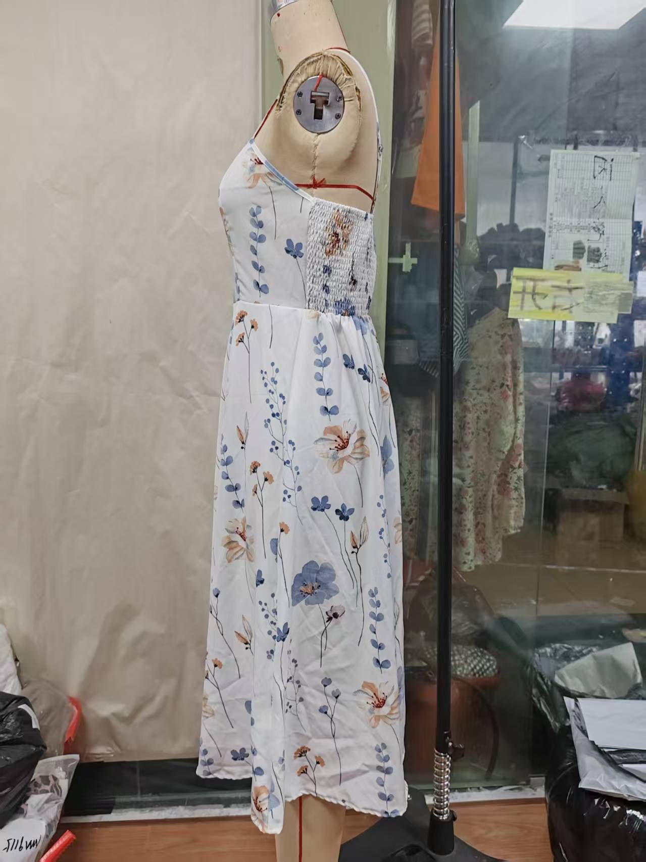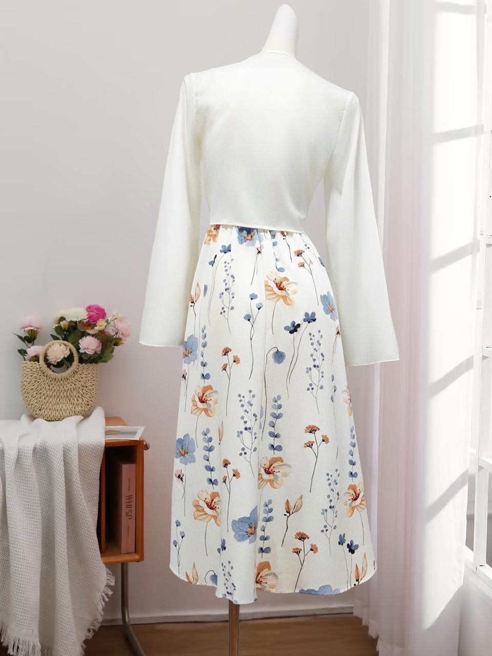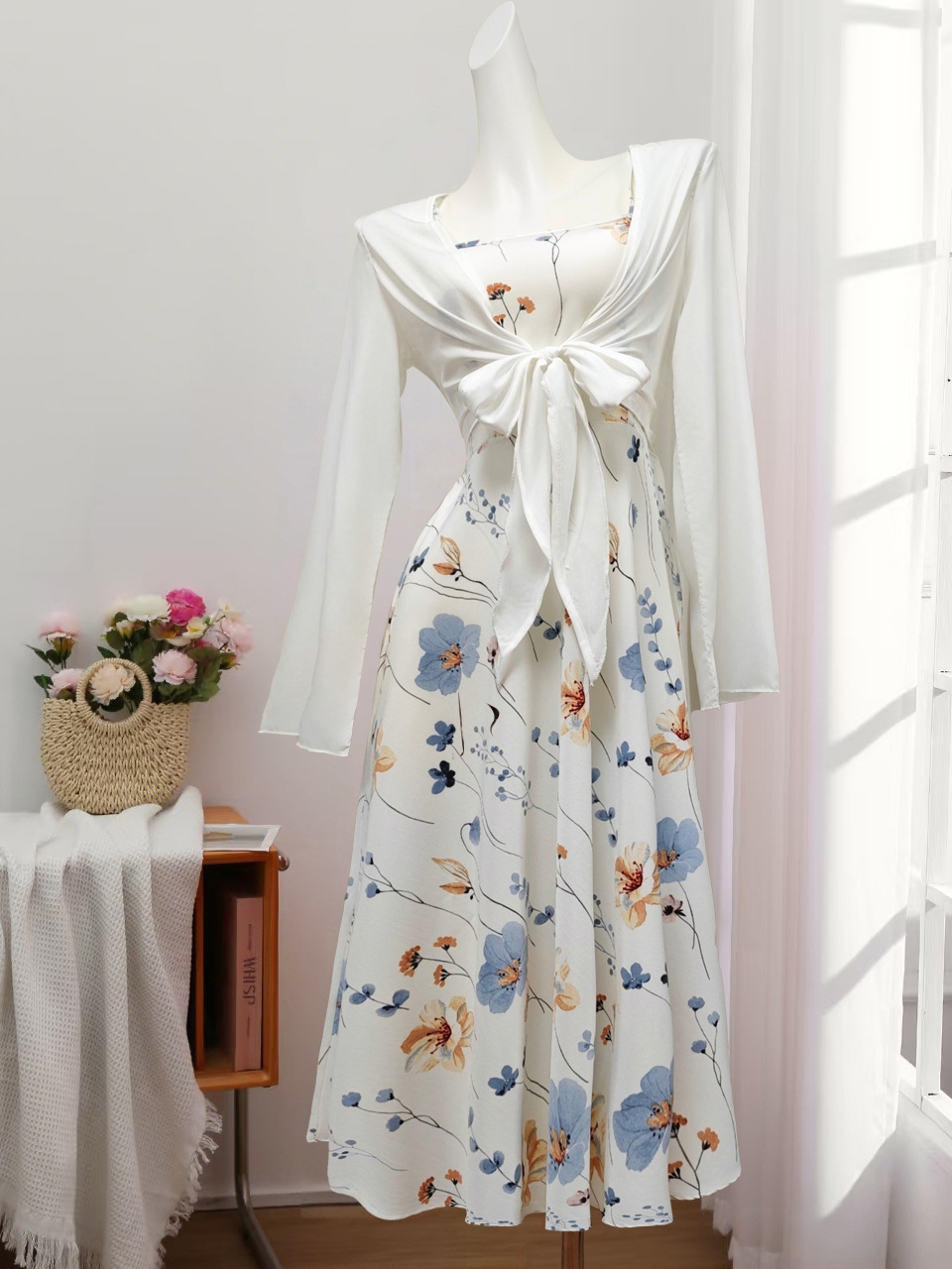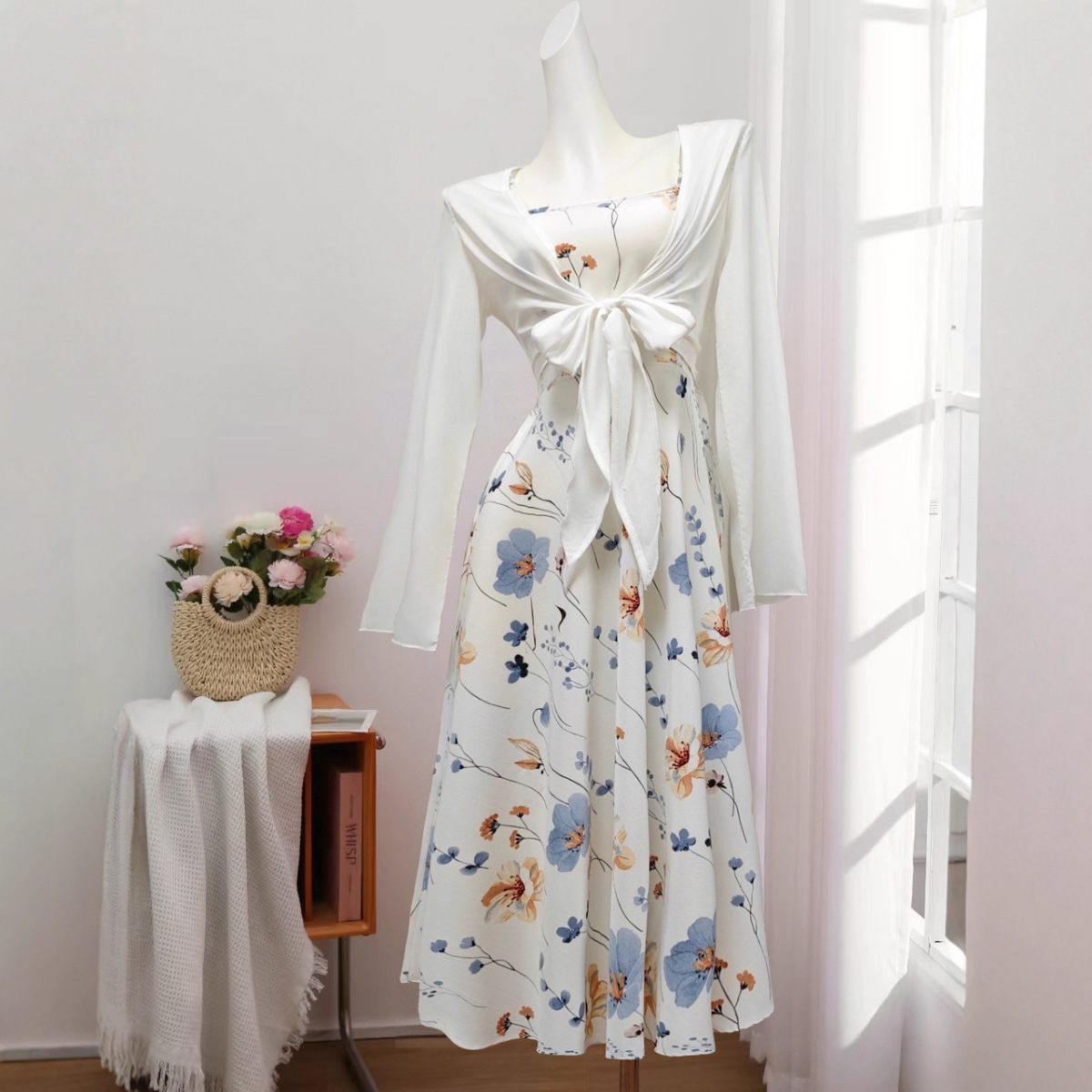 Elegant Floral Spaghetti Strap Dress Slim White Floral Pure Print Set
