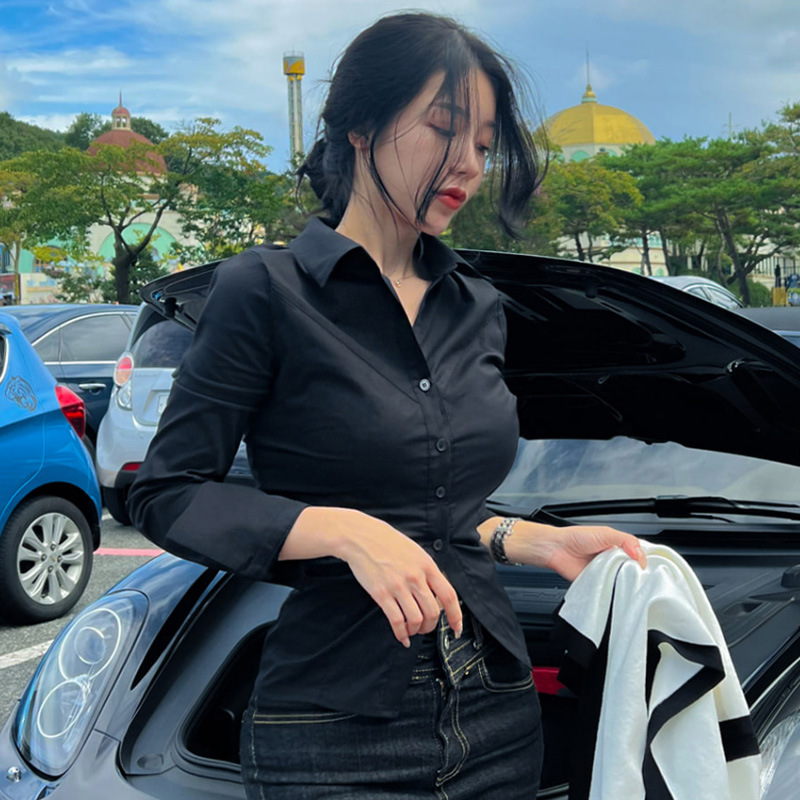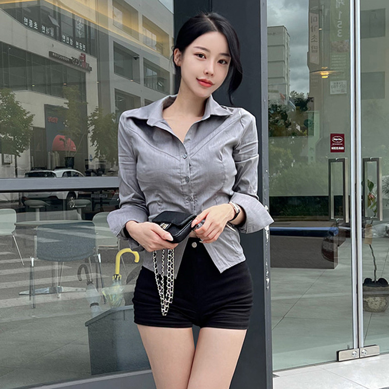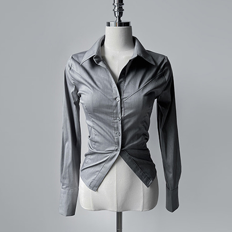 Elegant Gray Design Shirt With Long Sleeves A Turn-down Collar And A Side Slit