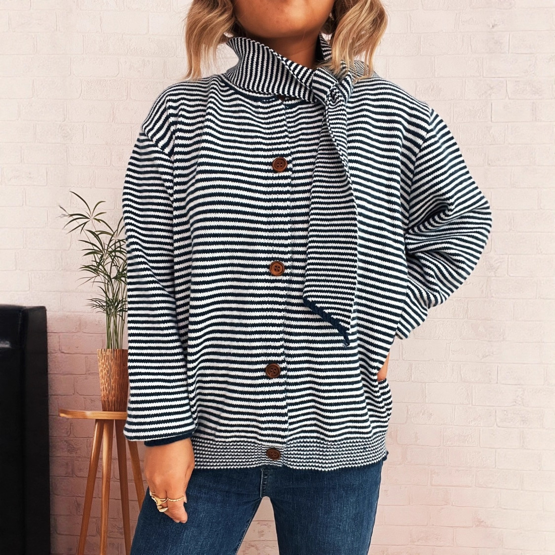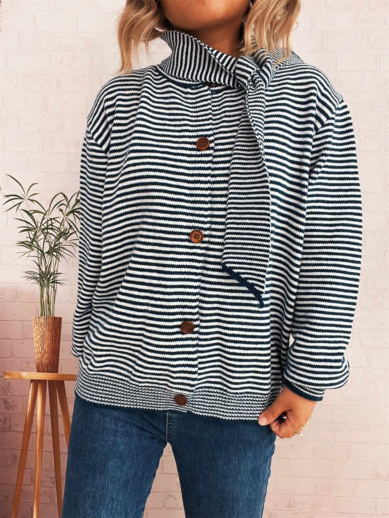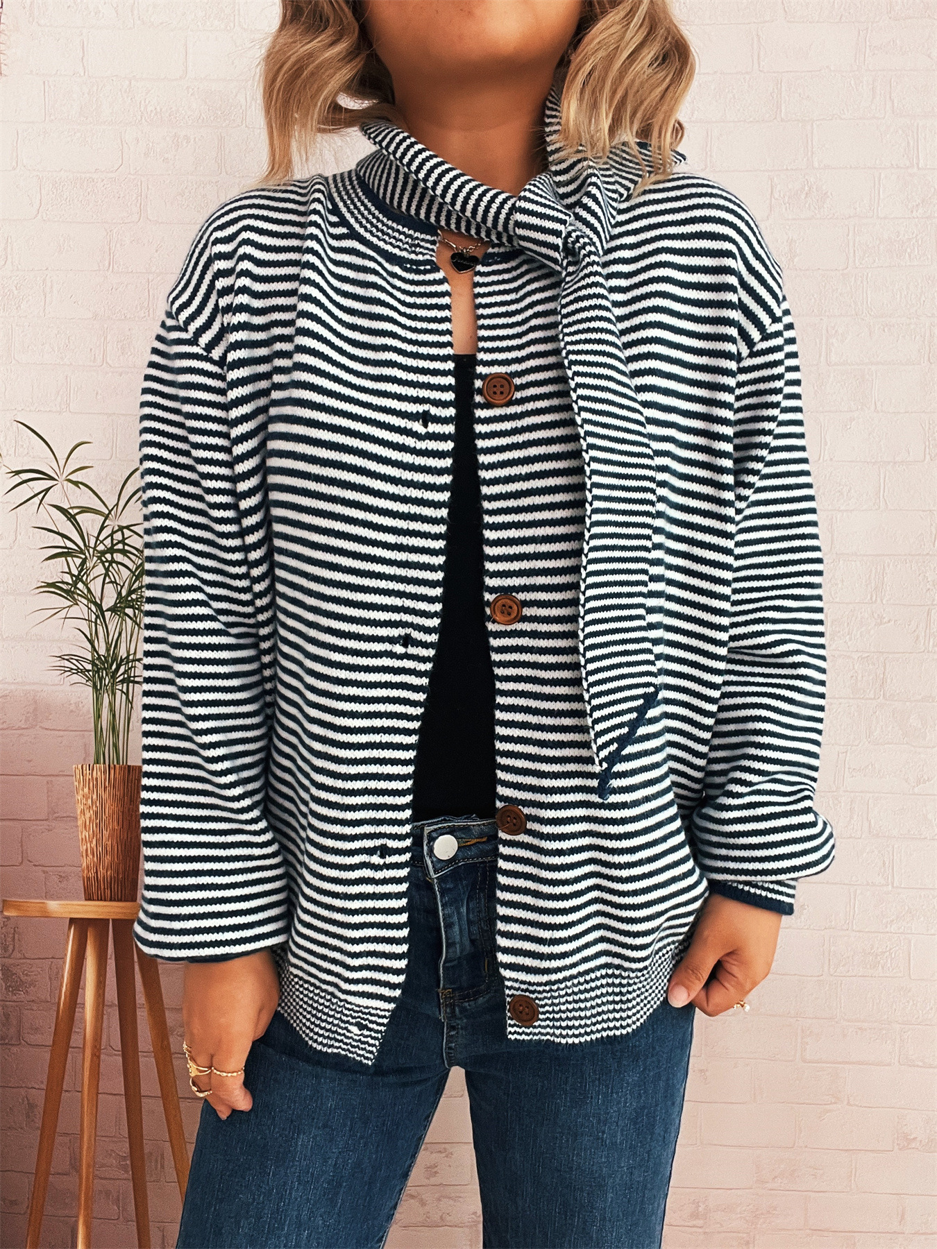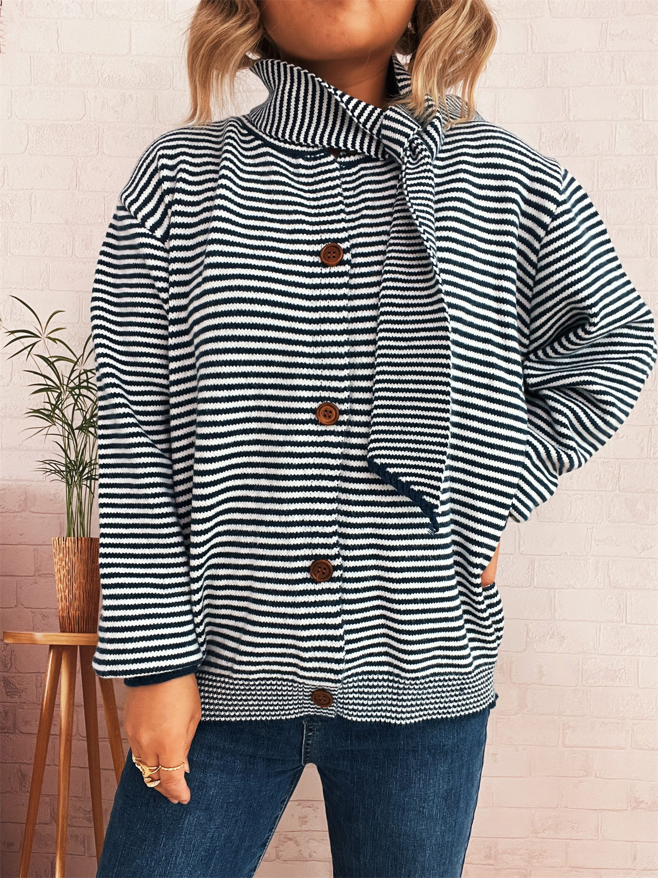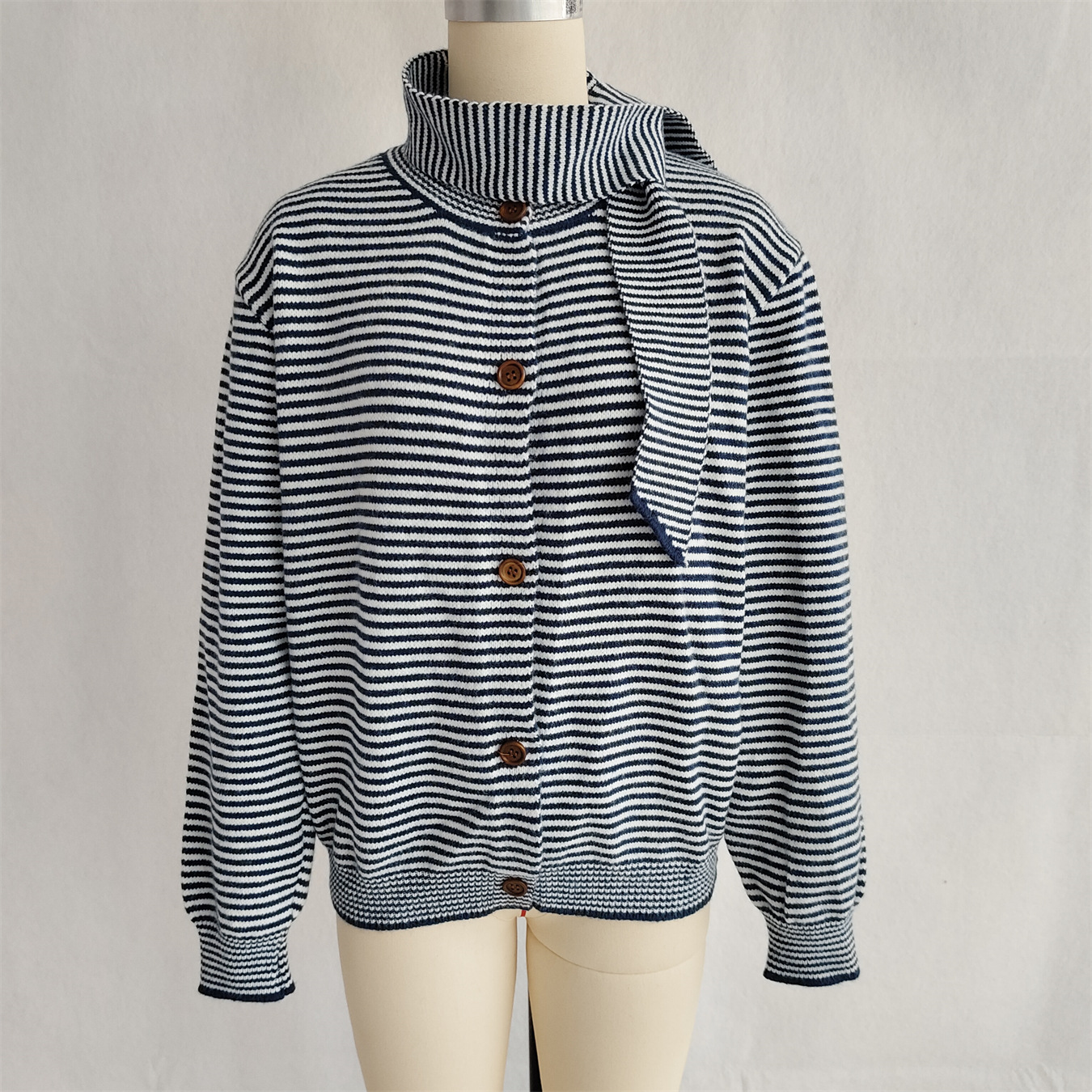 Elegant Retro Pinstripe Single-breasted Scarf Knitted Cardigan Sweater