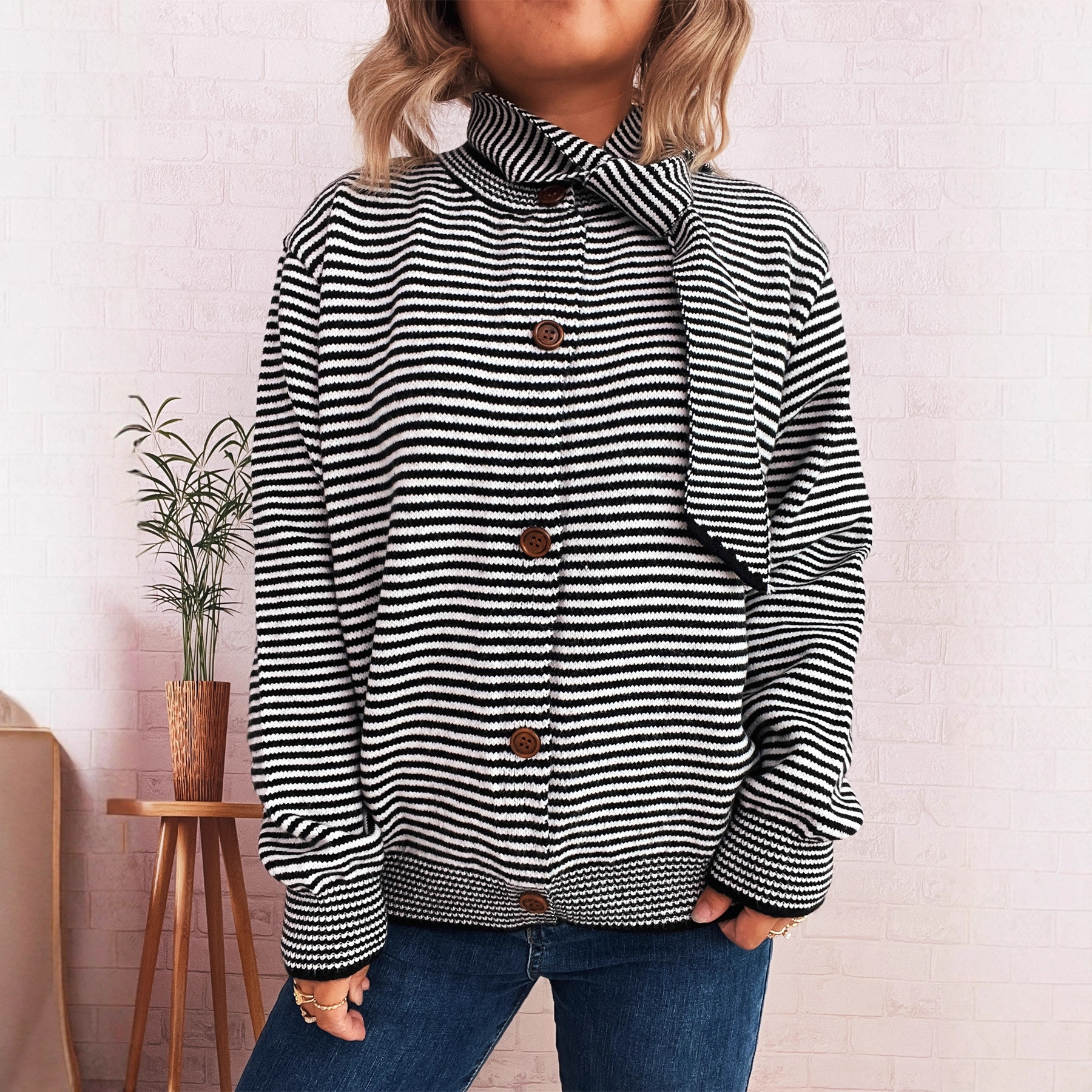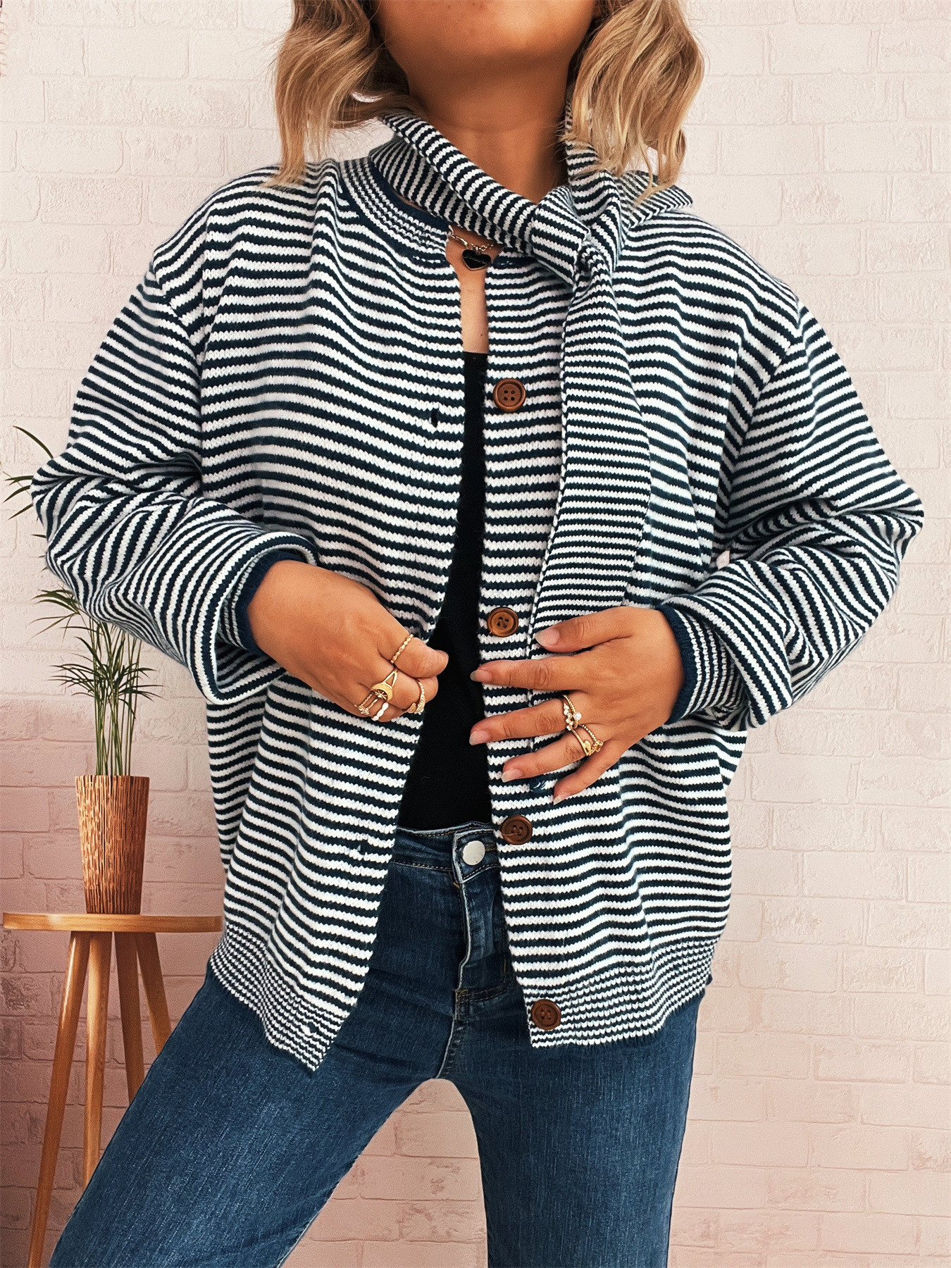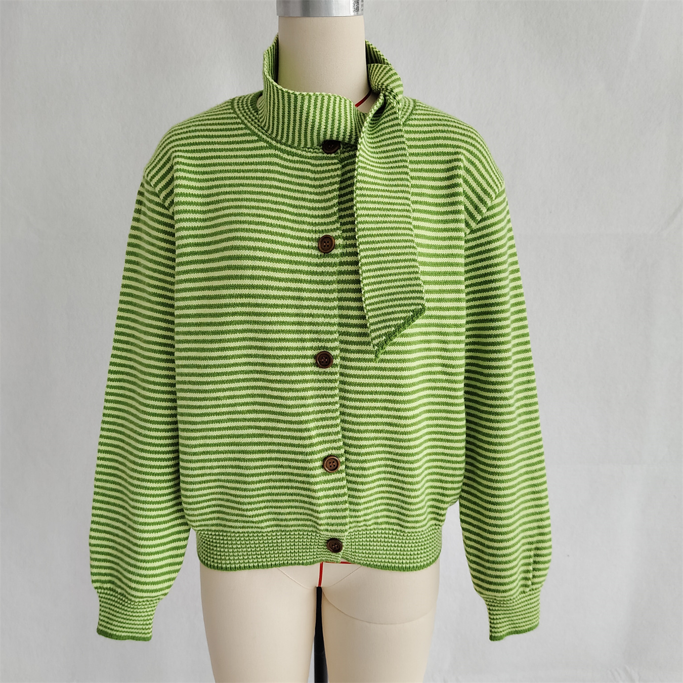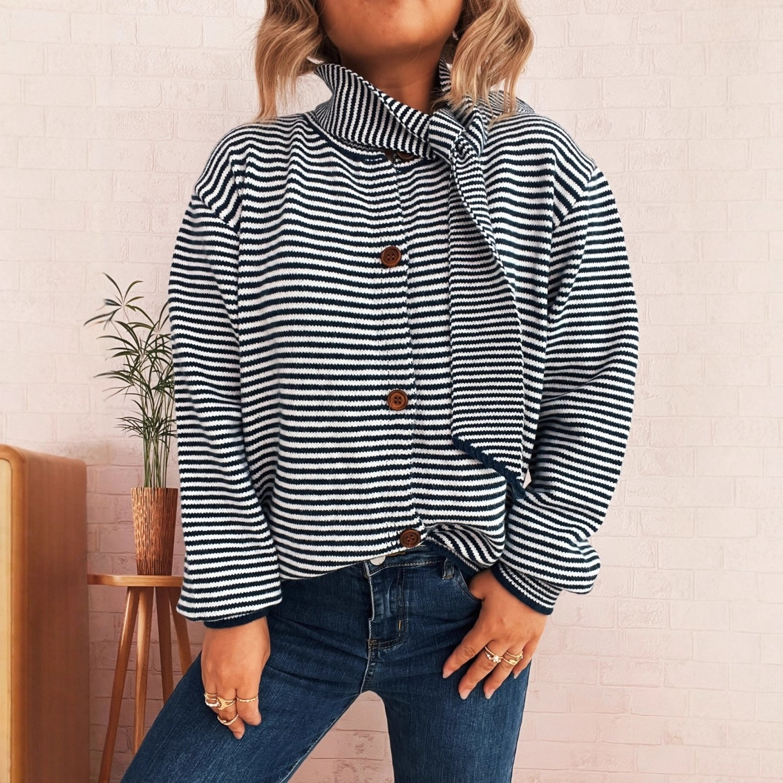 Elegant Retro Pinstripe Single-breasted Scarf Knitted Cardigan Sweater