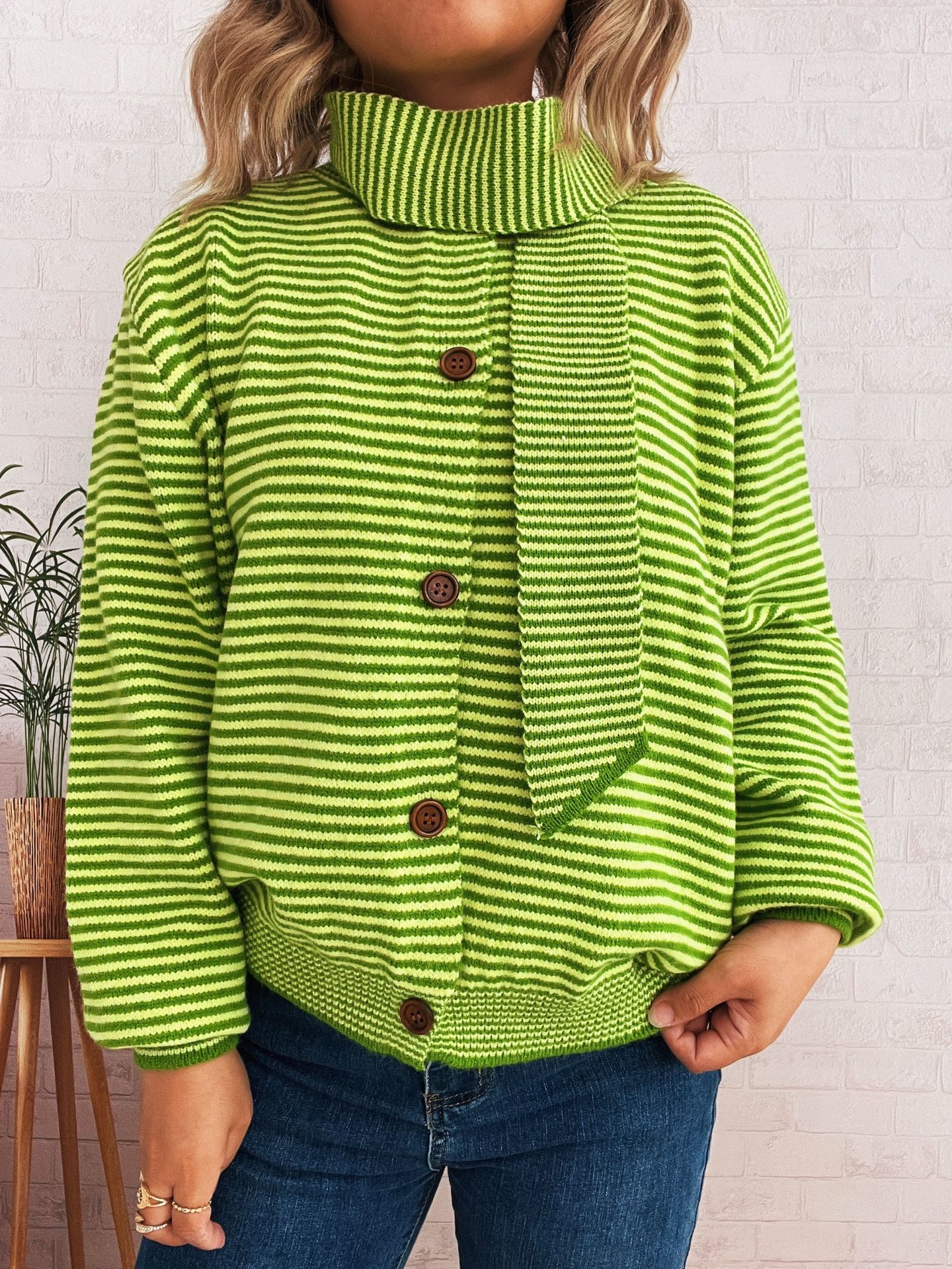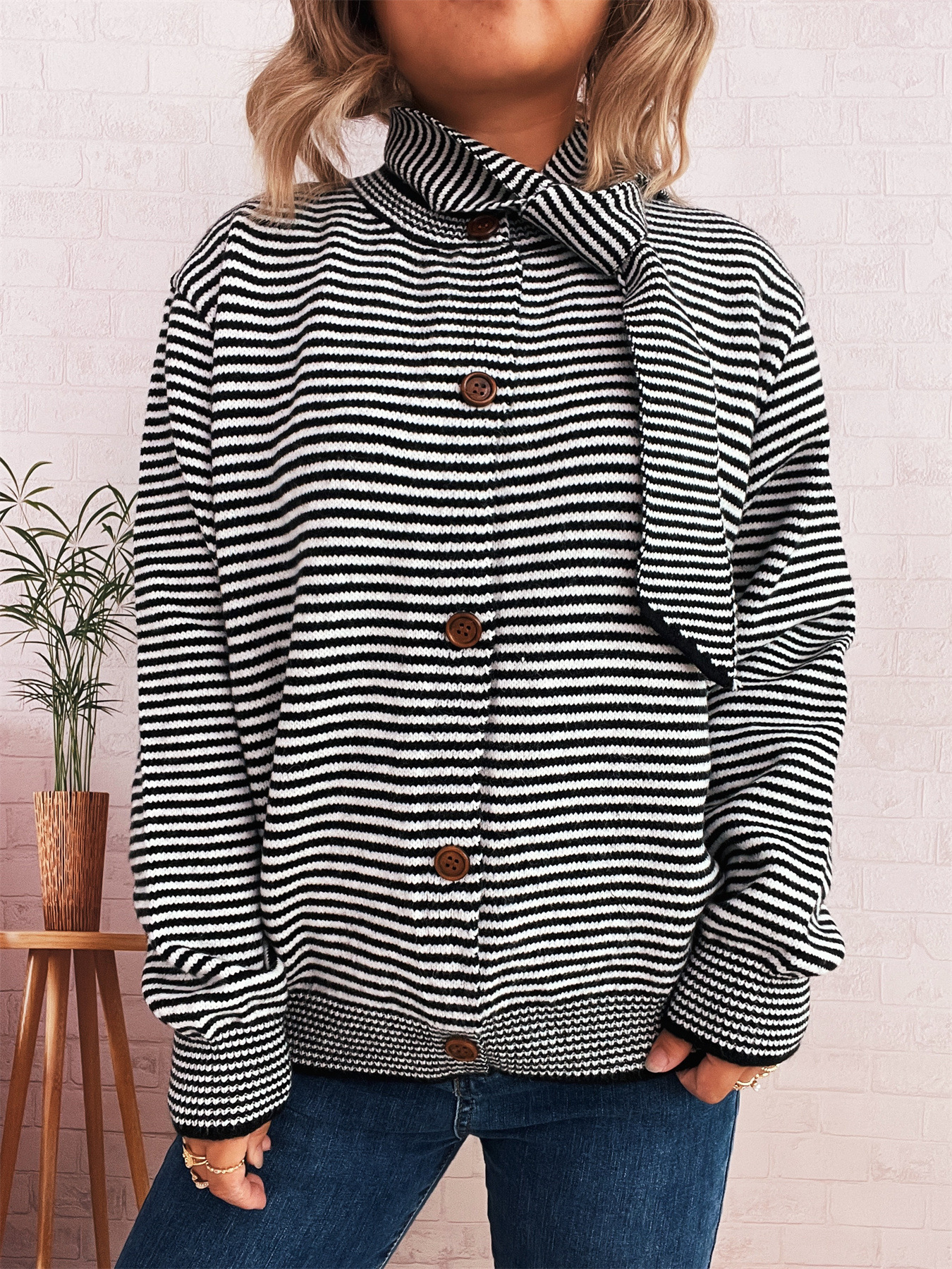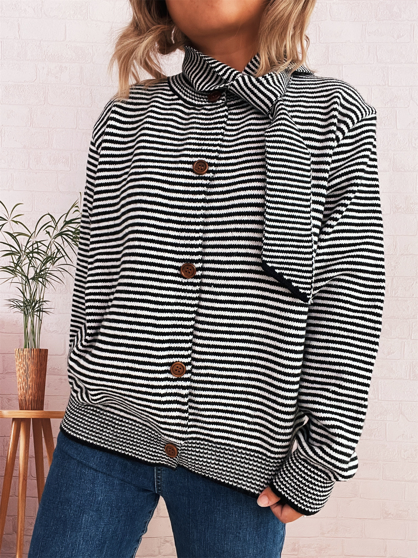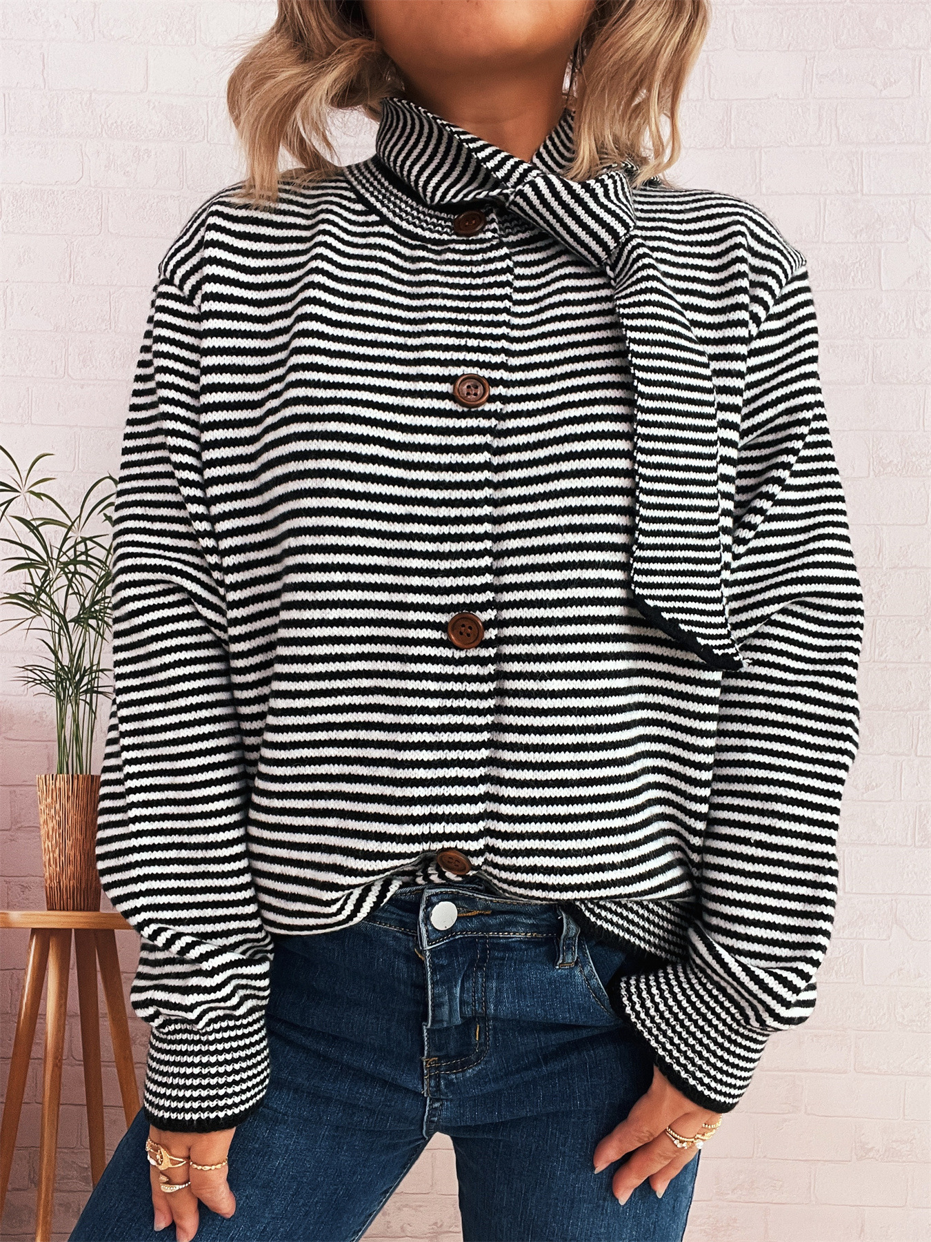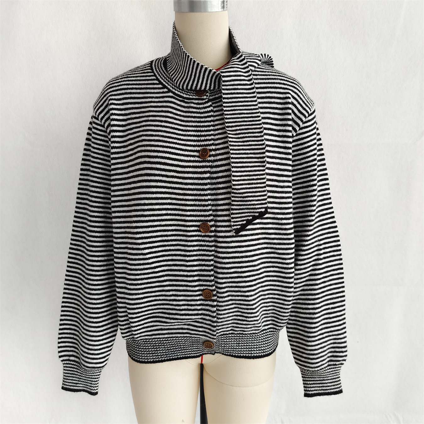 Elegant Retro Pinstripe Single-breasted Scarf Knitted Cardigan Sweater