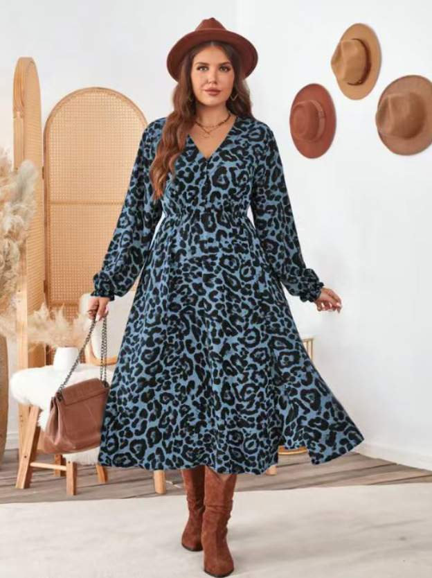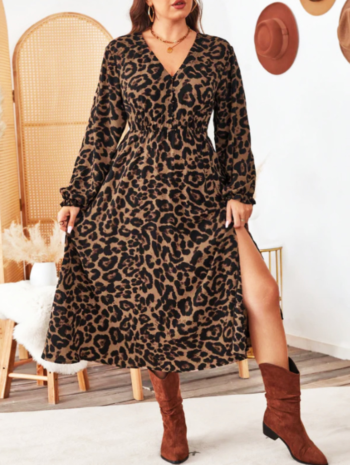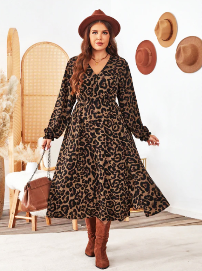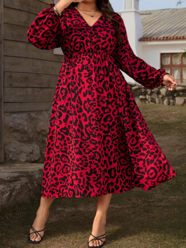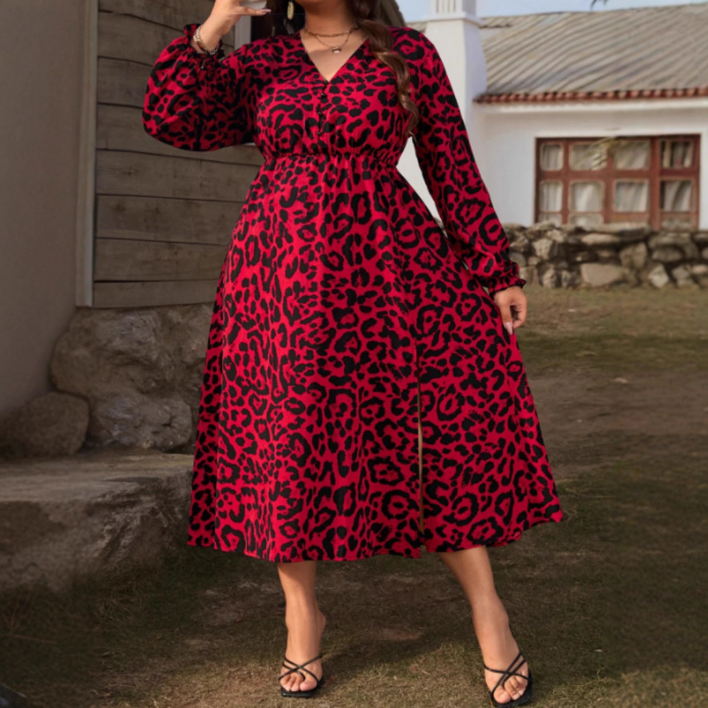Elegant Sexy Leopard-Print V-Neck Plus-Size Dress For Women
