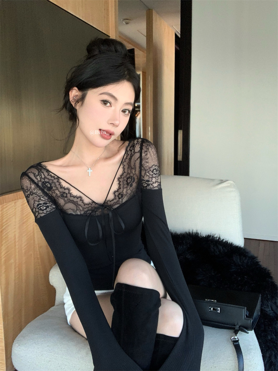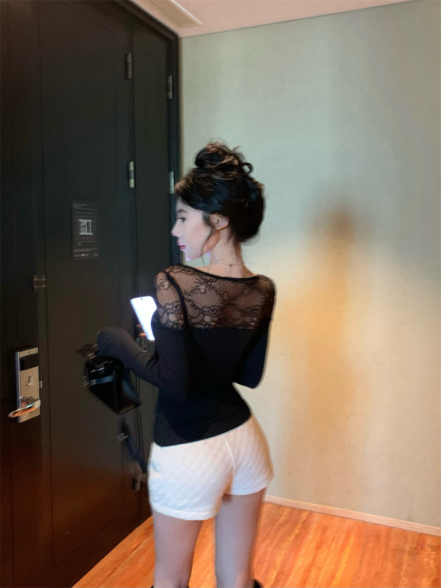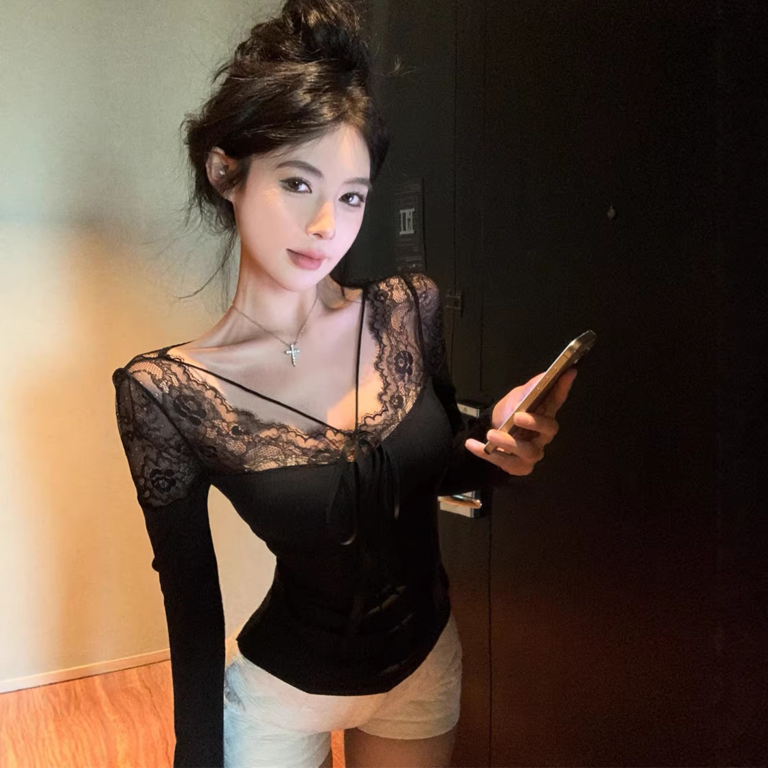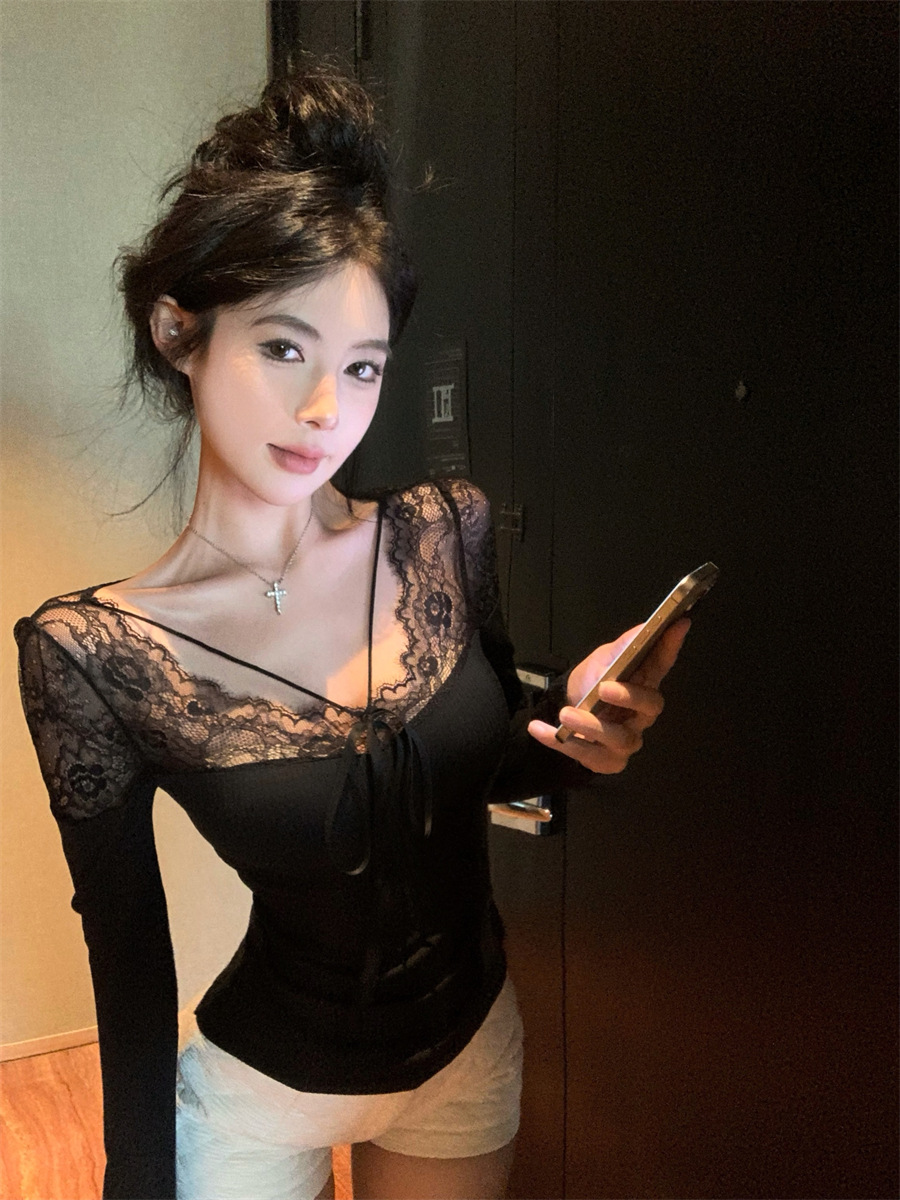 Pattern: Spring Lace Patchwork Base Layer Top, Black Tight Fitting Top for Chic Girls