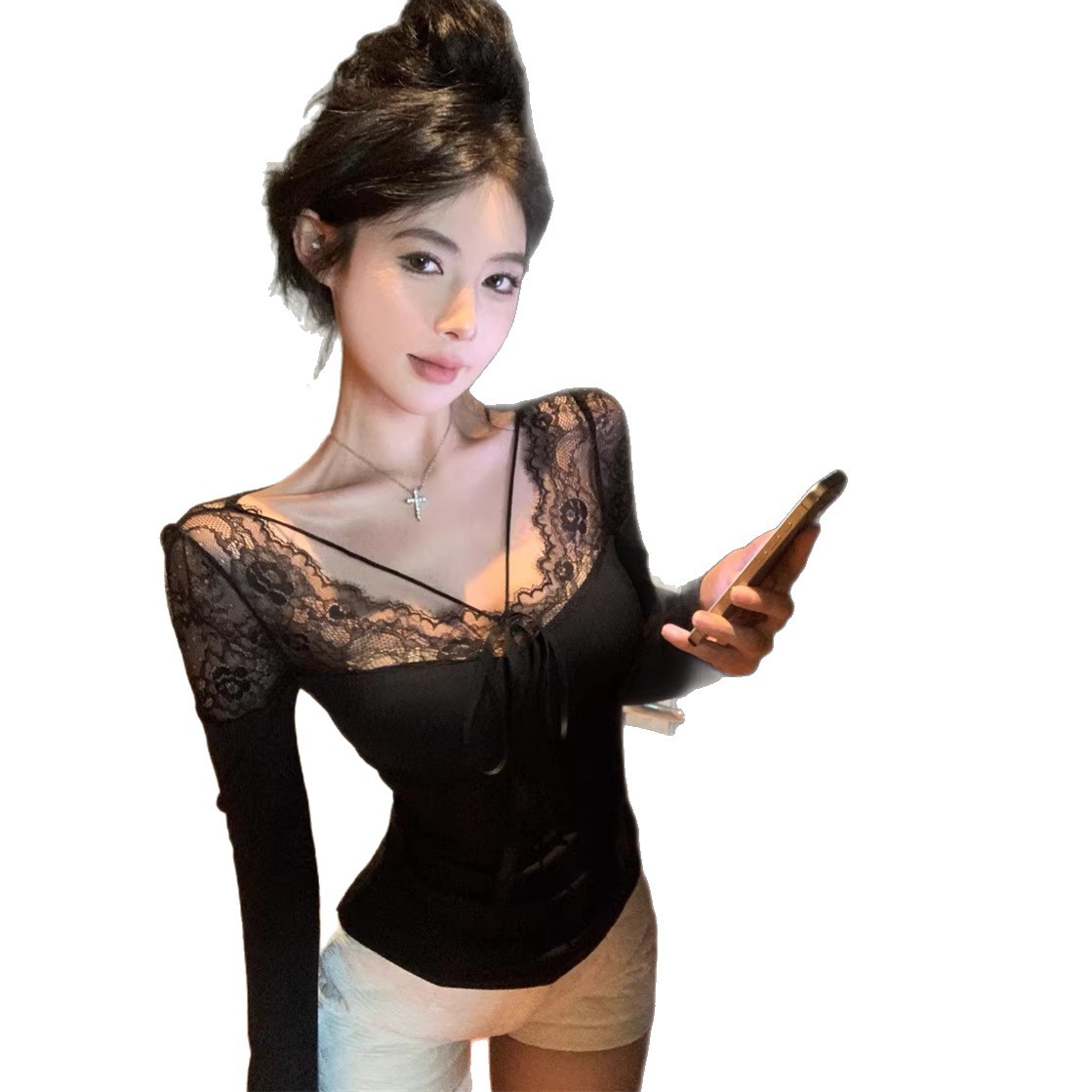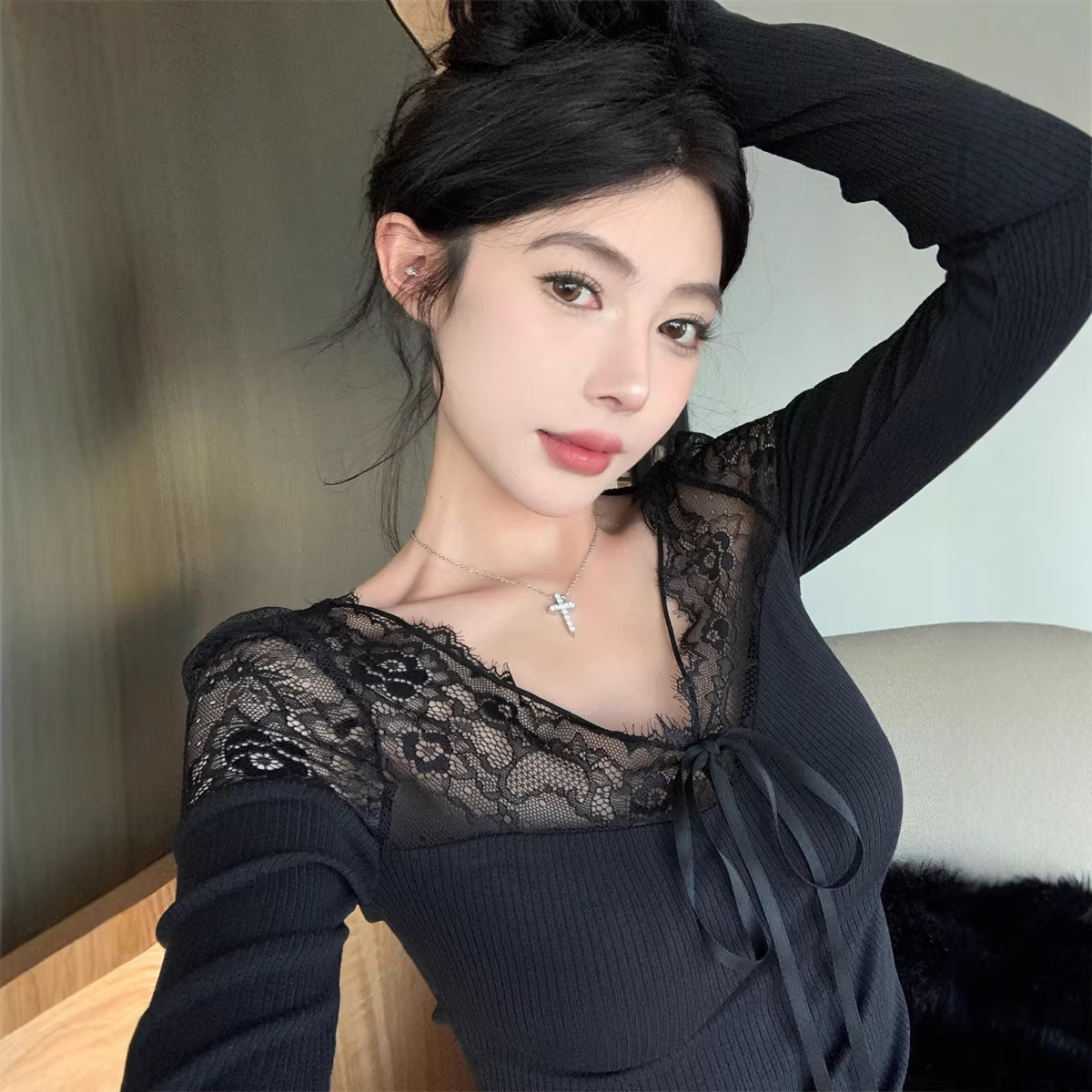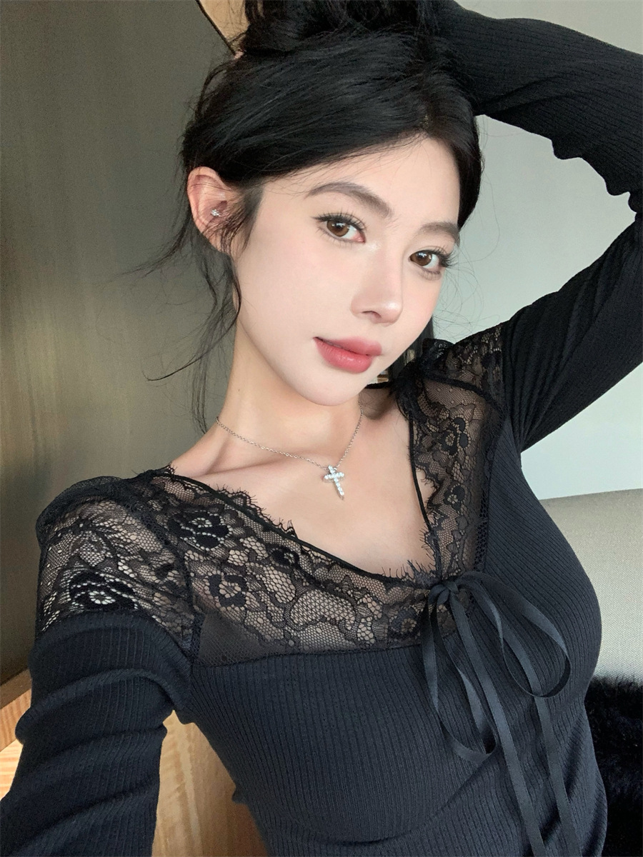 Pattern: Spring Lace Patchwork Base Layer Top, Black Tight Fitting Top for Chic Girls
