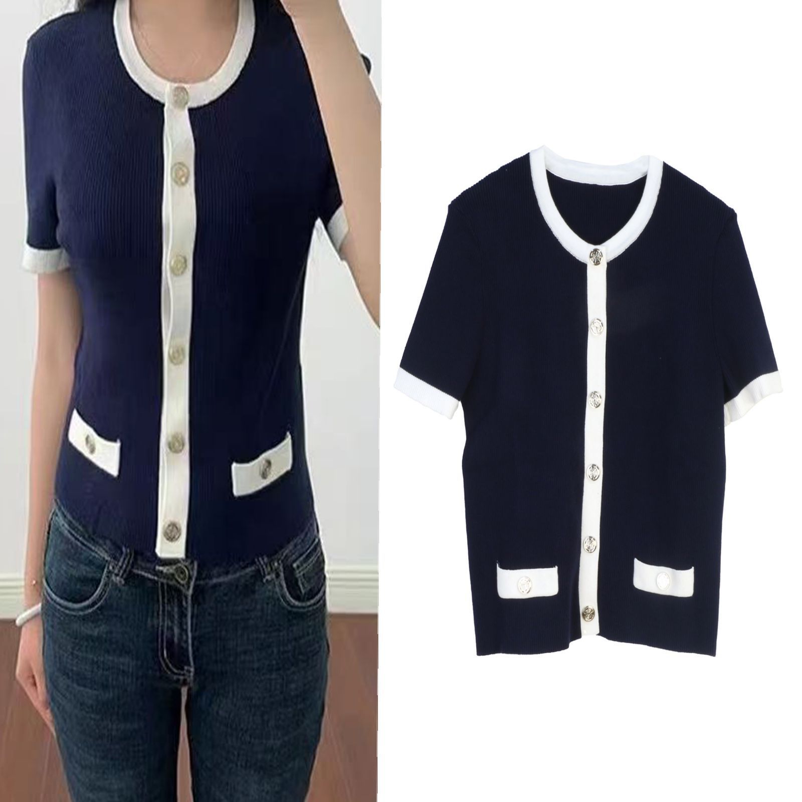 Color: 19410 Blue France T-shirt Shory style knitted cardigan