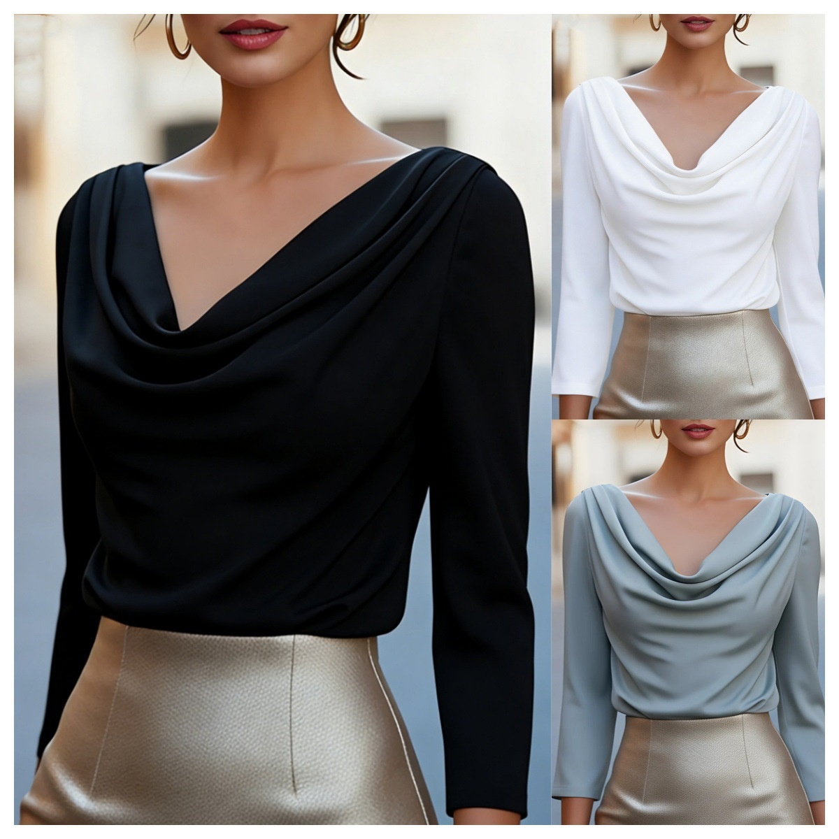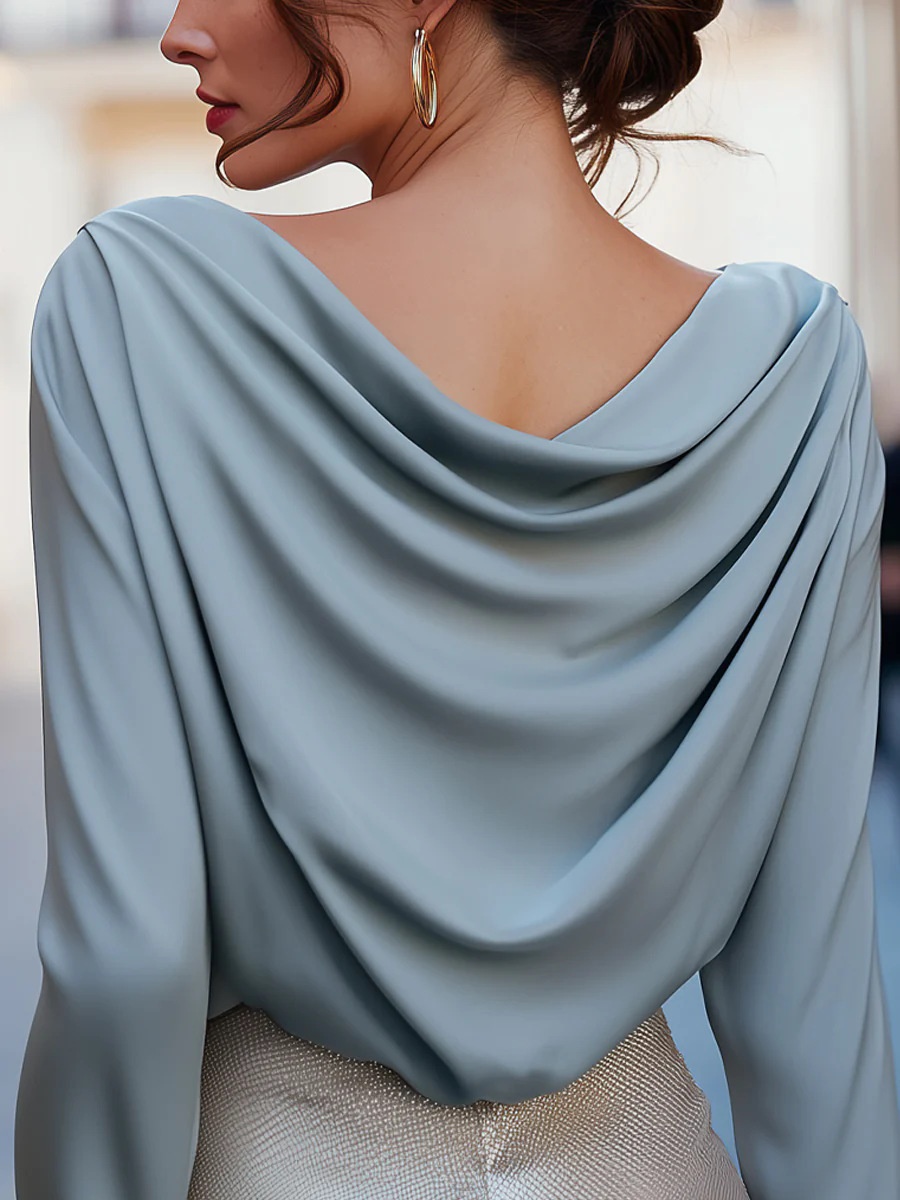 Elegant Solid-Color Draped Pleated V-Neck Blouse For Women