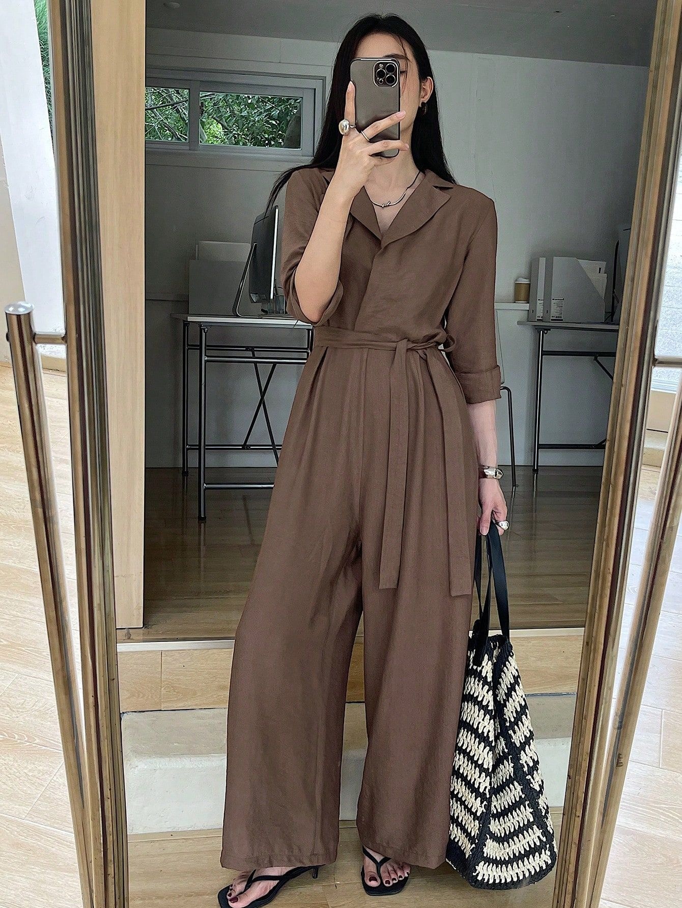 Elegant Solid-Color V-Neck Long-Sleeve Lace-Up Wide-Leg Jumpsuit