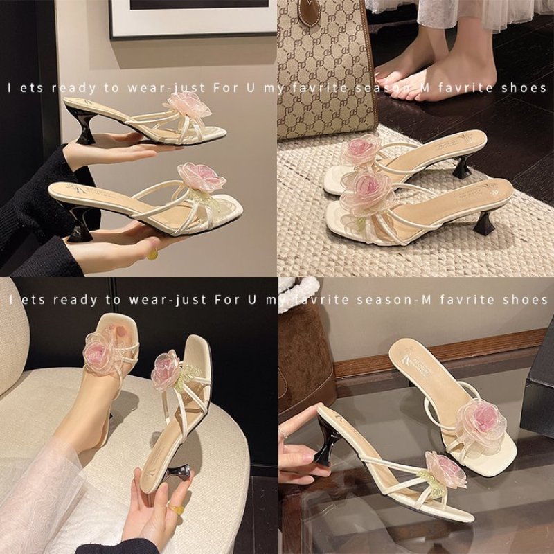 Elevate your everyday look with these delicate Korean-style floral high heel mules. Featuring a romantic sheer rose decoration, a sleek square toe, and a convenient slip-on design, these open-toe sandals offer both gentle elegance and a subtle leg-lengthening lift. Perfect for matching dresses and adding a soft, sophisticated charm to spring, summer outings, or casual daily wear.