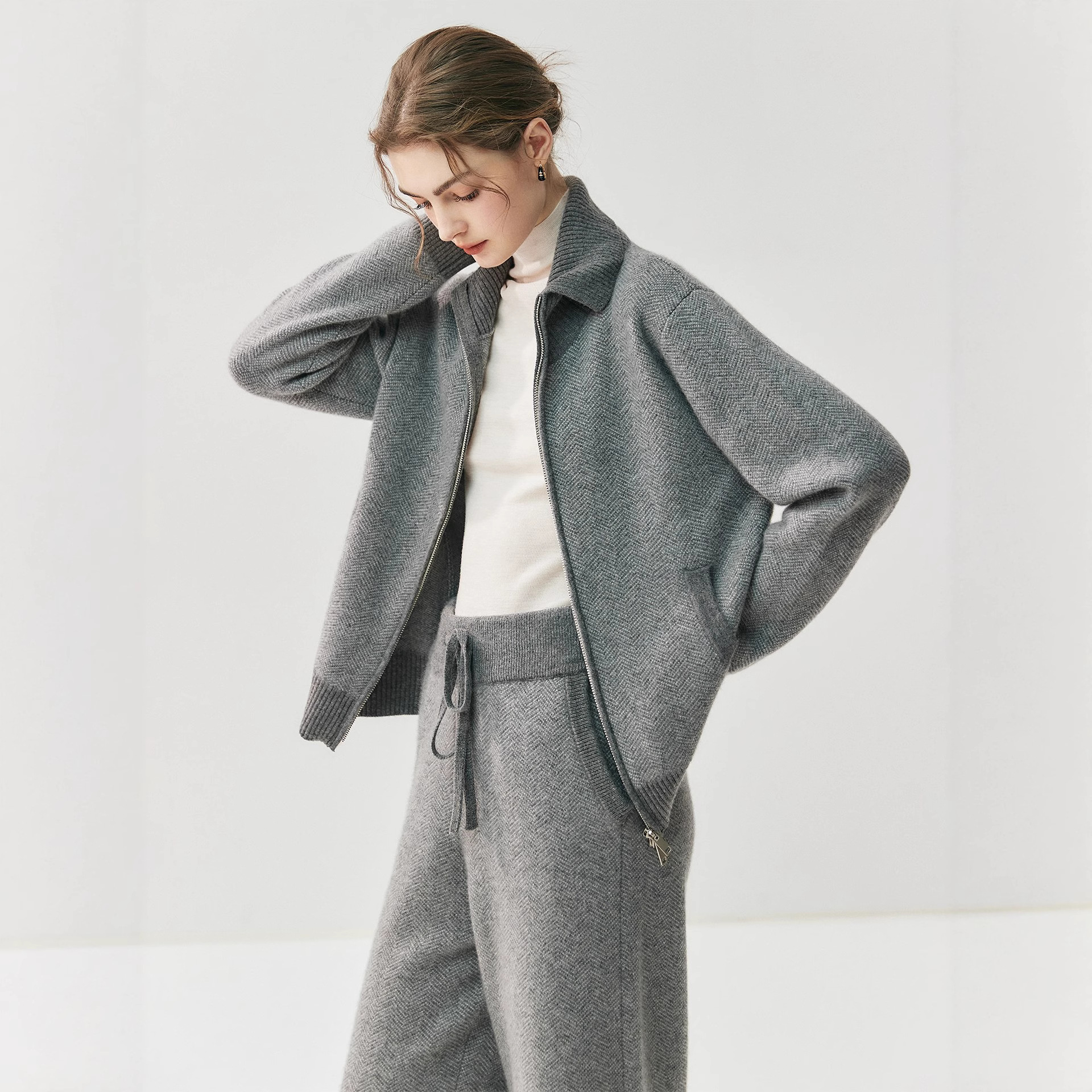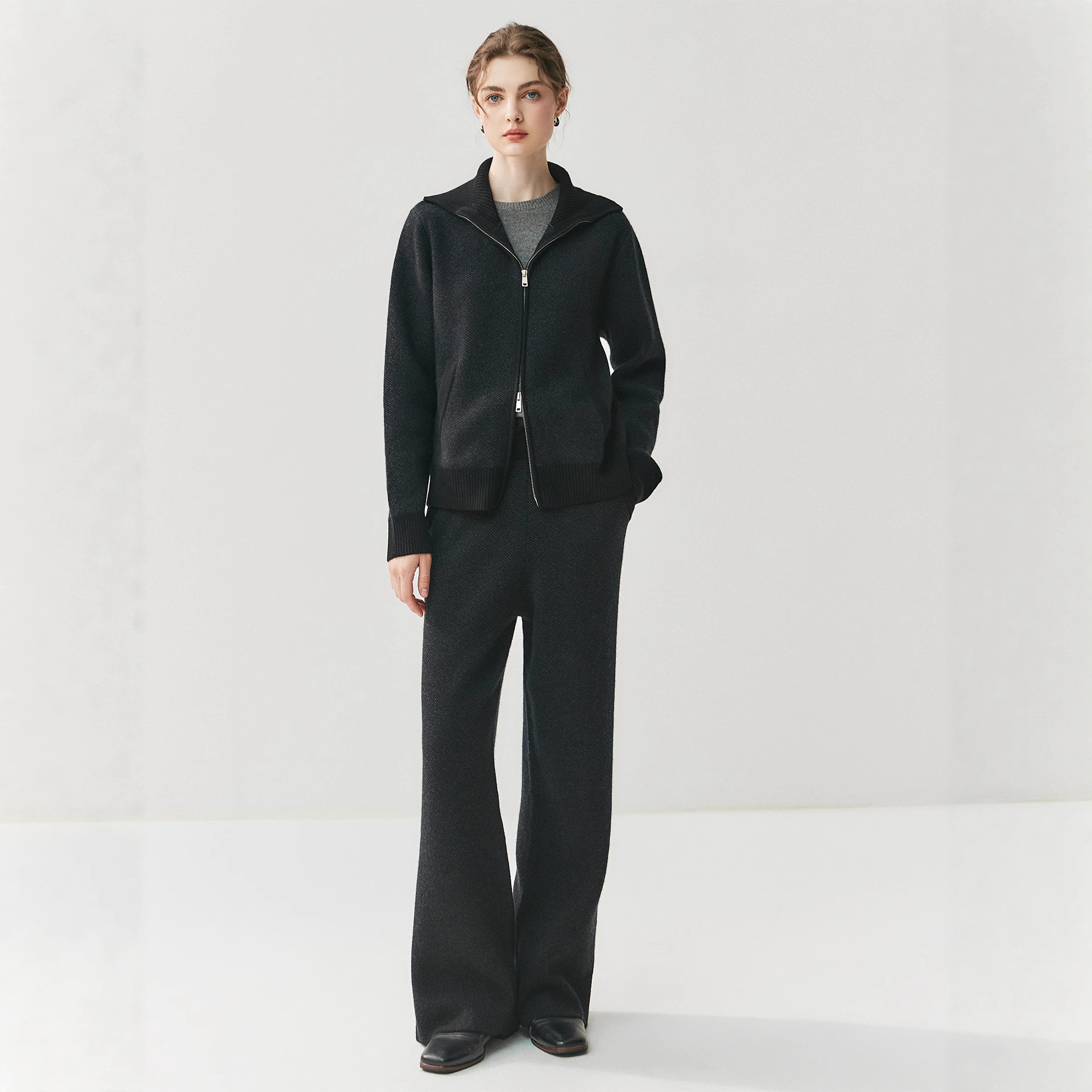 Colors: Elegant camel cardigan, gray cardigan, charcoal gray cardigan, elegant camel pants, gray pants, charcoal gray pants