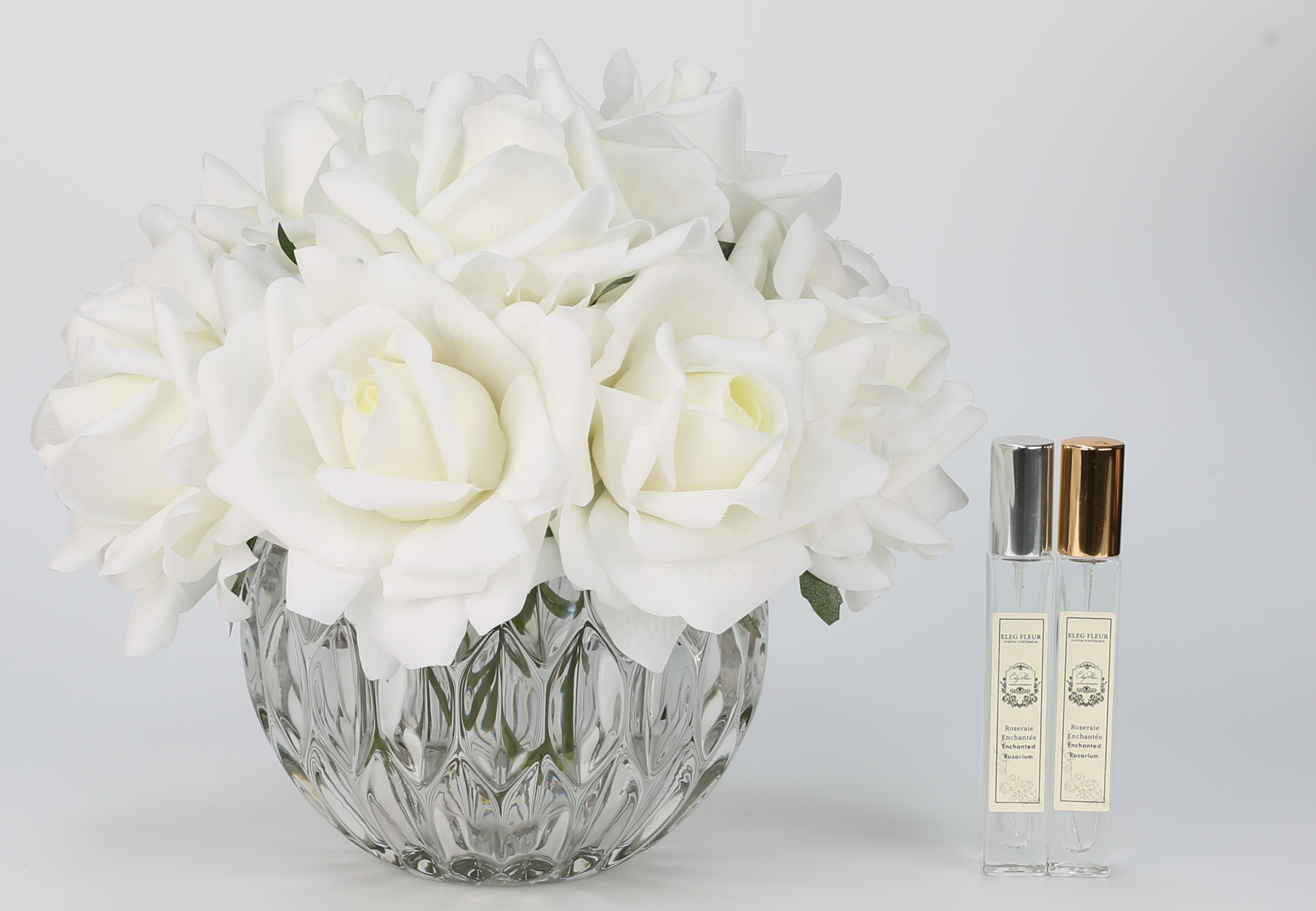The ElegFleur - Spherical Vase Rose Bouquet - White presents an elegant blend of artful florals and contemporary design. Each bloom is a meticulously handcrafted artificial rose—designed not to mimic nature, but to reinterpret it through refined craftsmanship. Nestled within a transparent spherical glass cup with delicate embossed leaf textures, the bouquet radiates timeless beauty and serene sophistication.