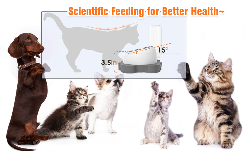 【15° Tilted Elevated Bowl】The 15° tilted elevated cat bowls reduce the neck pressure when your cat/puppy eating food. It is more in line with the diet habits of kittens and puppies.