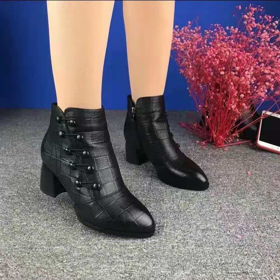 Embossed Double-breasted Martin Boots Women's Pointed Toe Side