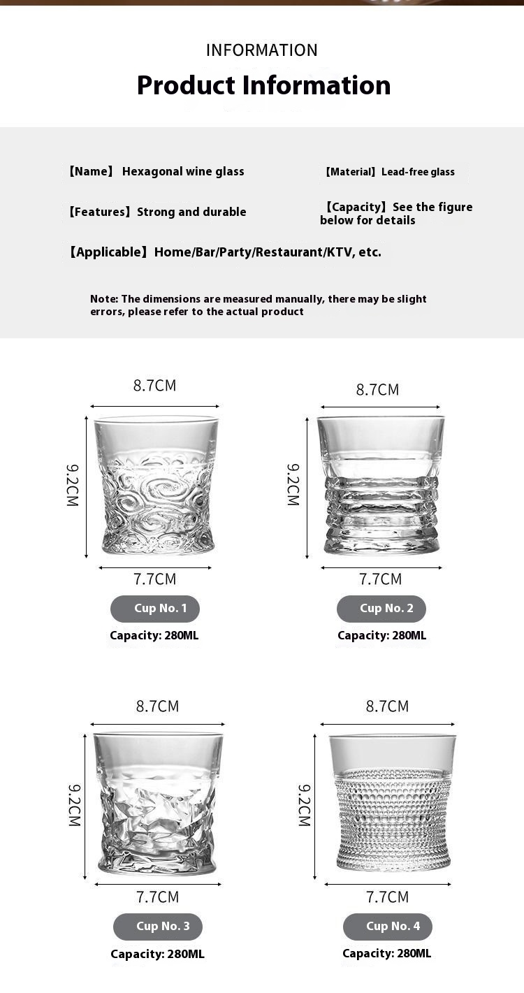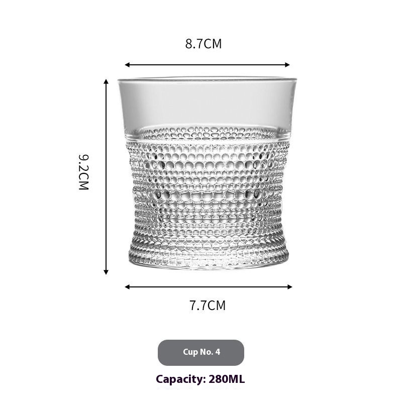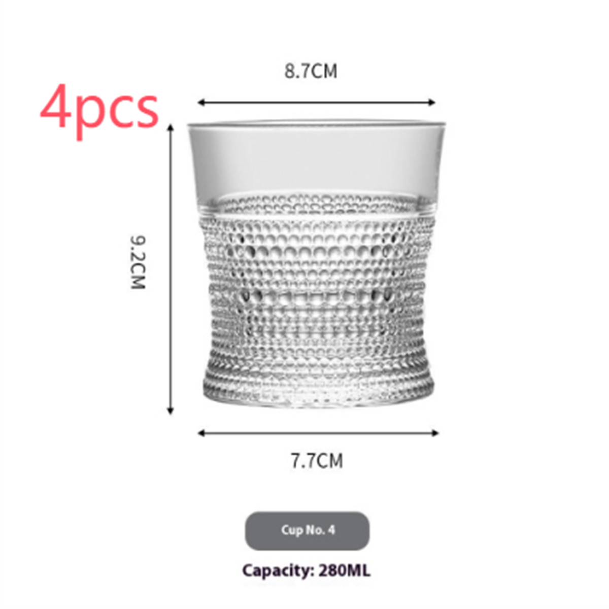 Specification size: Diamond whiskey shot glass [280ml]-36 pcs/box, cloud layer whiskey shot glass [280ml]-36 pcs/box, Xiangyun whiskey shot glass [280ml]-36 pcs/box, bead whiskey glass [280ml]-36 pcs/box