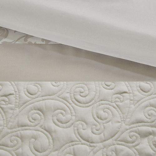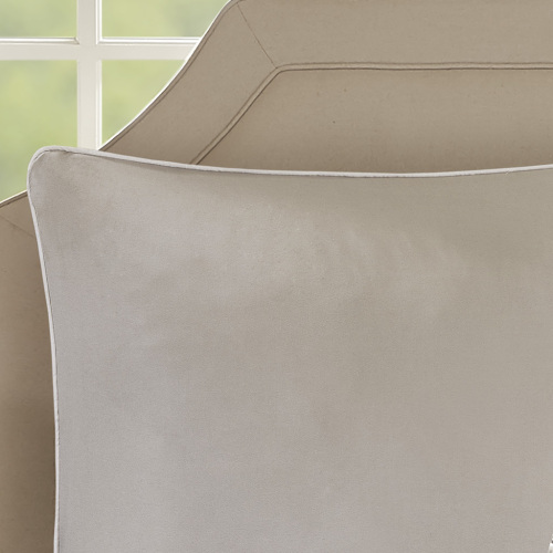 The 510 Design Ramsey Embroidered 8 Piece Comforter Set introduces a graceful elegance to your bedroom decor. A pieced embroidery design with quilting and pintuck details, in neutral hues, adorns the face of the comforter and shams, for a beautiful transitional look. Solid Euro shams complement the top of the bed, while two embroidered decorative pillows and a solid bed skirt provide the perfect finishing touches to the bedding set. Made from ultra-soft microfiber, this pieced comforter set is machine washable and may come in rolled or compressed packing and will need to be fluffed up. Use a steam iron to help remove wrinkles easier.