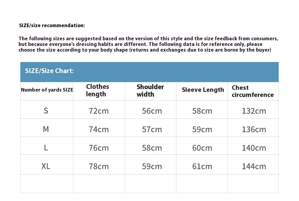 1. Asian sizes are 1 to 2 sizes smaller than European and American people. Choose the larger size if your size between two sizes. Please allow 2-3cm differences due to manual measurement. 2. Please check the size chart carefully before you buy the item, if you don't know how to choose size, please contact our customer service. 3.As you know, the different computers display colors differently, the color of the actual item may vary slightly from the following images.