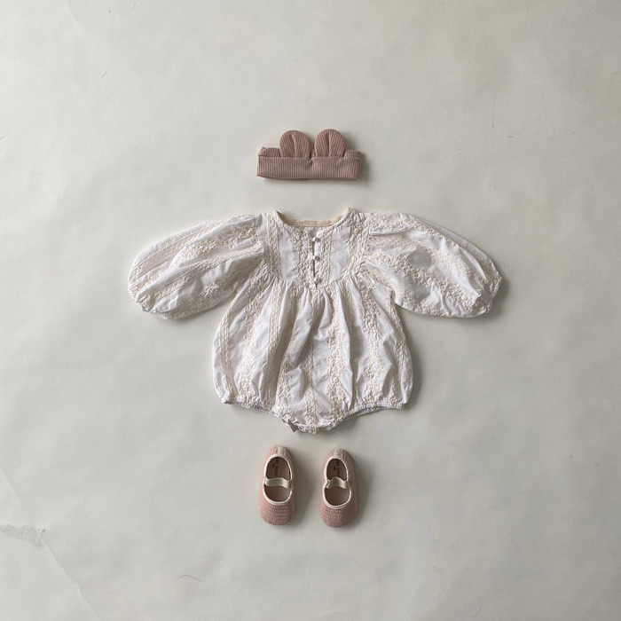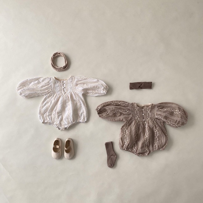 Color: Beige Pearl Button Embroidered Long Sleeve Romper, Swallow Grey Pearl Button Embroidered Long Sleeve Romper