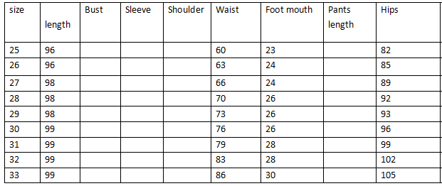 Size 25 (1 feet 8), size 26 (1 feet 9), size 27 (2 feet), size 28 (2 feet 1), size 29 (2 feet 2), size 30 (2 feet 3), size 31 ( 2 feet 4), 32 yards (2 feet 5)