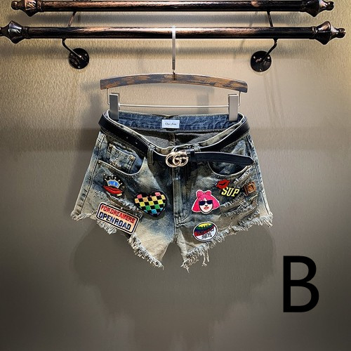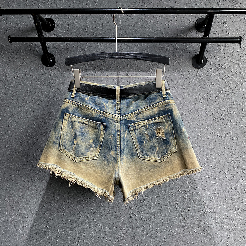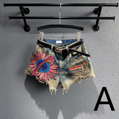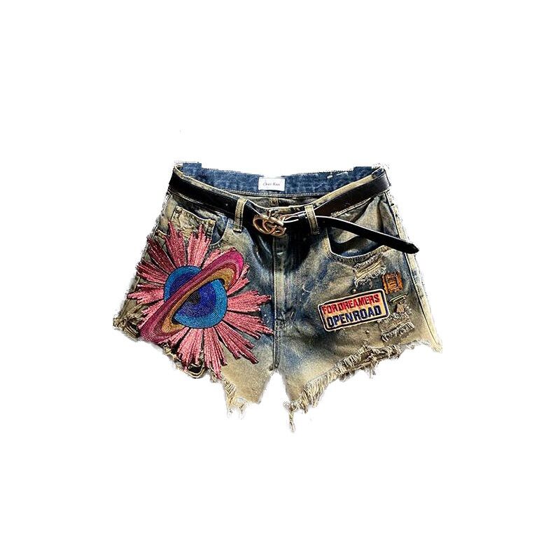 Embroidered Planet Shorts High-waisted Straight Denim Wide-leg Holes