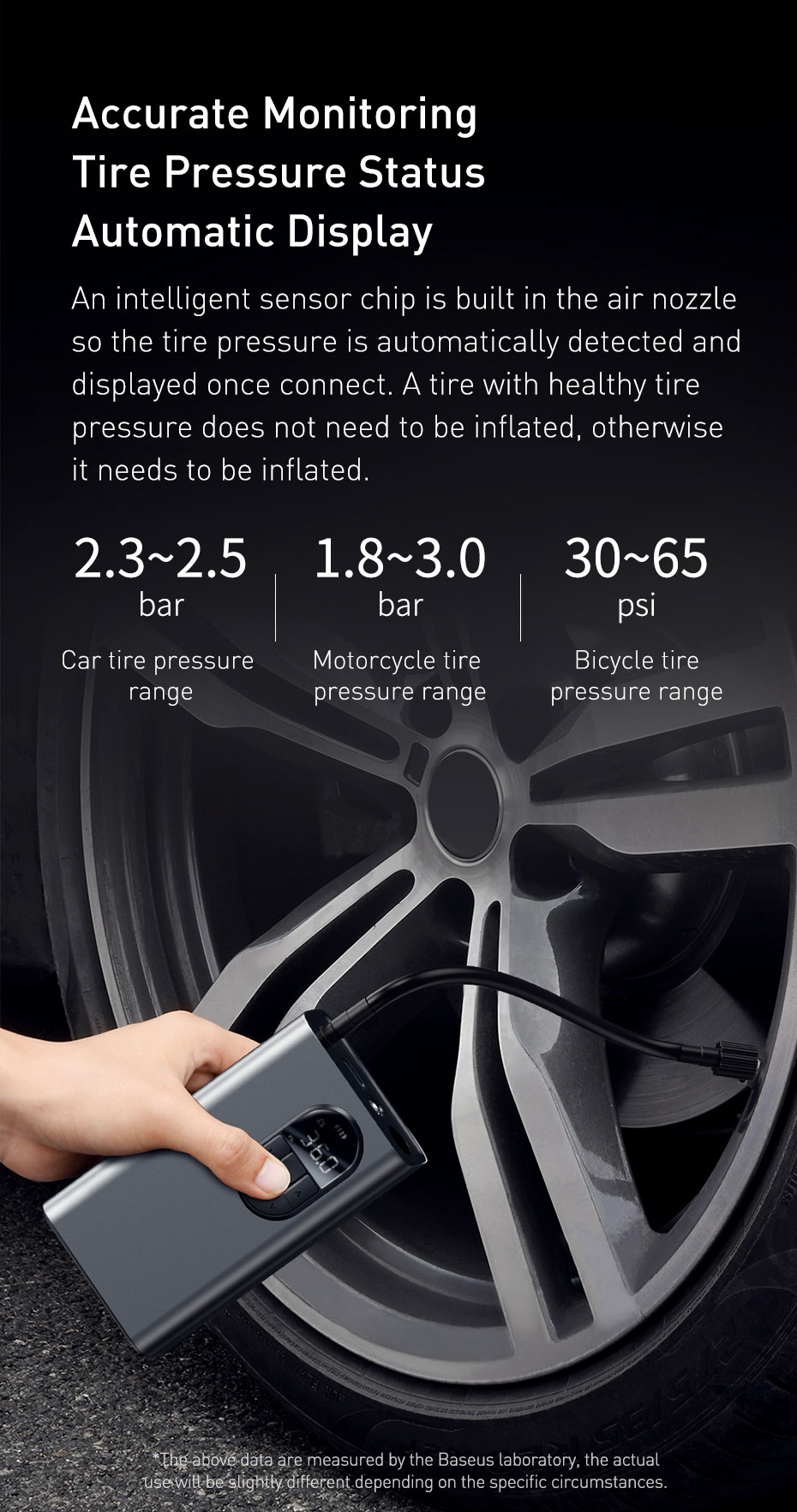 An intelligent sensor chip is built in the air nozzle so the tire pressure is automatically detected and displayed once connect. A tire with healthy tire pressure does not need to be inflated, otherwise it needs to be inflated.