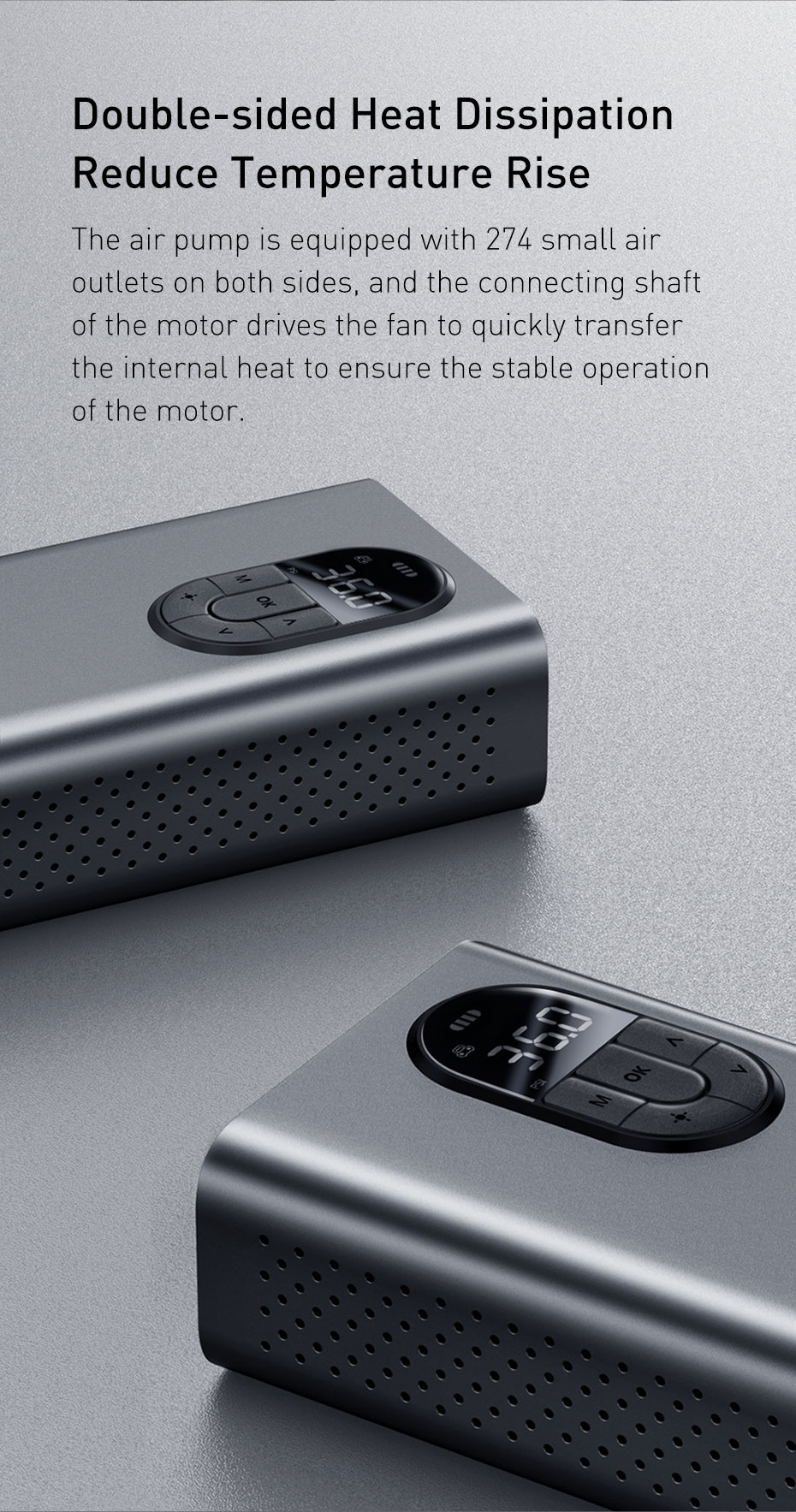 A heat-resistant PTFE piston rod and aU-metaL cylinder help stabilize the body, even if the low-current permanent magnet motor runs at high speed. Do not worry about shake and cylinder blast when pressurized inflation.