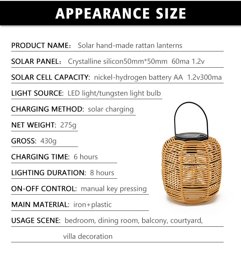 Product information:Rated Power: 60 Life: 100000 Protection level: IP55 Voltage: 1.2 Size: 17*19 Shape: Lantern