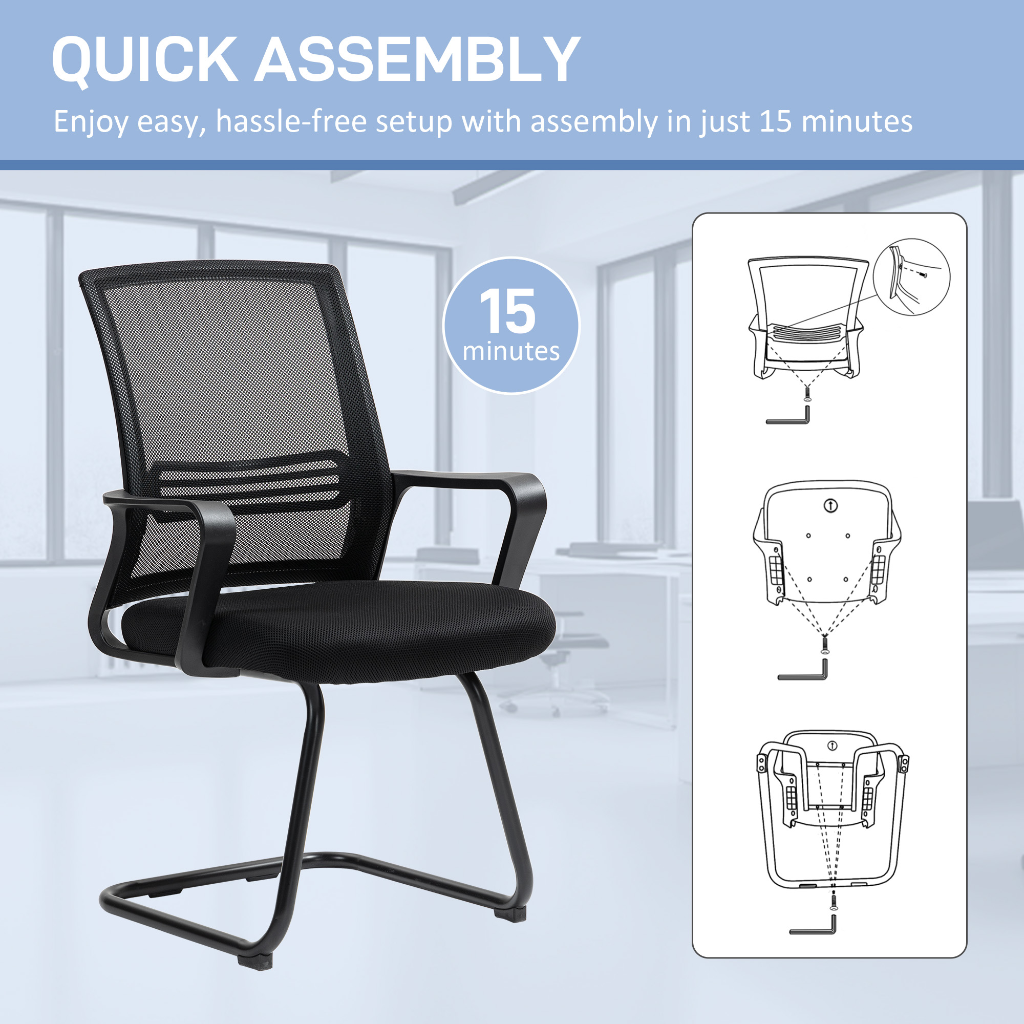 Discover the comfort of the conference chair, designed with an ergonomic backrest and plush, breathable mesh fabric. Great for use as a study chair, reception chair, or in meeting and conference rooms, its metal legs and sleek sled base add a modern twist to any space. Enjoy a relaxed seating experience, optimal for any waiting room.