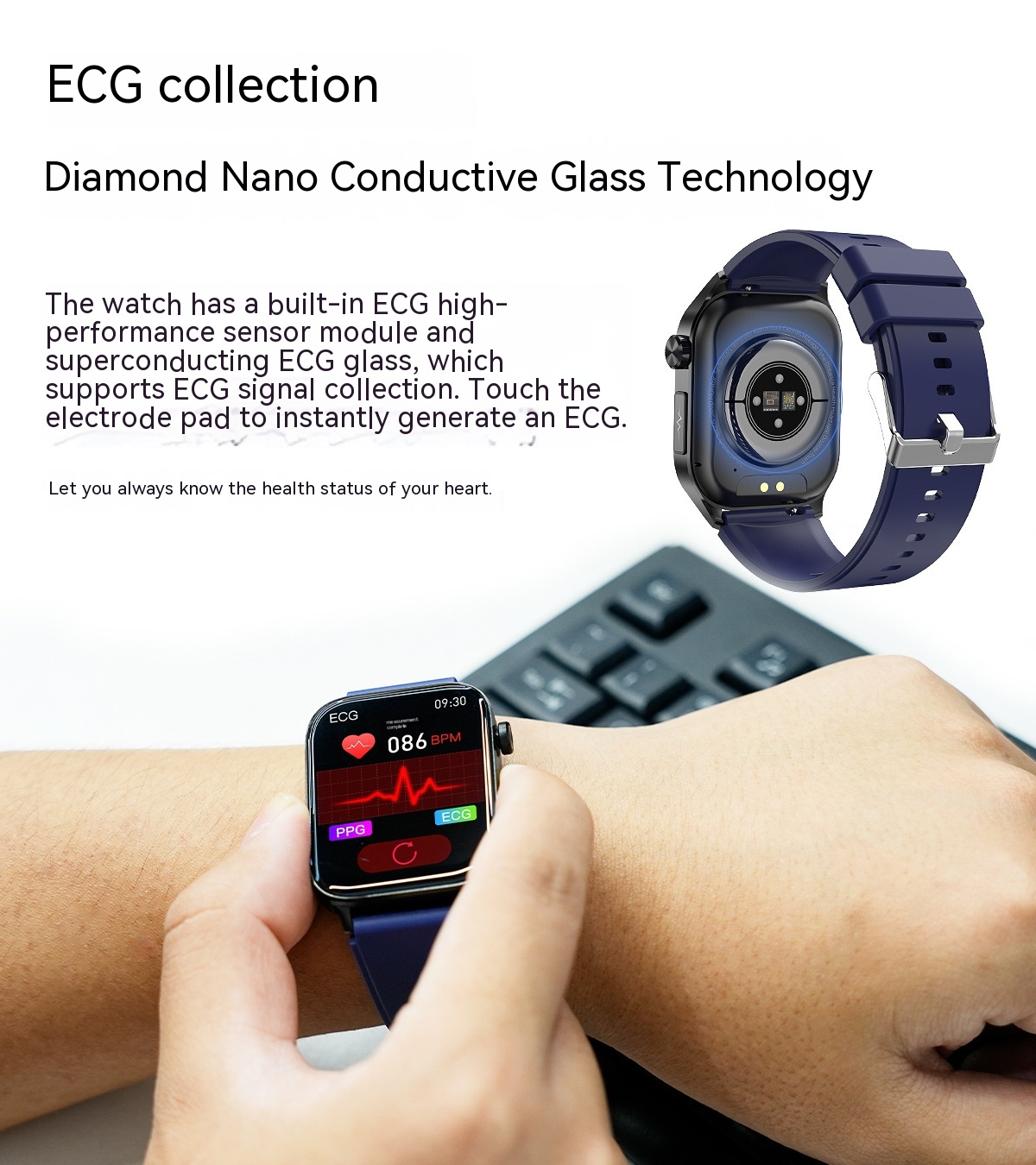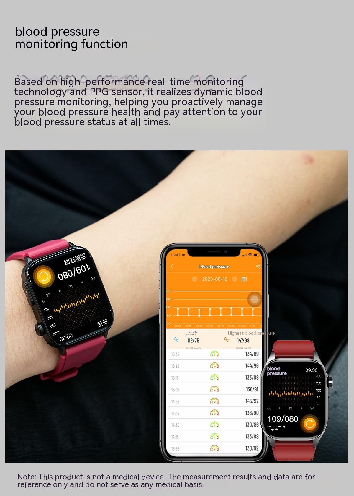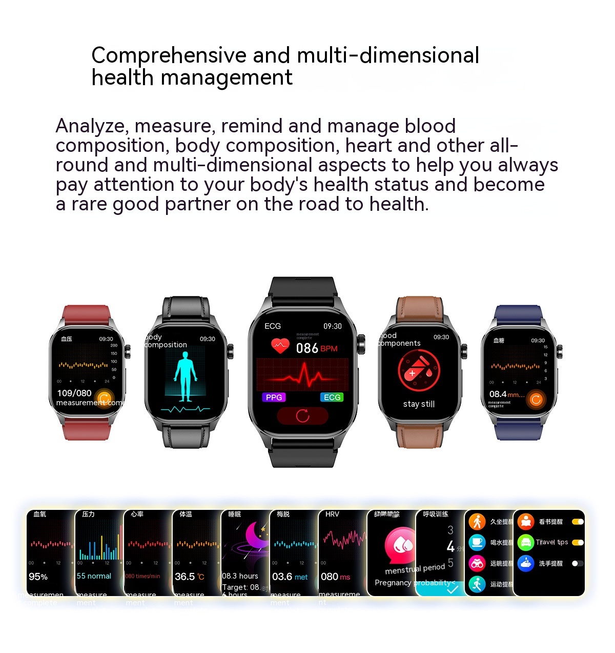 Functions: Waterproof, step counting, heart rate monitoring, blood pressure measurement, social entertainment, Bluetooth calling, smart reminder, remote control selfie, sleep monitoring, blood oxygen detection