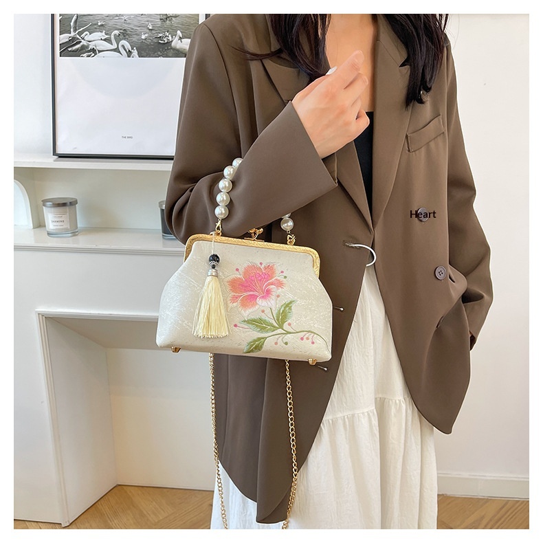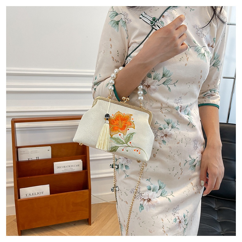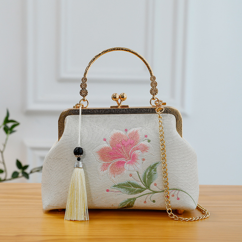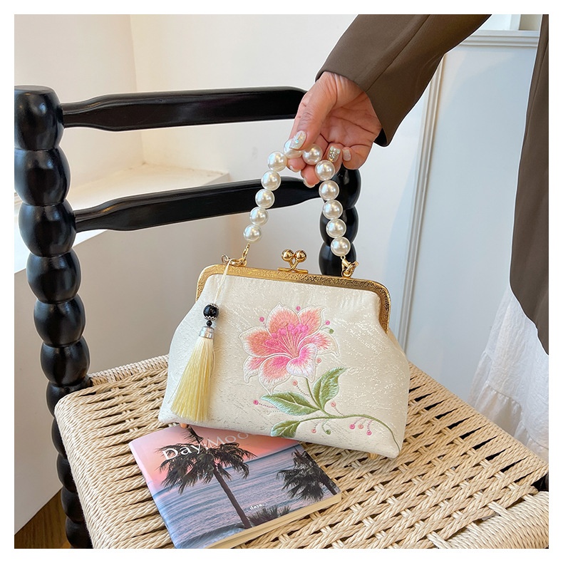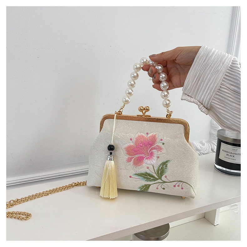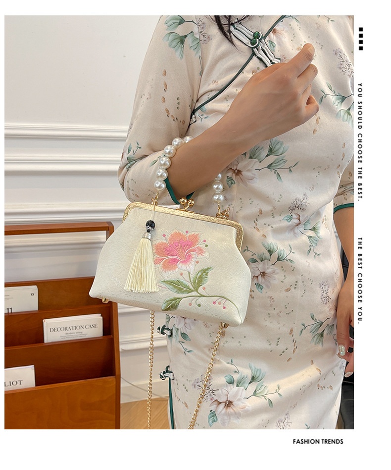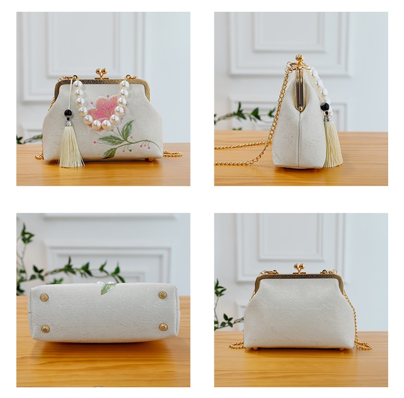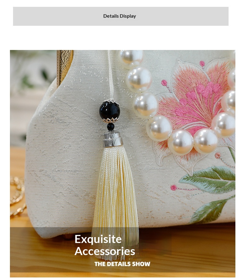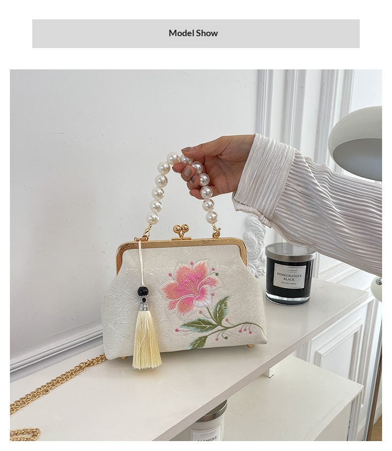 Colors: lily embroidery - pink - single bag (no chain, no tassels); lily embroidery - pink + metal chain + tassels; lily embroidery - pink + beaded chain + metal chain + tassels
