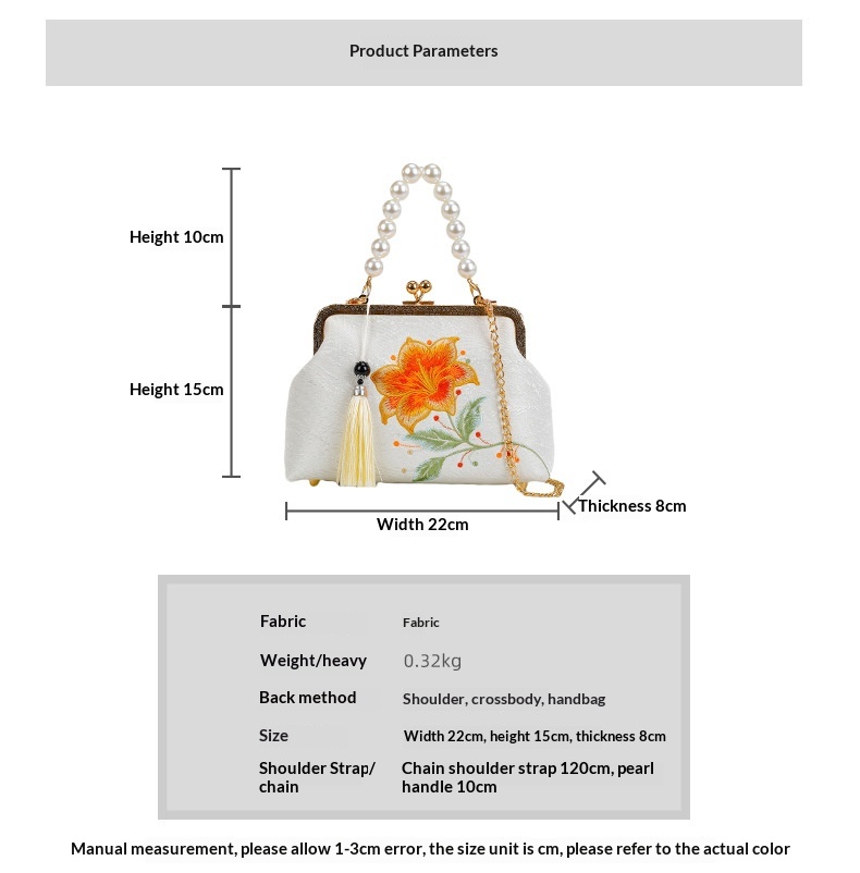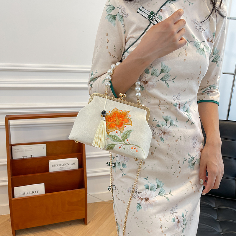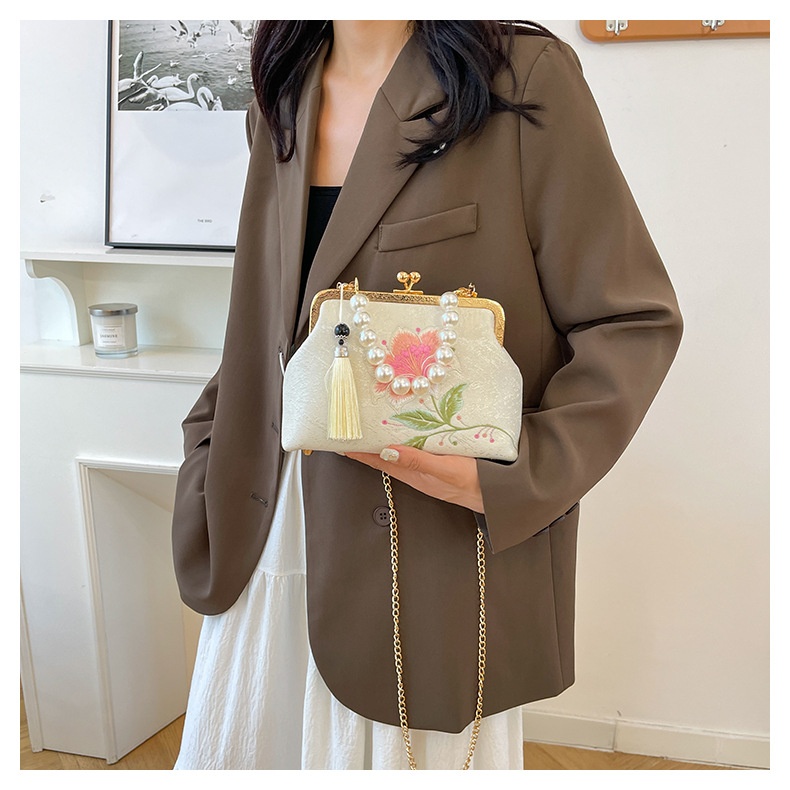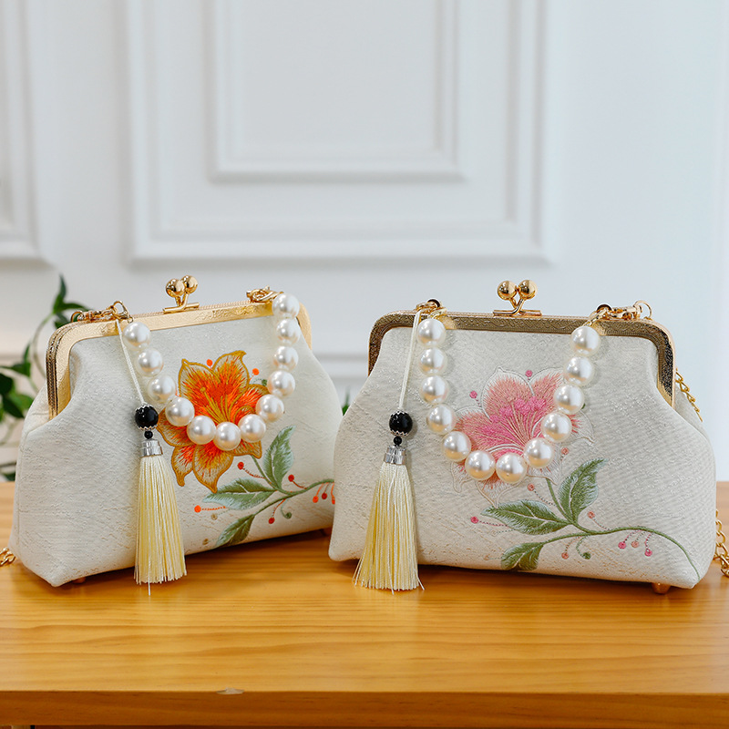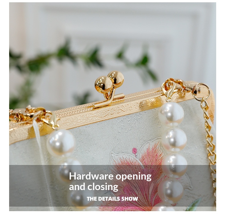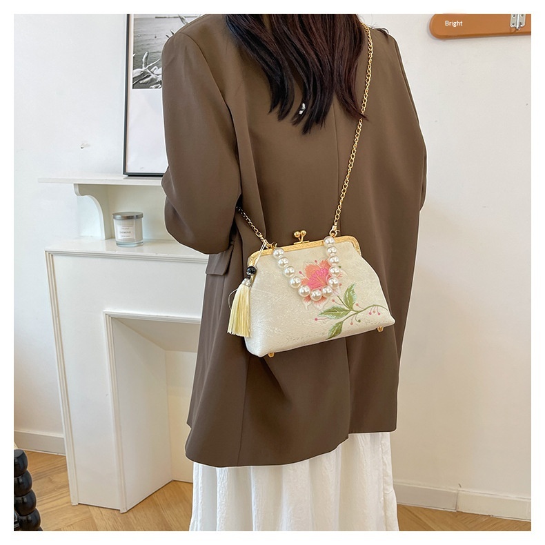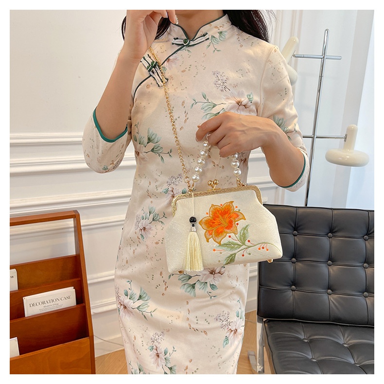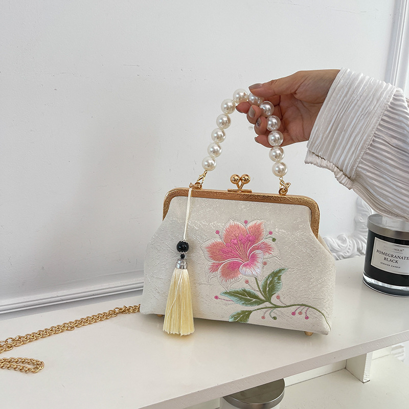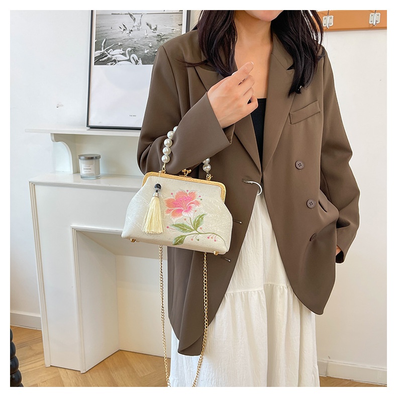 Colors: lily embroidery - pink - single bag (no chain, no tassels); lily embroidery - pink + metal chain + tassels; lily embroidery - pink + beaded chain + metal chain + tassels