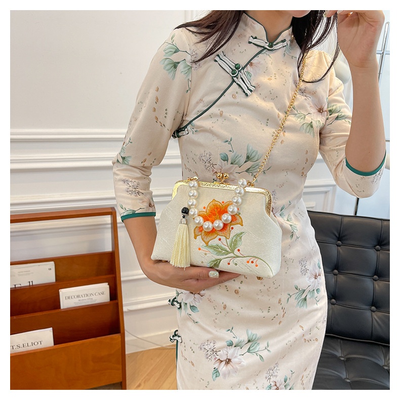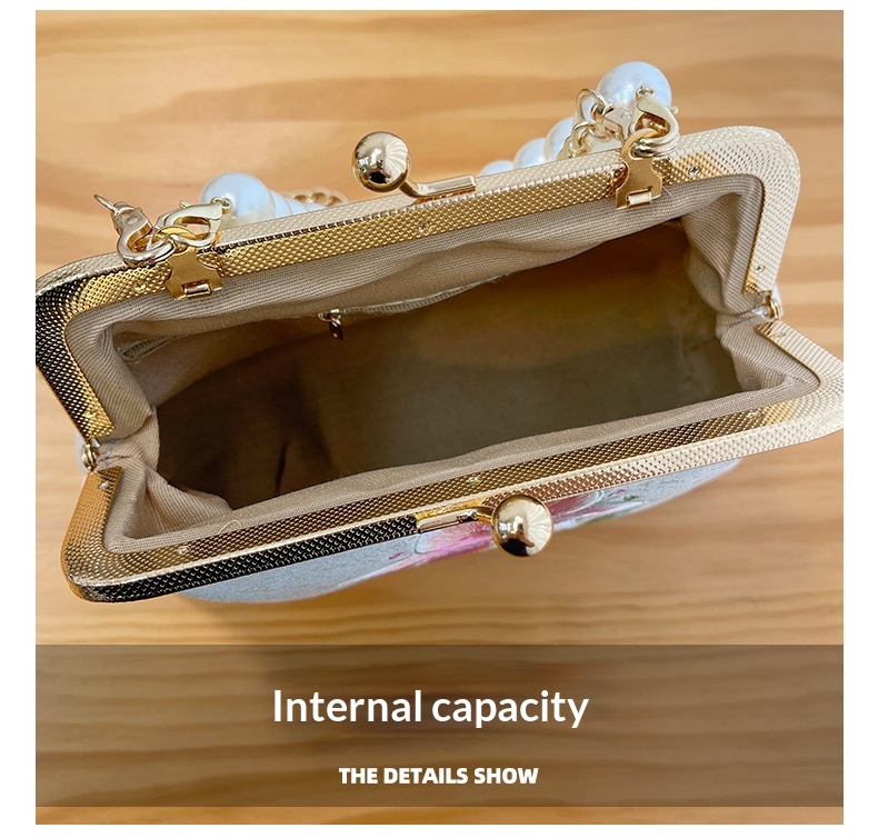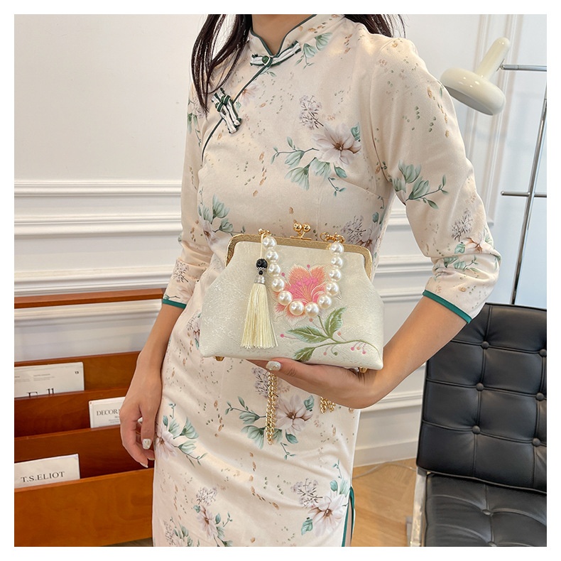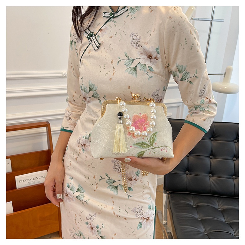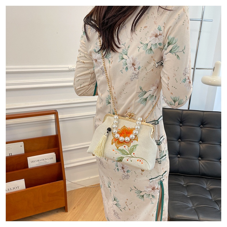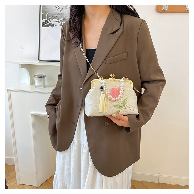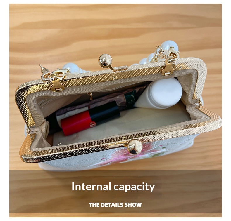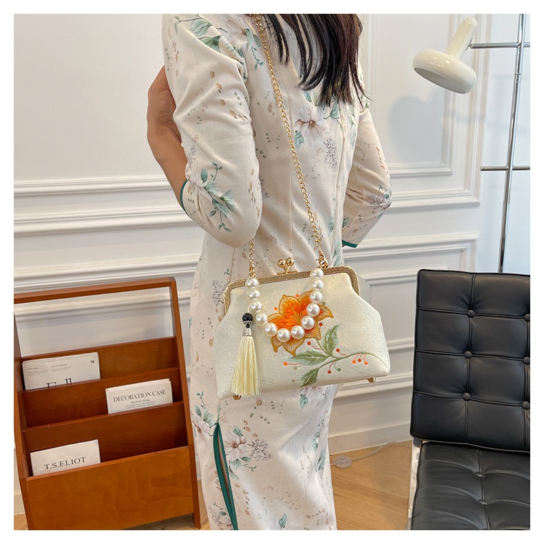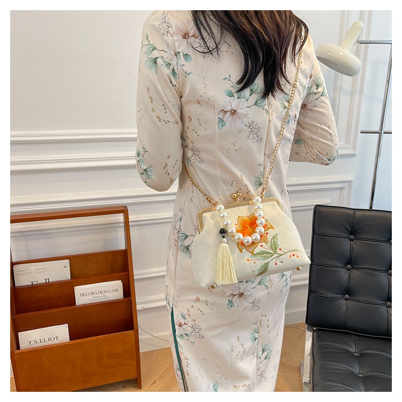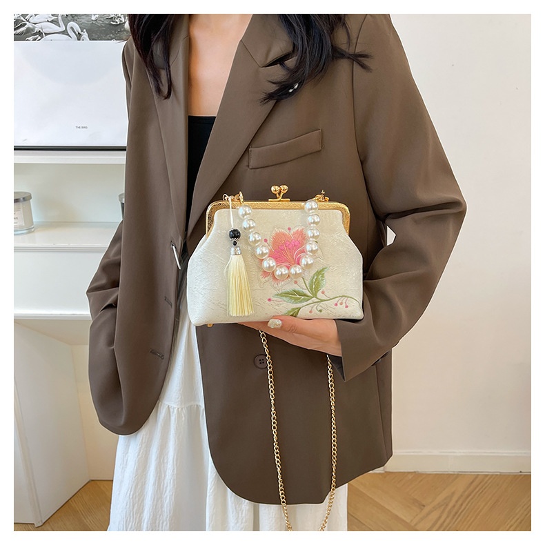 Colors: lily embroidery - pink - single bag (no chain, no tassels); lily embroidery - pink + metal chain + tassels; lily embroidery - pink + beaded chain + metal chain + tassels