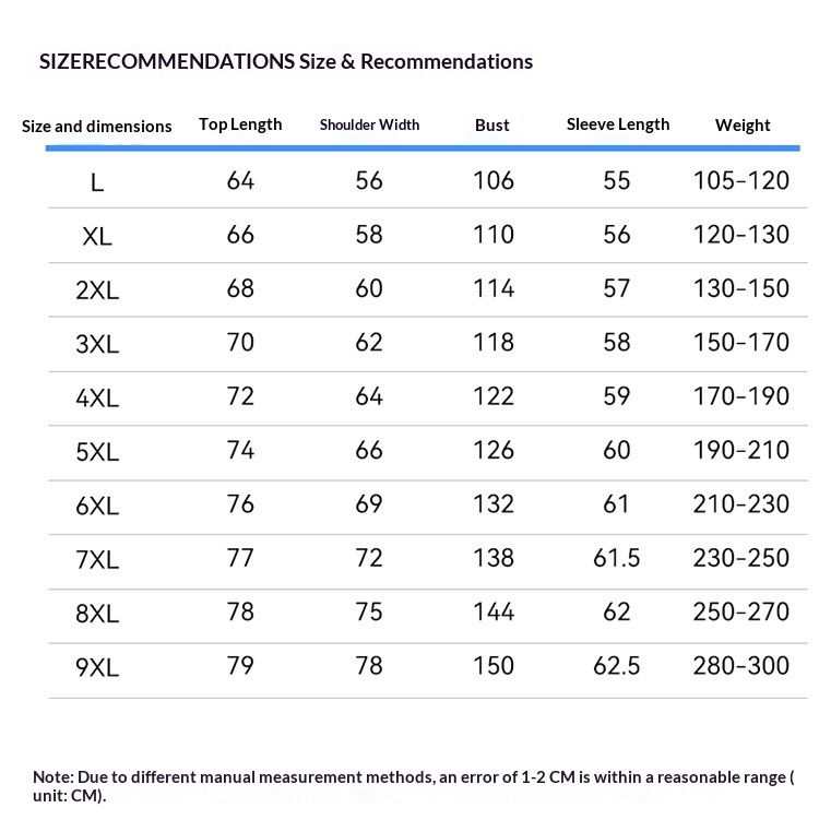 Sizes: L, XL, 2XL, 3XL, 4XL, 5XL, 6XL, 7XL, 8XL, 9XL