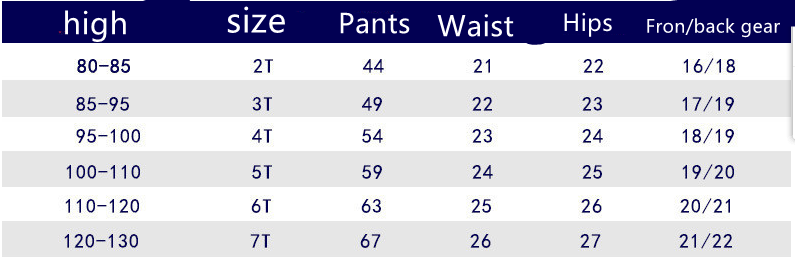 Suitable height 2T (2 years old 80cm), 3T3 years old 90cm), 4T (TT years old 100cm), 5T 5 years old 110cm), 6T (6 years old 120cm), 7T 7 years old 125cm)