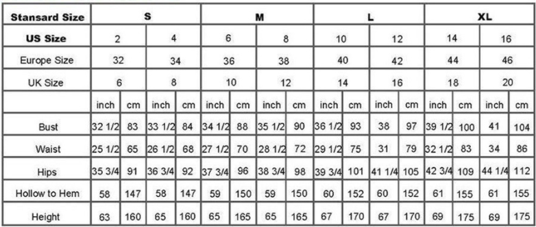 Size: US: 2(S), US: 4(M), US: 6(L), US: 8(XL), US: 10(XXL), US: 12(3XL), US: 14(4XL), US: 16(5XL)