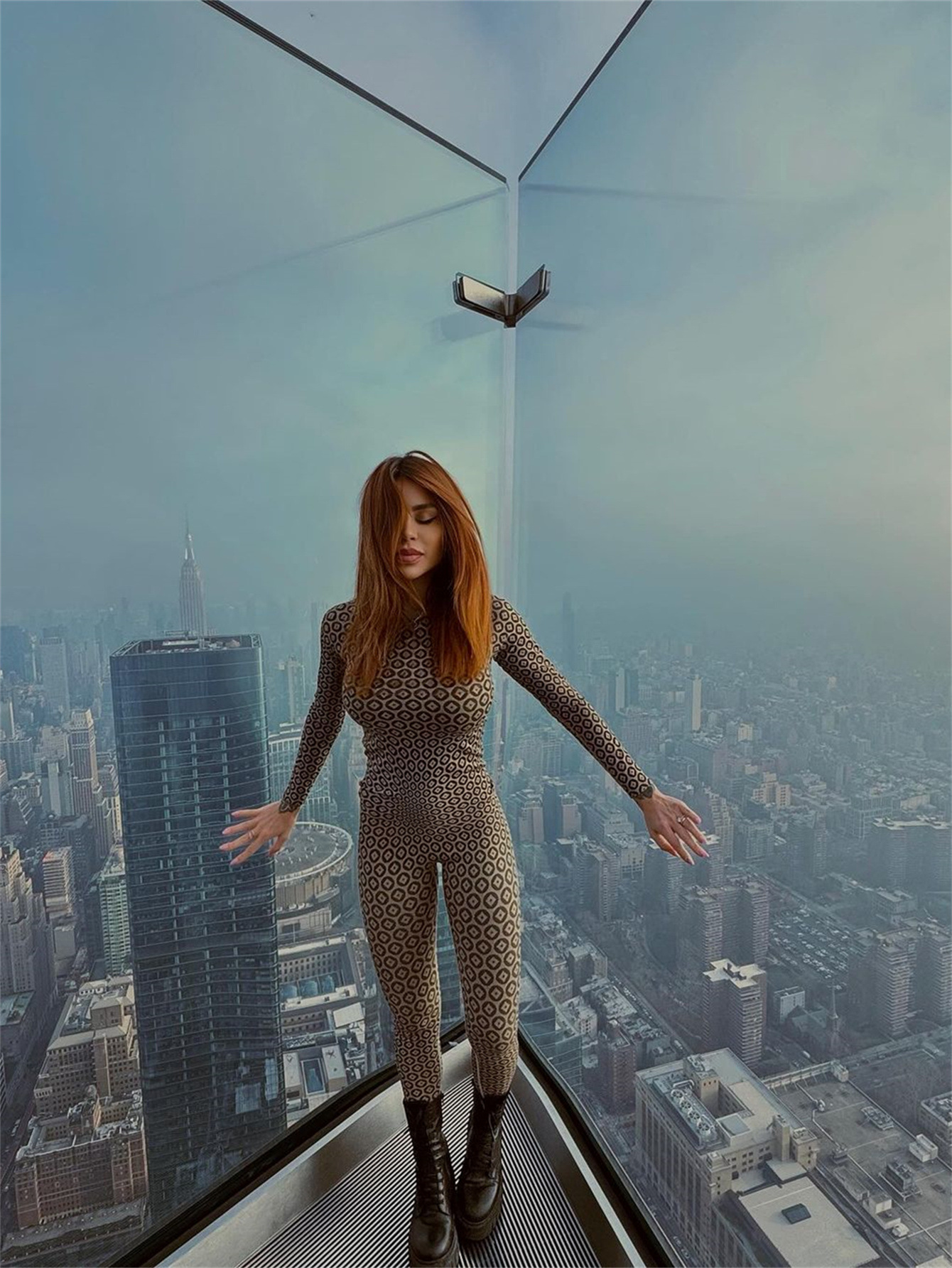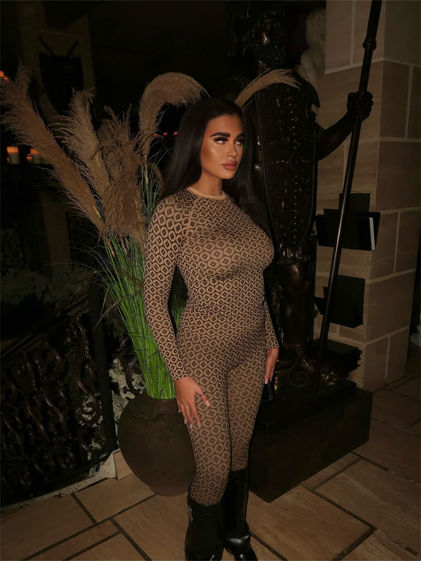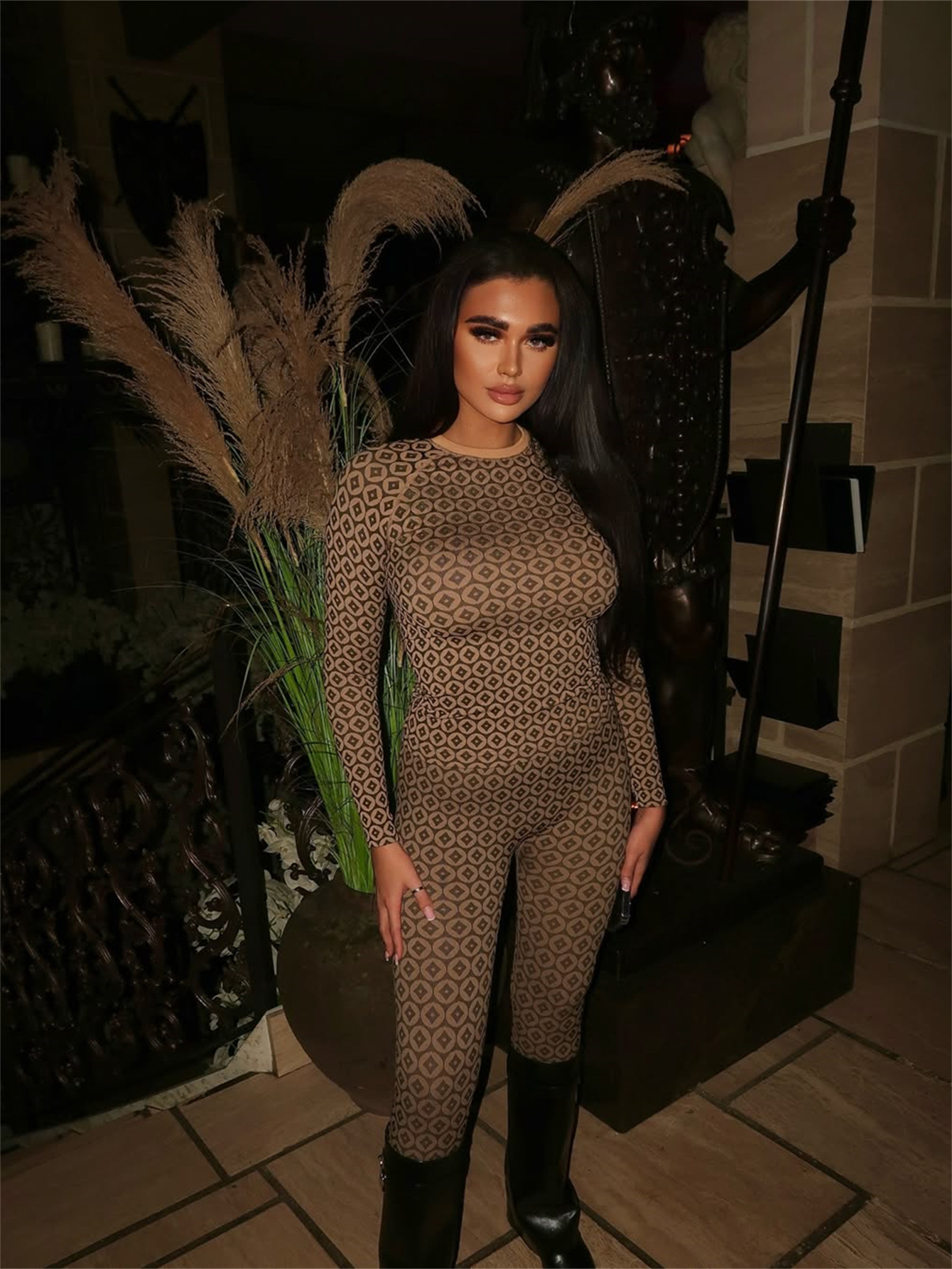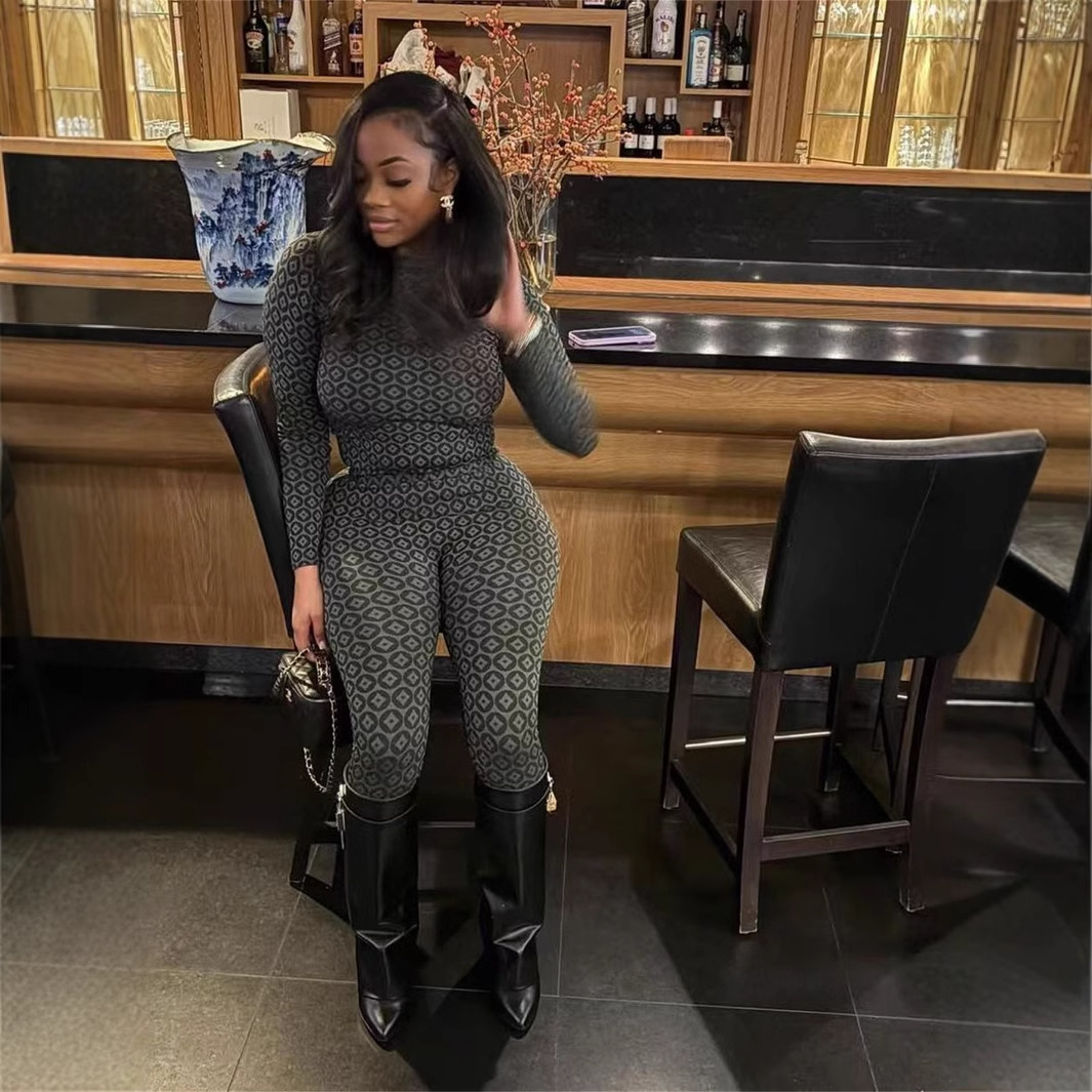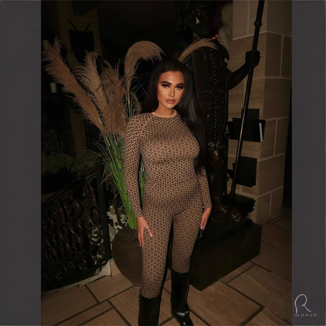 European And American Fashion Slim Elastic Printed Long-sleeved Round Neck Jumpsuit