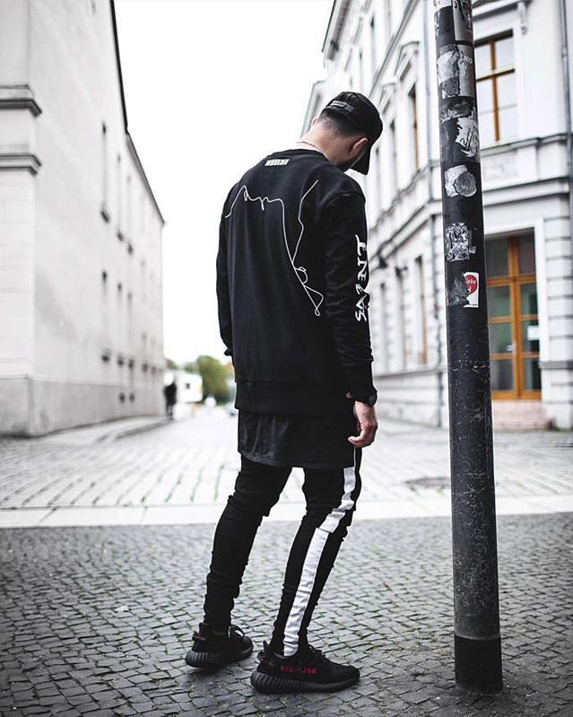 European and American high street trendy Kanye same side stripe BF new cut hole zipper hem slim leg pants jeans