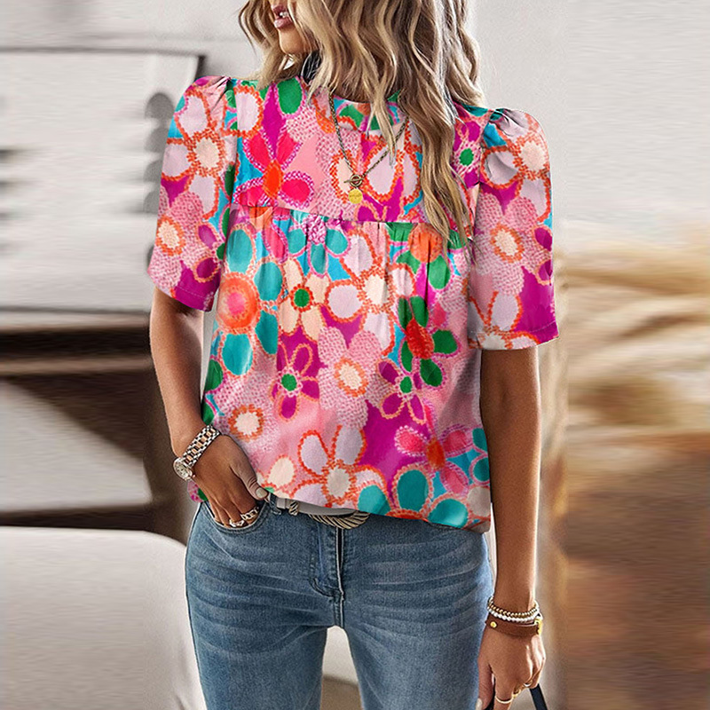 European And American Leisure Floral Print Puff Sleeve Top