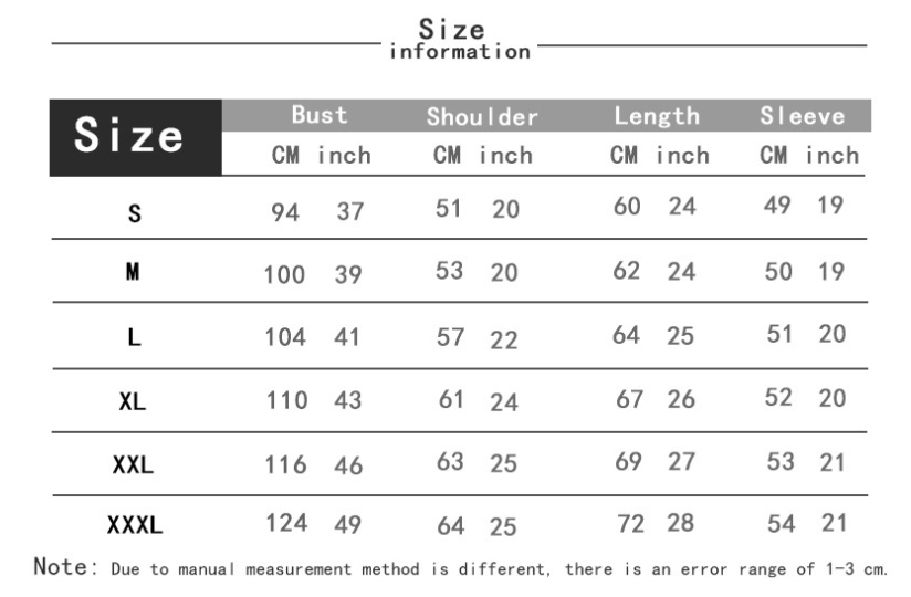 1. Asian sizes are 1 to 2 sizes smaller than European and American people. Choose the larger size if your size between two sizes. Please allow 2-3cm differences due to manual measurement. 2. Please check the size chart carefully before you buy the item, if you don't know how to choose size, please contact our customer service. 3.As you know, the different computers display colors differently, the color of the actual item may vary slightly from the following images.