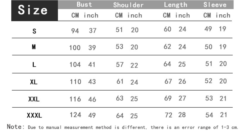 1. Asian sizes are 1 to 2 sizes smaller than European and American people. Choose the larger size if your size between two sizes. Please allow 2-3cm differences due to manual measurement. 2. Please check the size chart carefully before you buy the item, if you don't know how to choose size, please contact our customer service. 3.As you know, the different computers display colors differently, the color of the actual item may vary slightly from the following images.