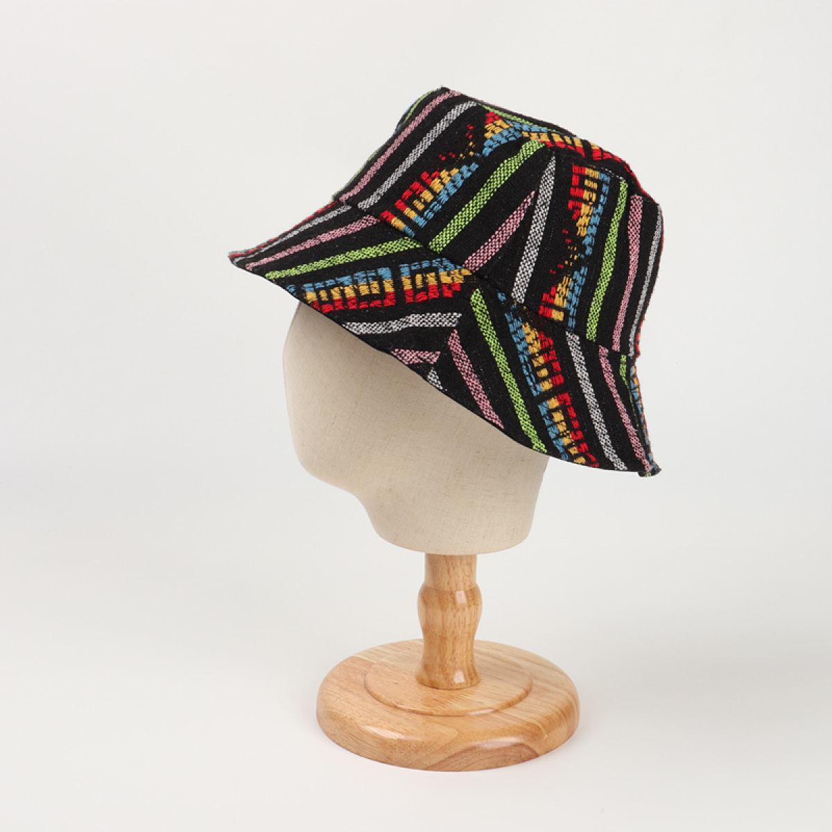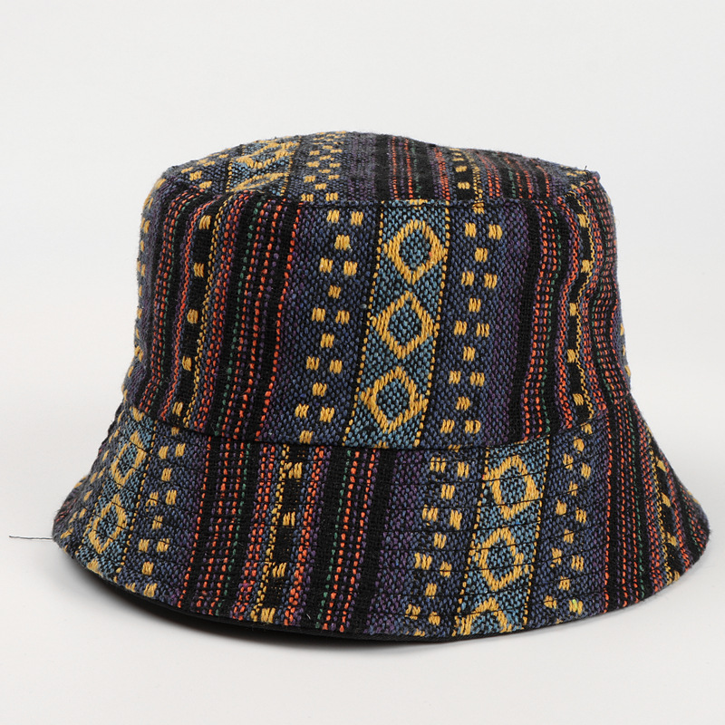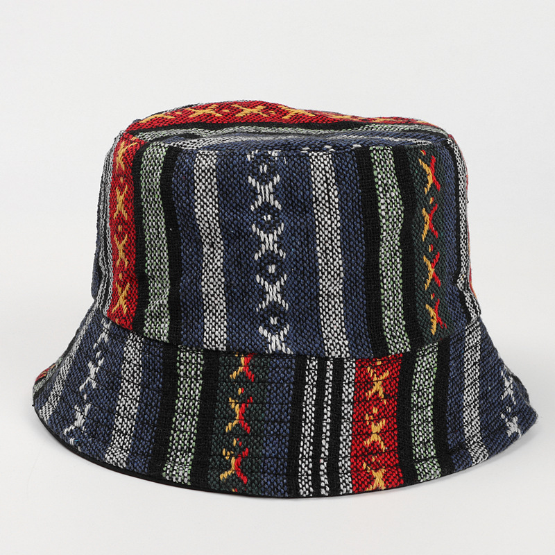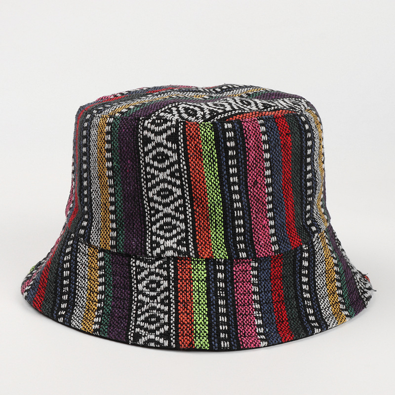 European And American Retro Color Ethnic Style Knitted Reversible Fisherman Hat Male And Female Stripes Diamond Canvas Casual Flat Top Bucket Hat