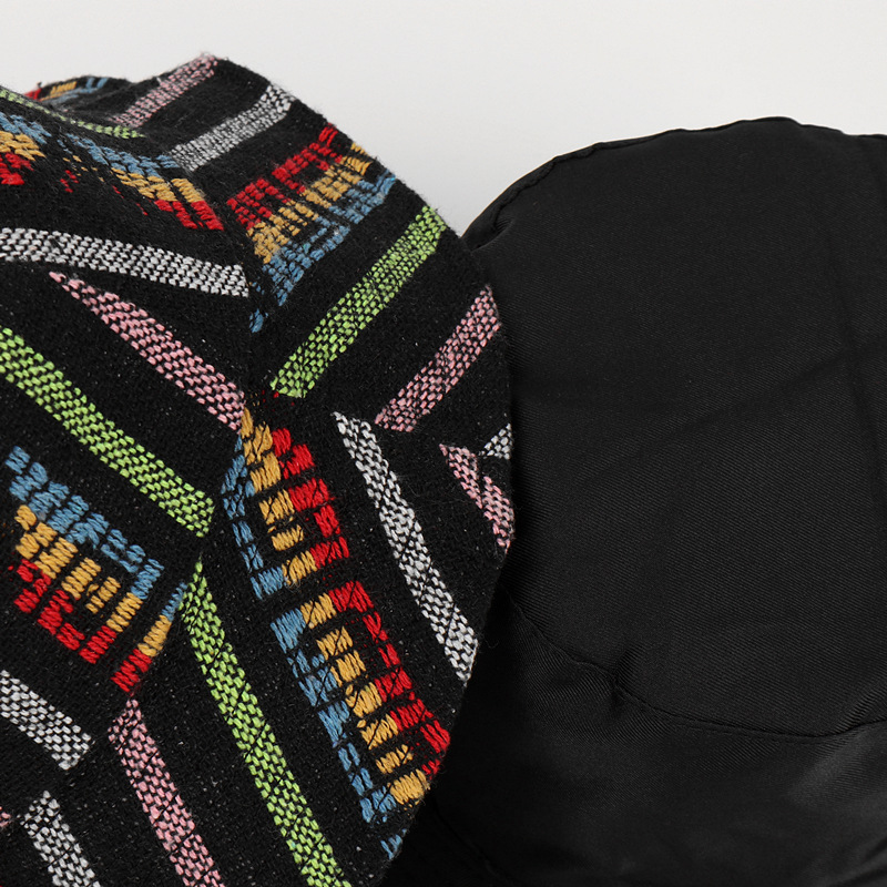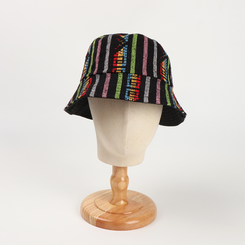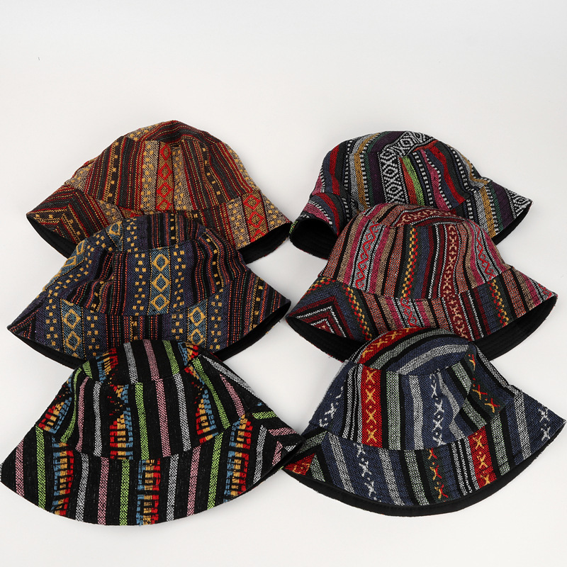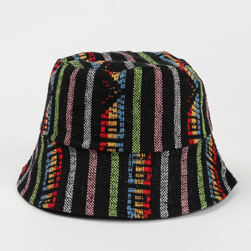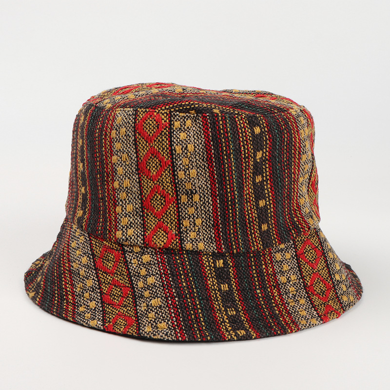 European And American Retro Color Ethnic Style Knitted Reversible Fisherman Hat Male And Female Stripes Diamond Canvas Casual Flat Top Bucket Hat