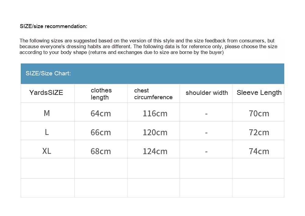 1. Asian sizes are 1 to 2 sizes smaller than European and American people. Choose the larger size if your size between two sizes. Please allow 2-3cm differences due to manual measurement. 2. Please check the size chart carefully before you buy the item, if you don't know how to choose size, please contact our customer service. 3.As you know, the different computers display colors differently, the color of the actual item may vary slightly from the following images.