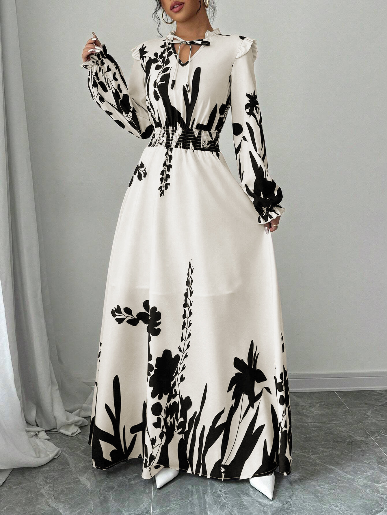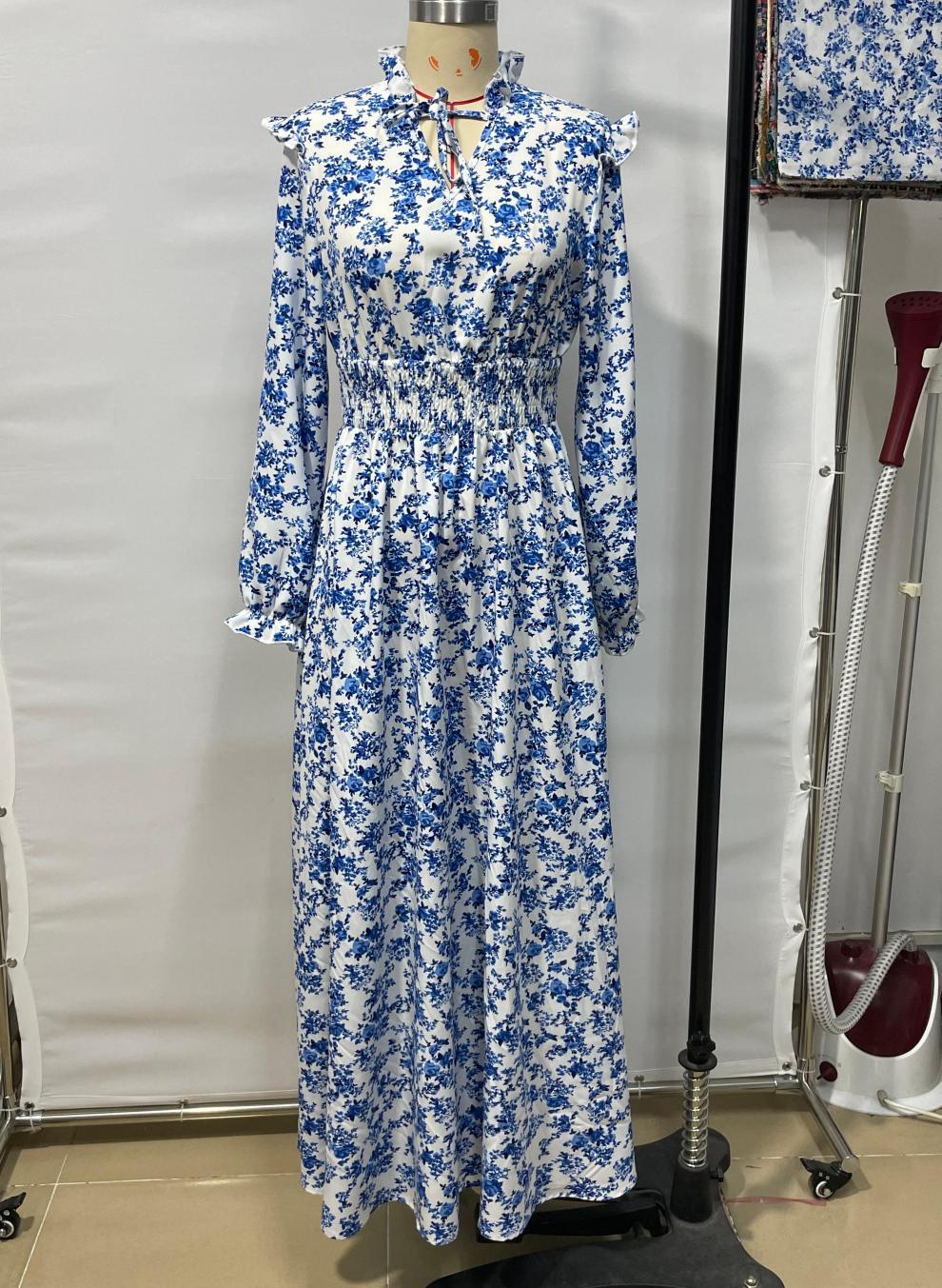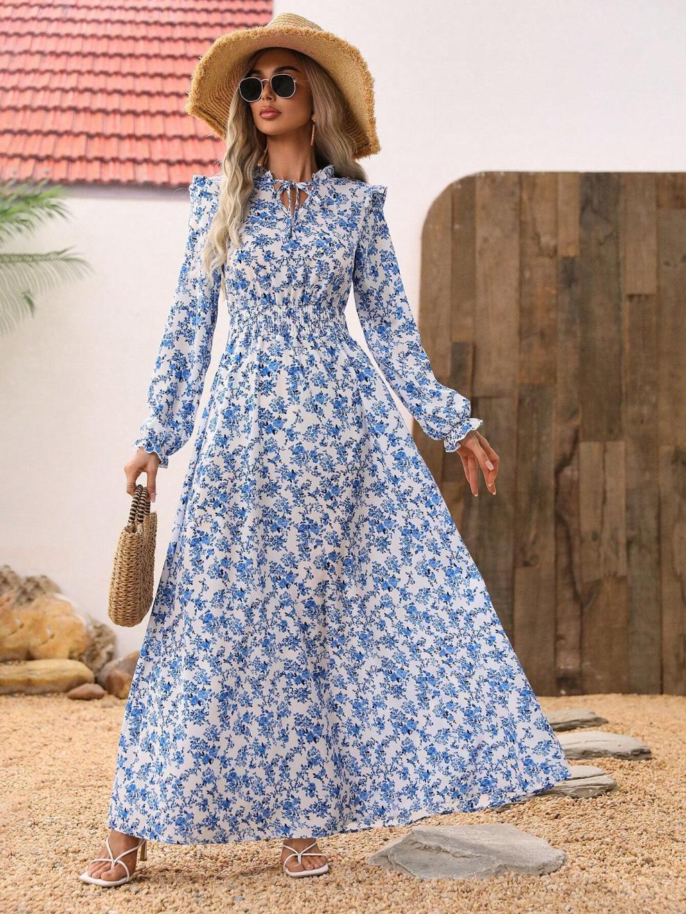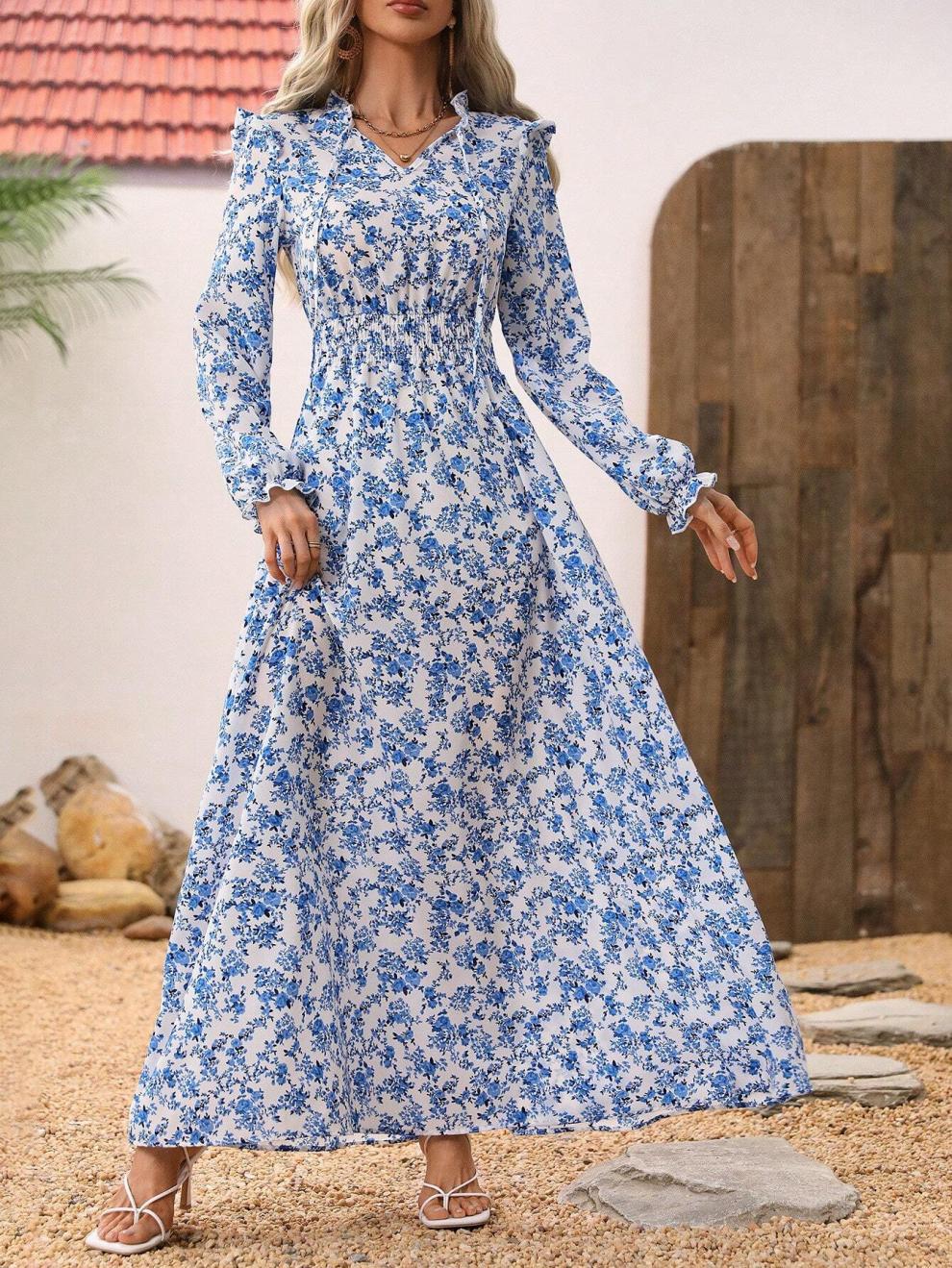 European And American-style Floral Print Long-sleeve Maxi Dress
