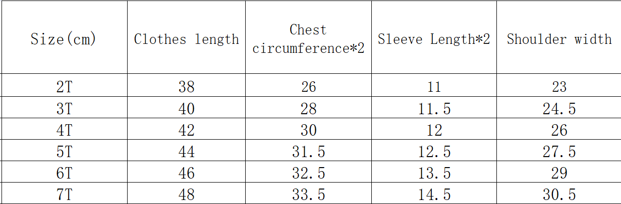 Suitable height: 2T(85-90cm), 3T(90-100CM), 4T(100-105CM), 5T(105-110CM), 6T(110-120CM), 7T(120-130CM)