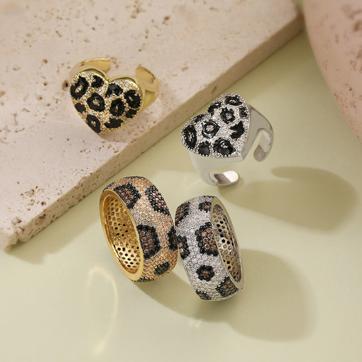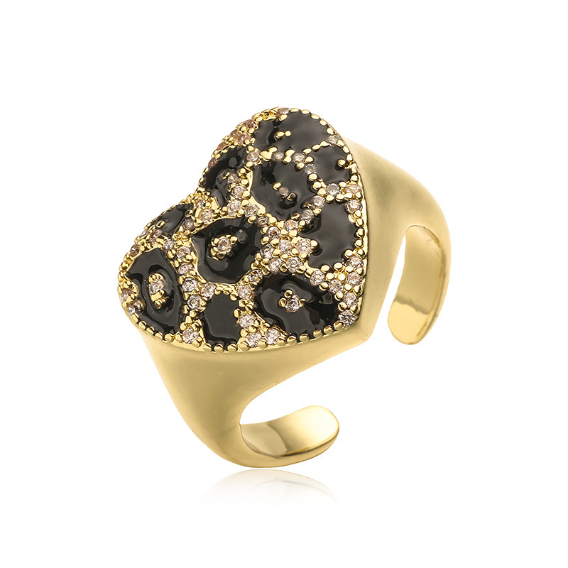 Colors: 1 gold leopard-print heart-shaped ring, 1 platinum leopard-print heart-shaped ring, 1 gold champagne-diamond round leopard-print ring (US size 7), 1 platinum champagne-diamond round leopard-print ring (US size 7), 1 gold champagne-diamond round leopard-print ring (US size 8), 1 platinum champagne-diamond round leopard-print ring (US size 8)