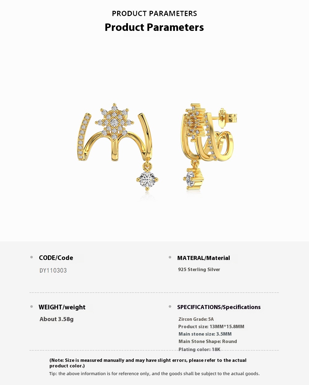 Color: Platinum DY110303-S-W-WH, gold DY110303-S-G-WH