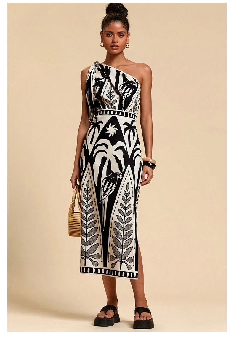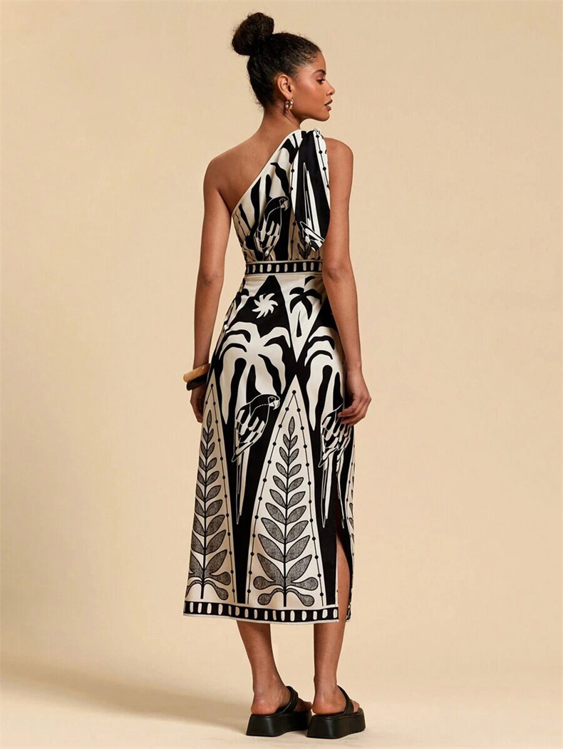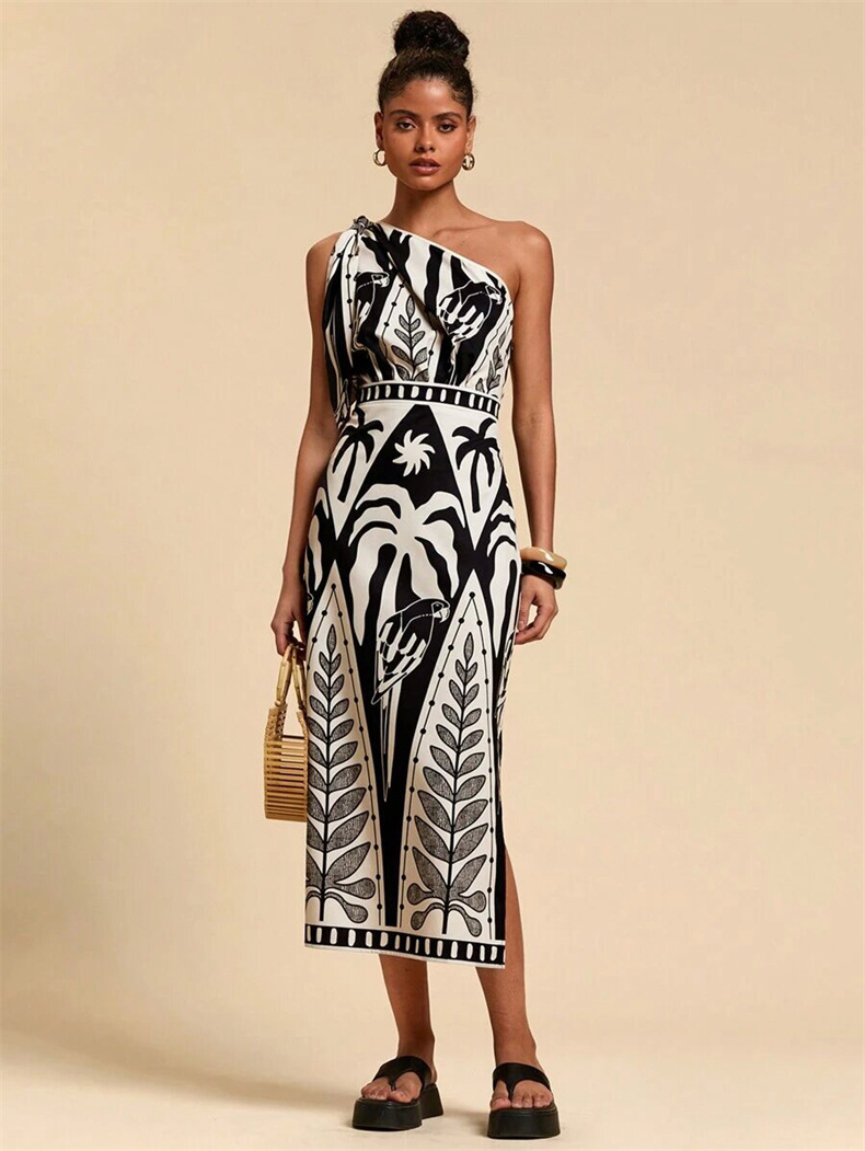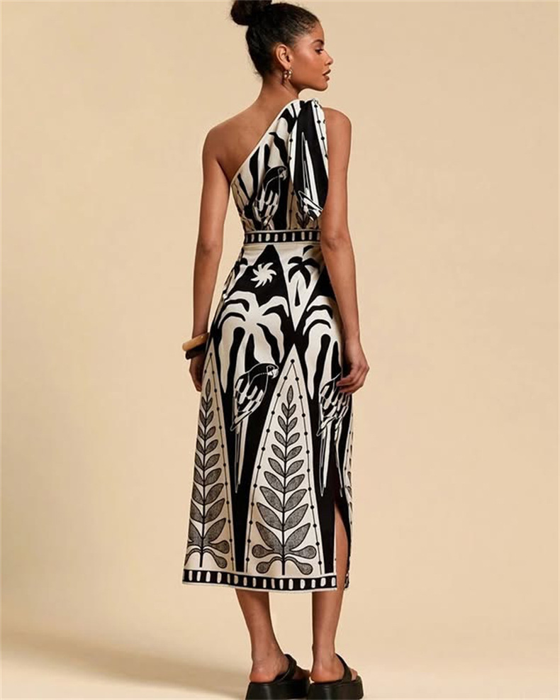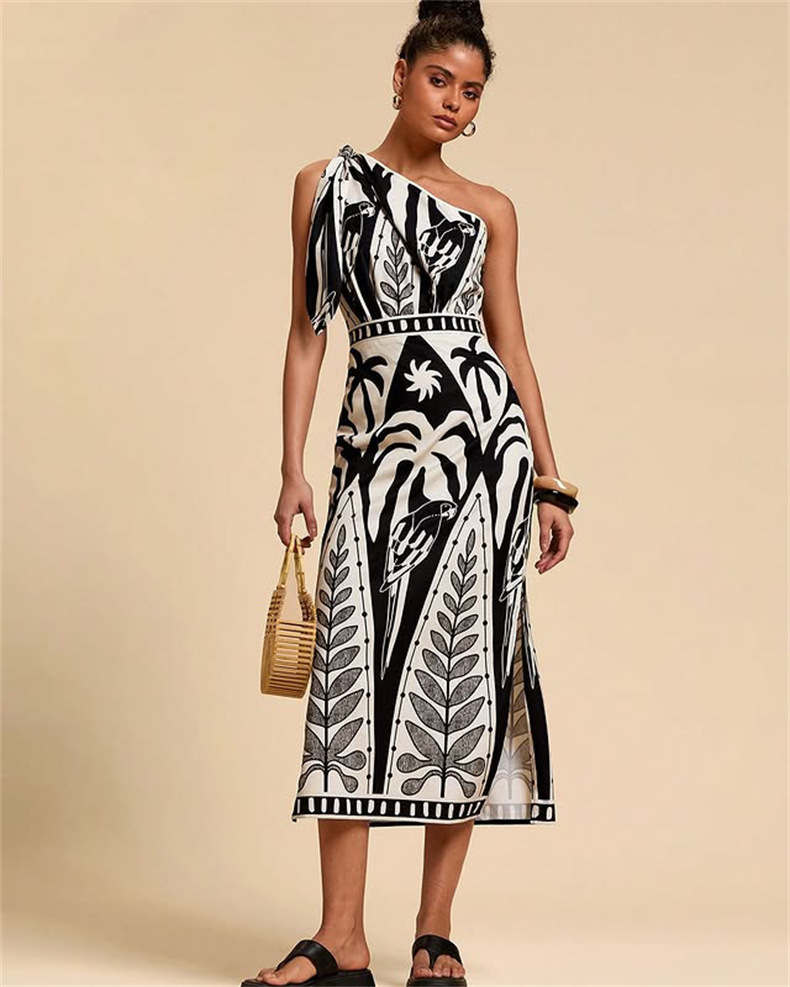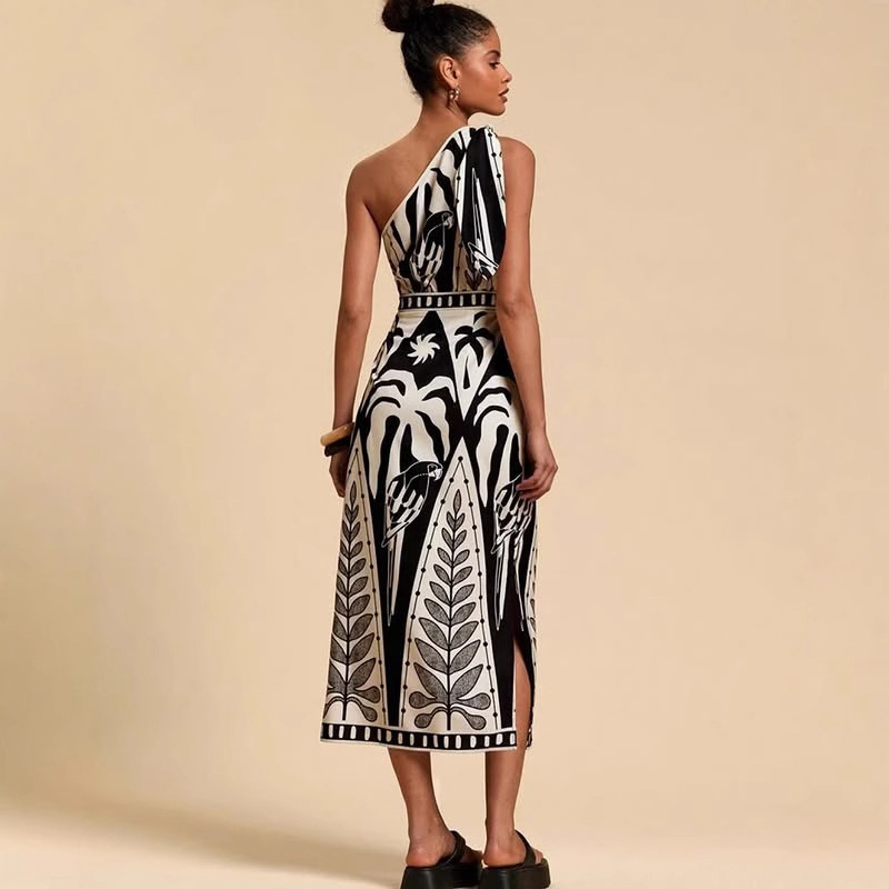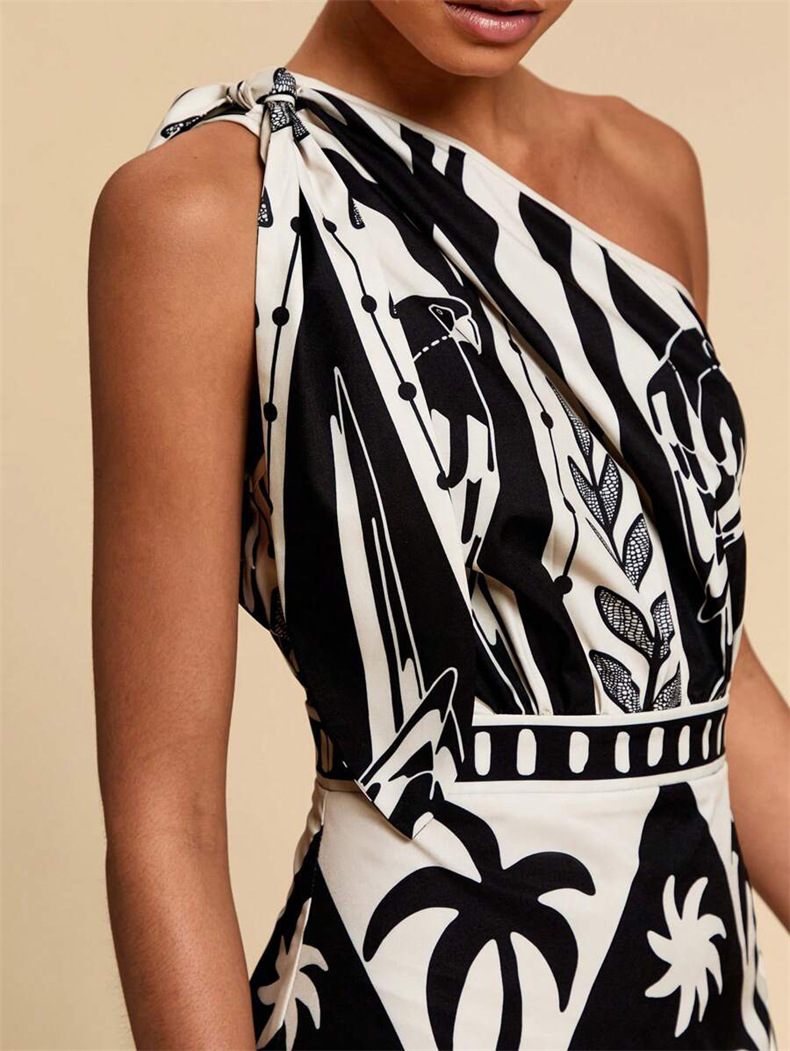 European And American-style Sexy Fashion Digital Lace-up Off-shoulder Slip Dress