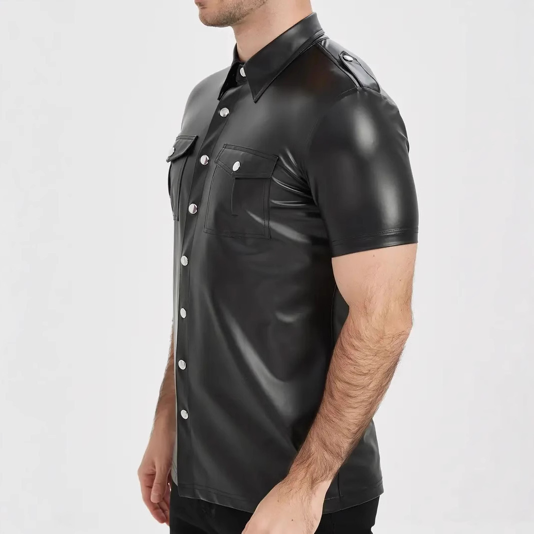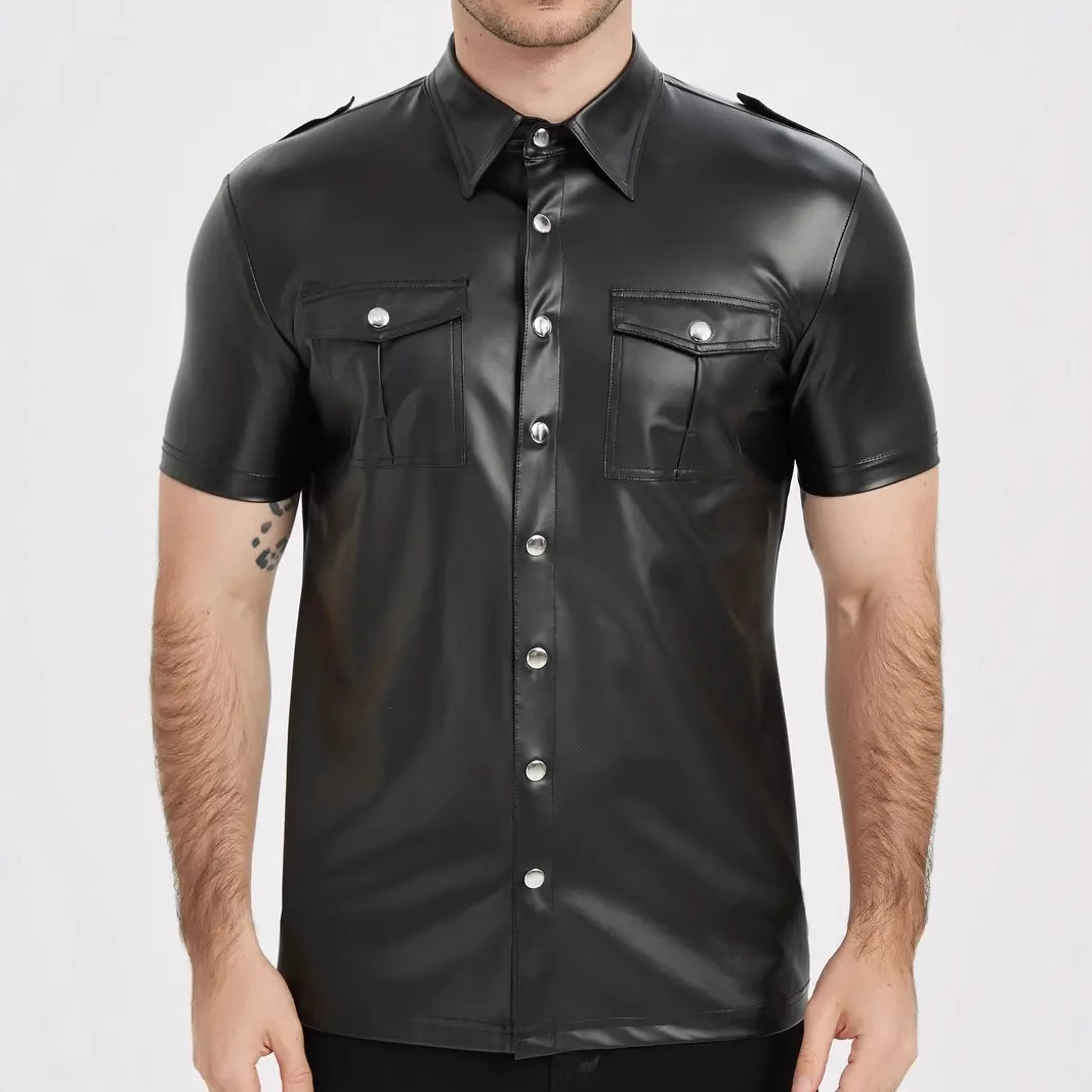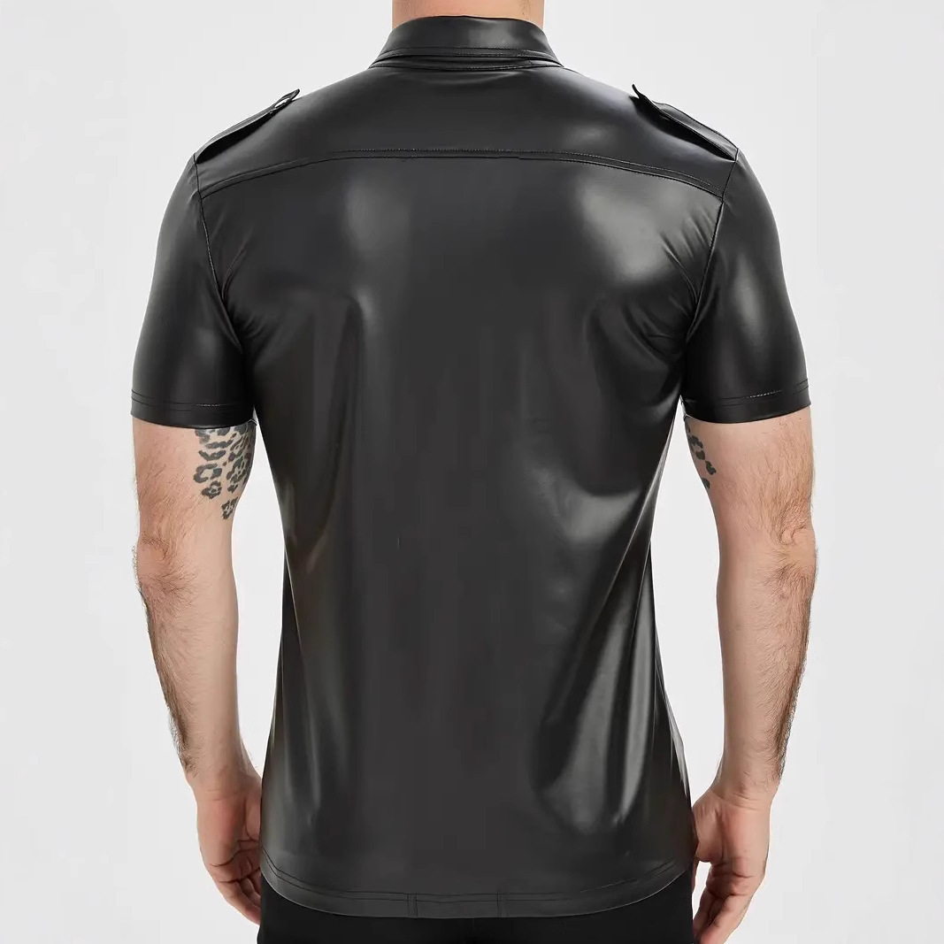 European And American-style Summer Casual Mens Patent Leather Tight-fitting Short-sleeve Top