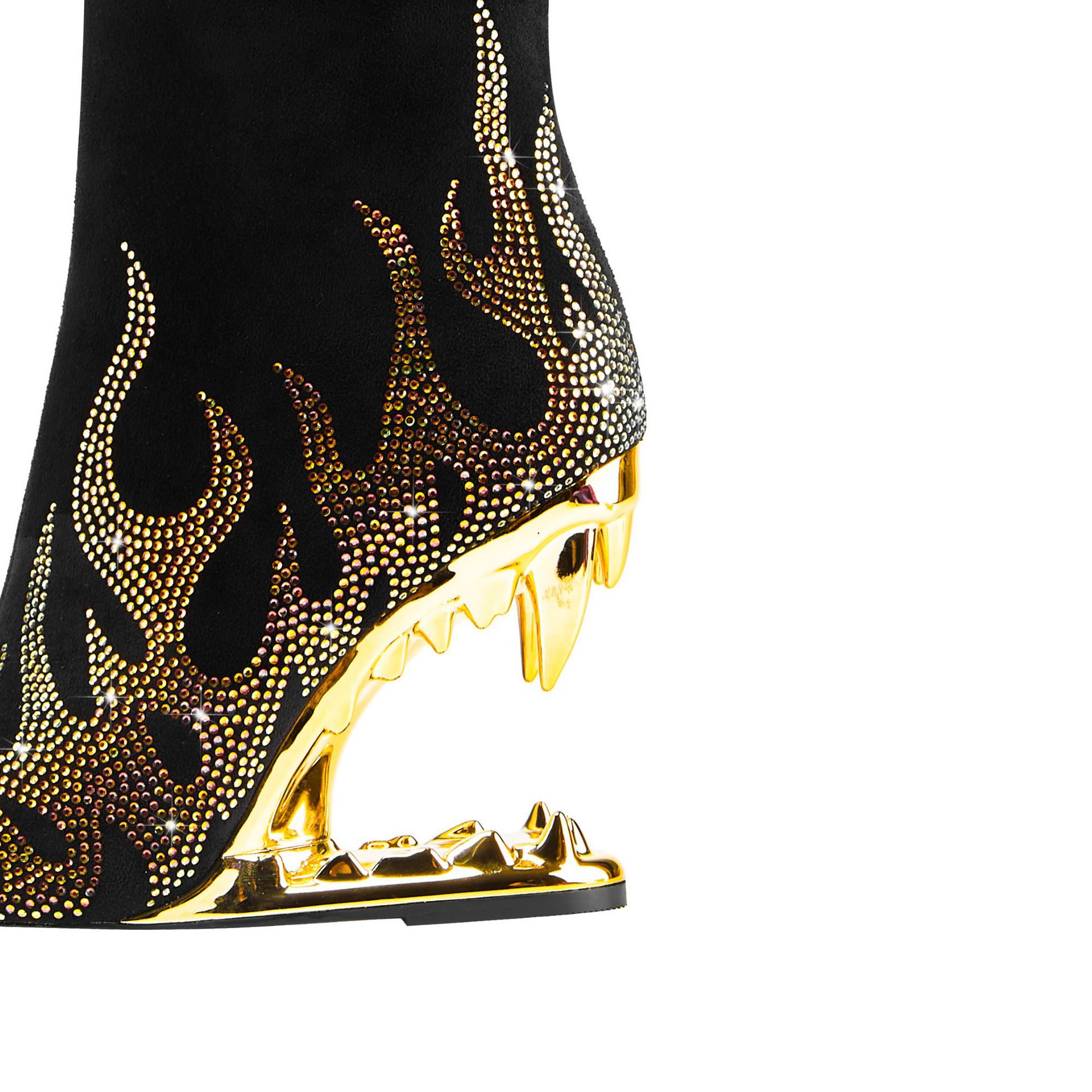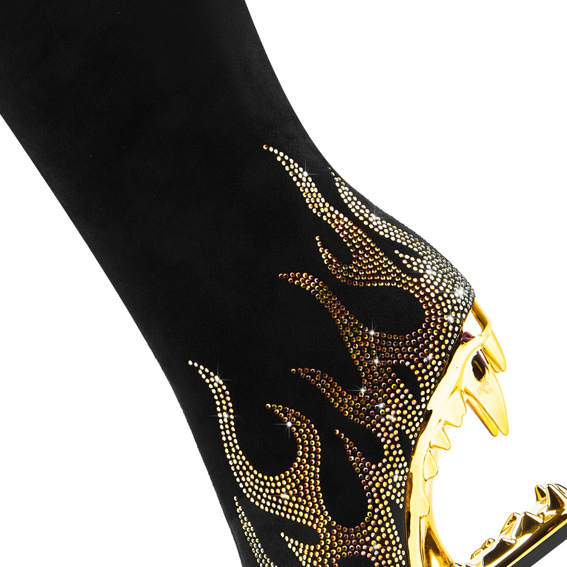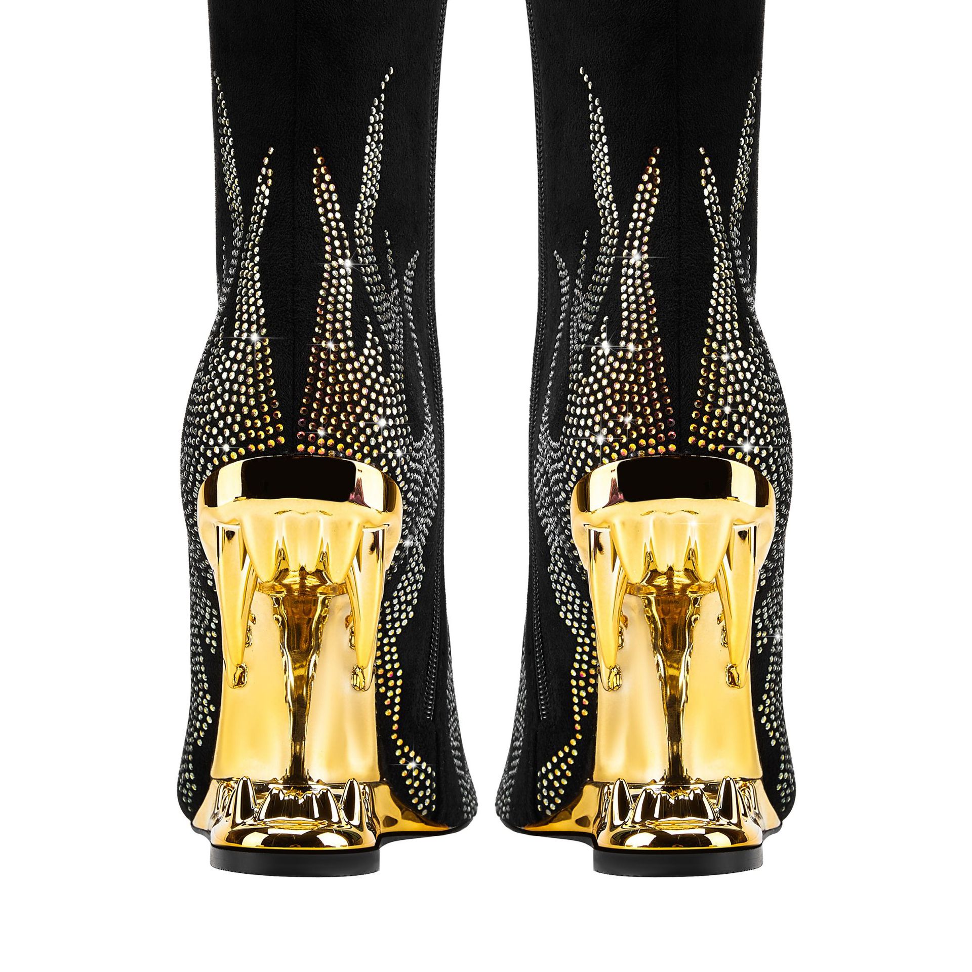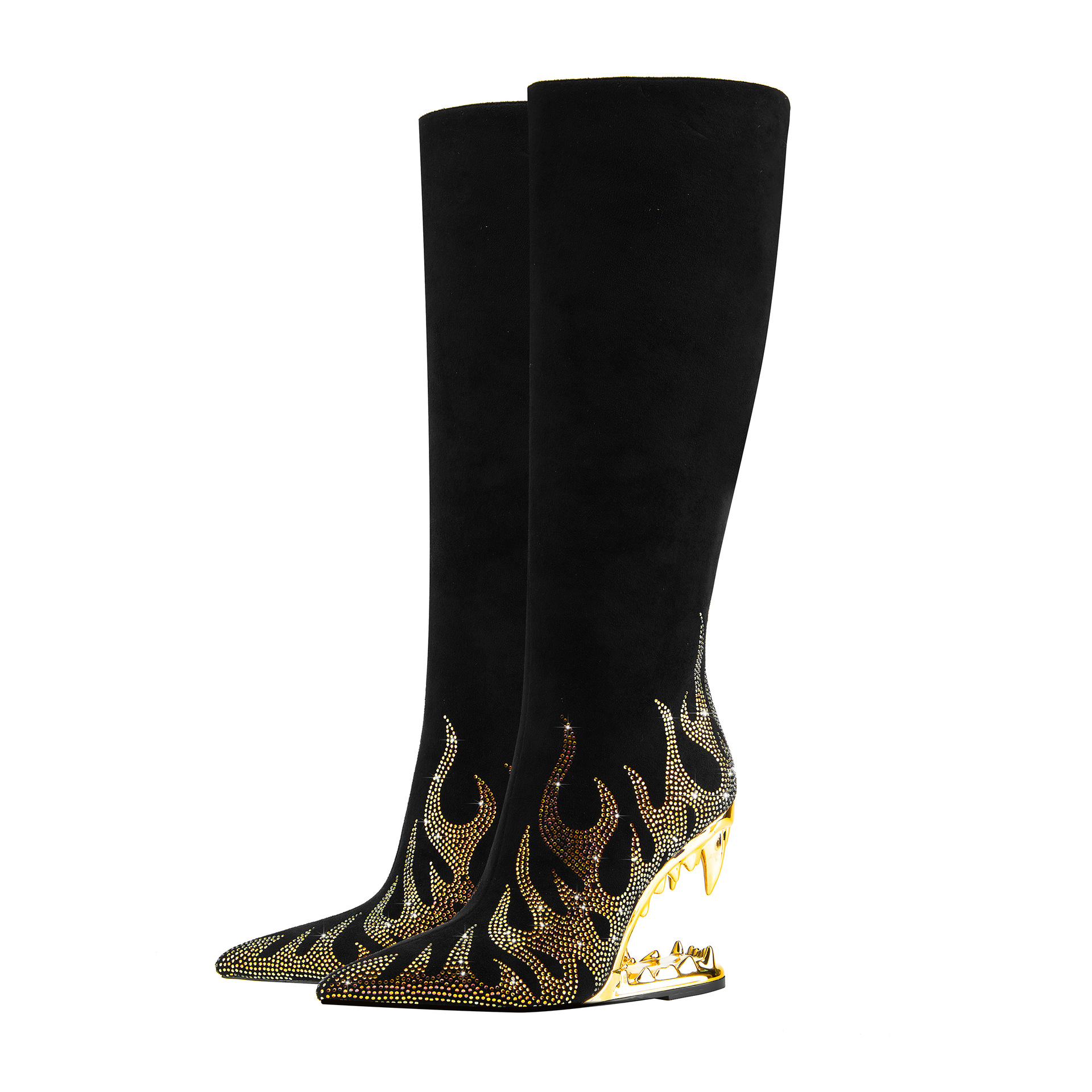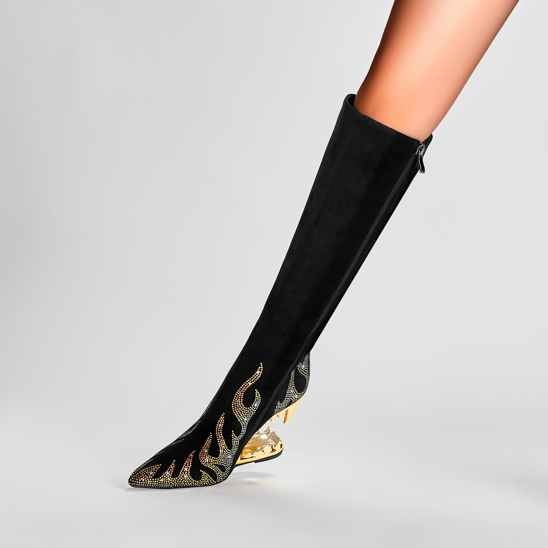 European And American Style Tiger Tooth Profiled Heel Skinny Stretch Boots Rhinestone Flame