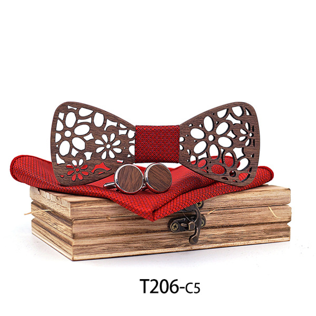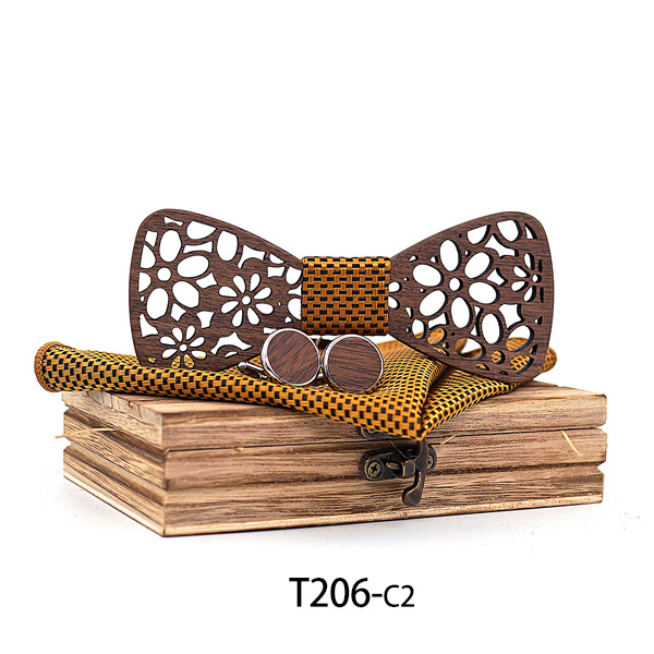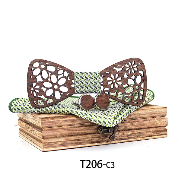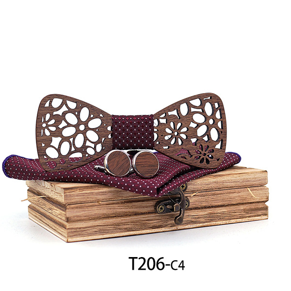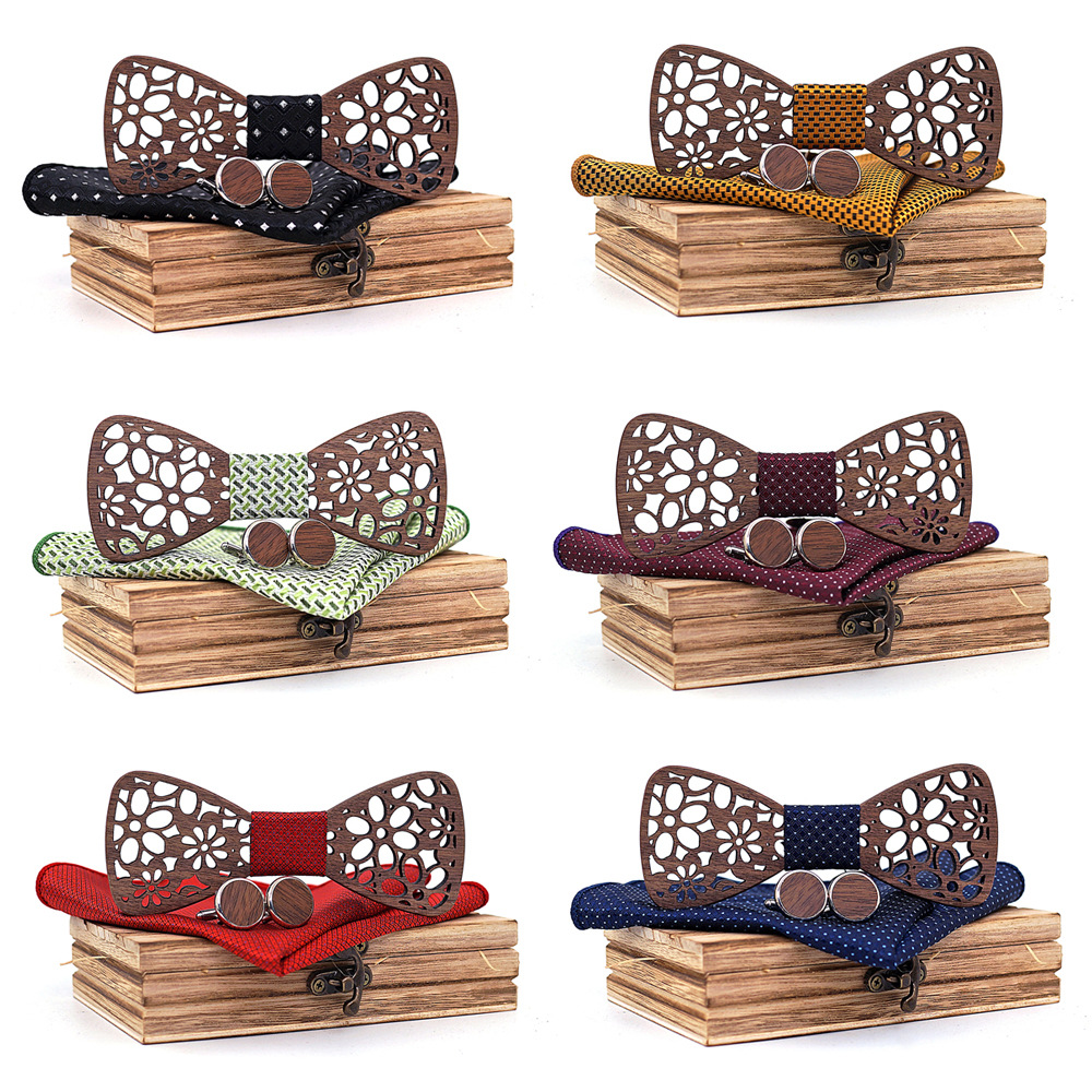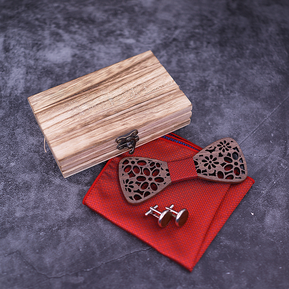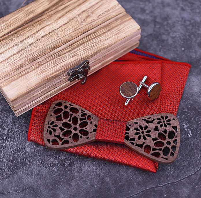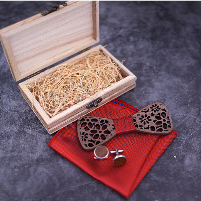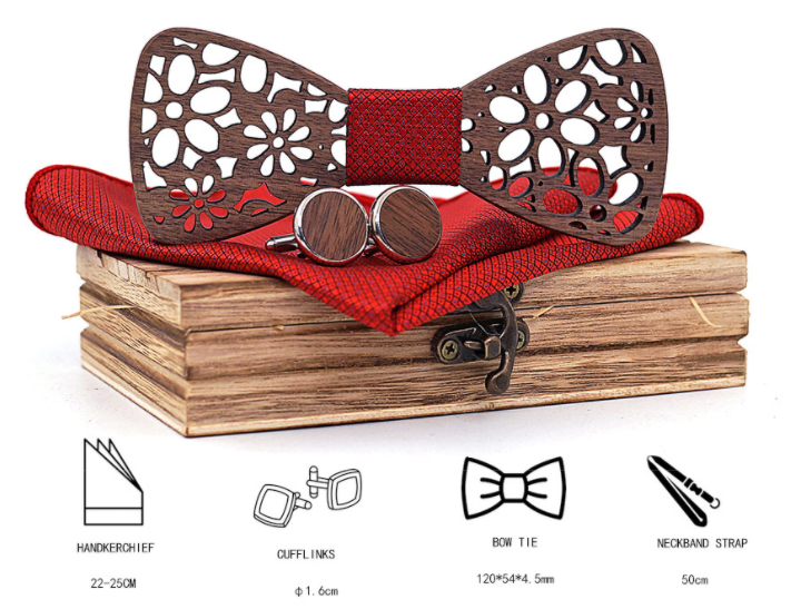 Set: bow tie x1, cufflinks x1, square scarf x1, wooden box x1