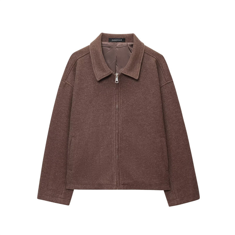 European And American Women's Clothing Brown Polo Collar Jacket Zipper Woolen Coat